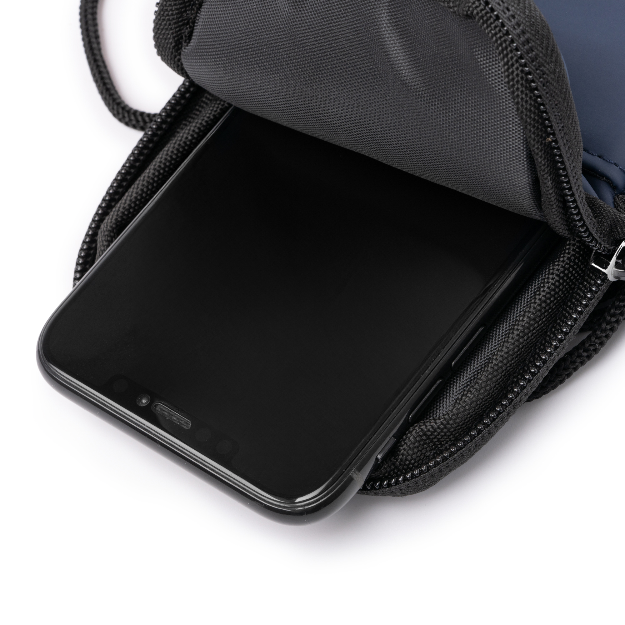 Suport din piele PU pentru telefon mobil. Compartiment principal cu închidere cu fermoar. Buzunar extern și curea de transport reglabilă.
