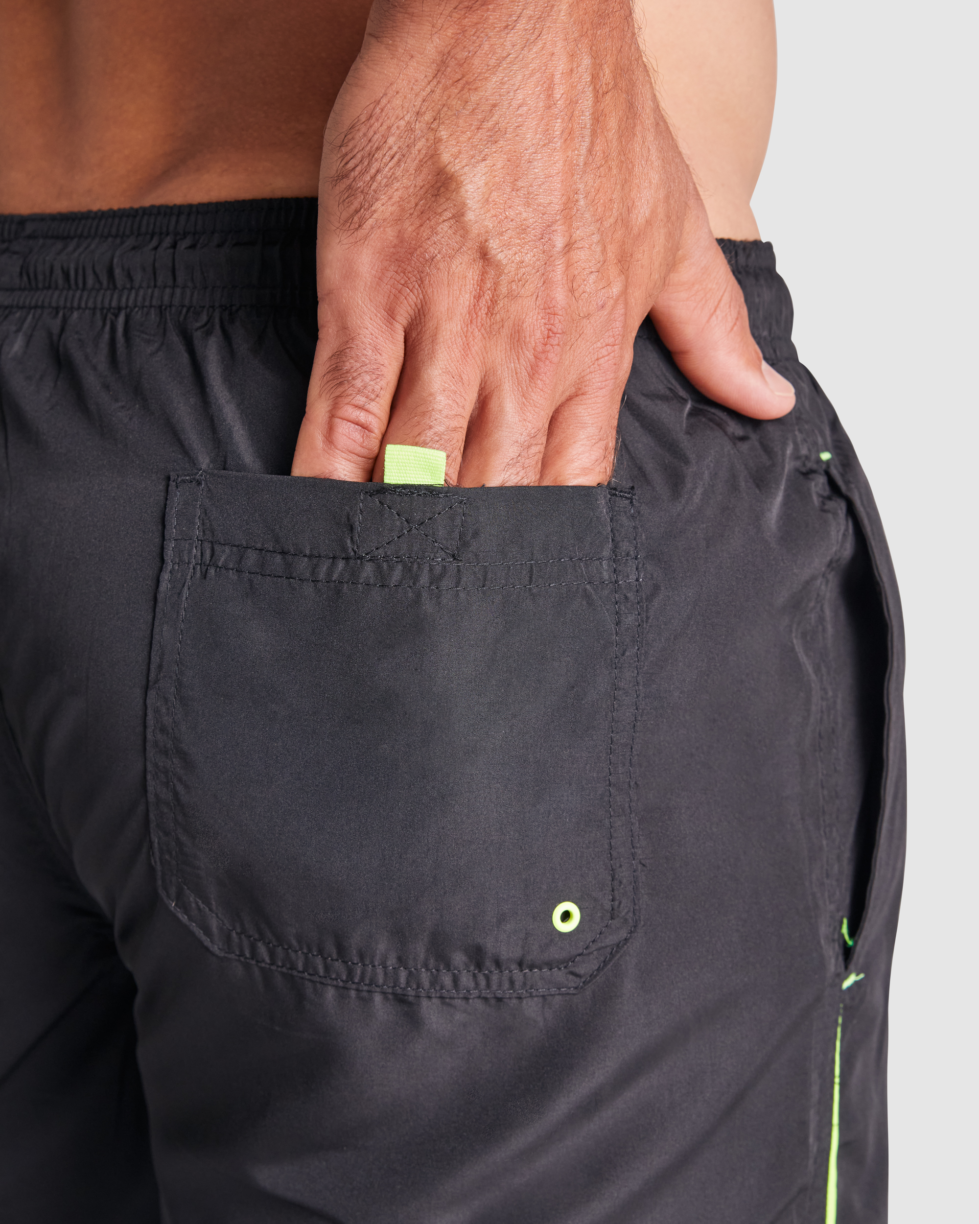 Pantaloni scurți de înot cu buzunare laterale. Căptușeală din plasă. Ochiuri, detalii și inserții laterale tip piping în culori contrastante. Banda elastică în talie, cu șnur decorativ și ajustabil.