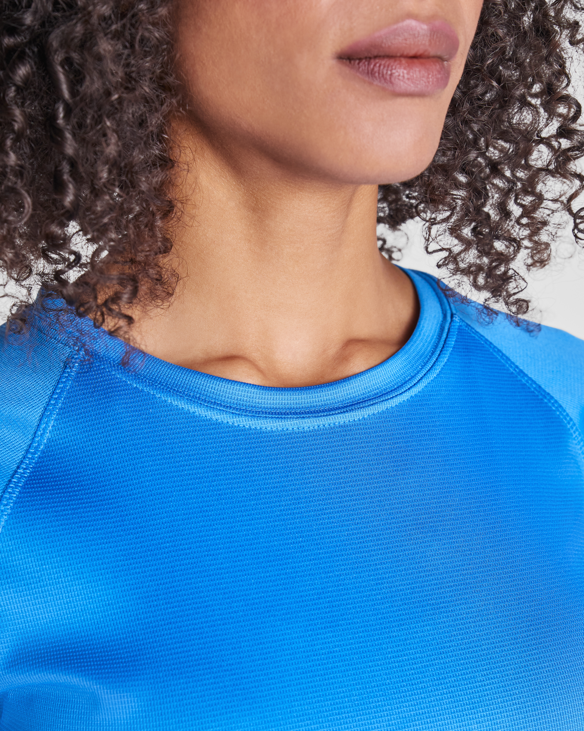 Tricou tehnic respirabil, croială mulată și mâneci raglan. Roly Control Dry – tehnologie pentru uscare rapidă și control al umidității. Panouri în zona brațelor. Guler rotund și bandă interioară asortate cromatic (certificate UV).