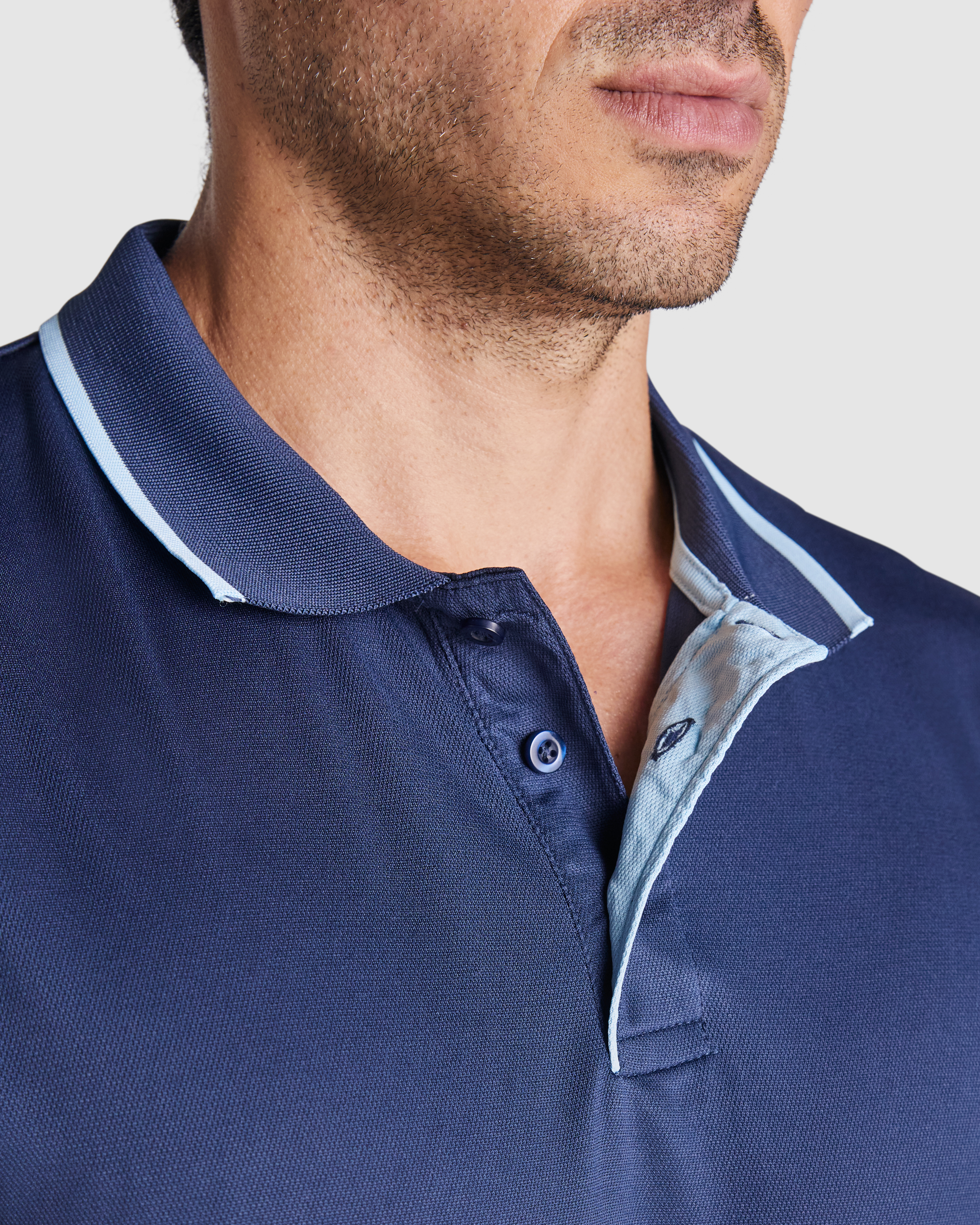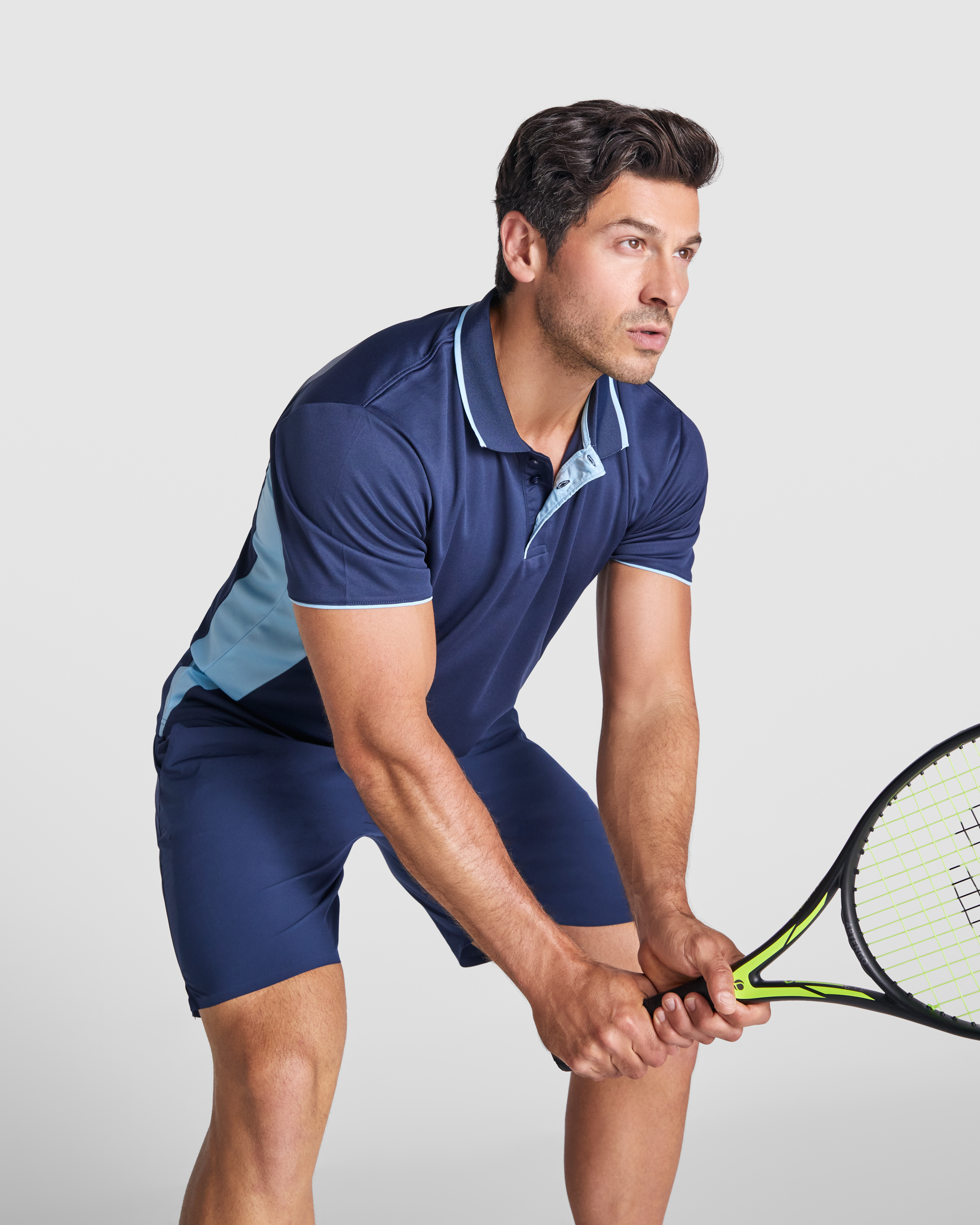 Tricou polo tehnic, respirabil, cu mânecă scurtă, în două culori. Panouri laterale și sub brațe. Guler și manșete cu nervuri 1×1 în aceeași nuanță, cu detalii contrastante. Căptușeală pentru braț din material asortat. Bandă de închidere cu 3 nasturi. Bandă de întărire la guler, din materialul de bază, într-o nuanță contrastantă. Certificat UV.