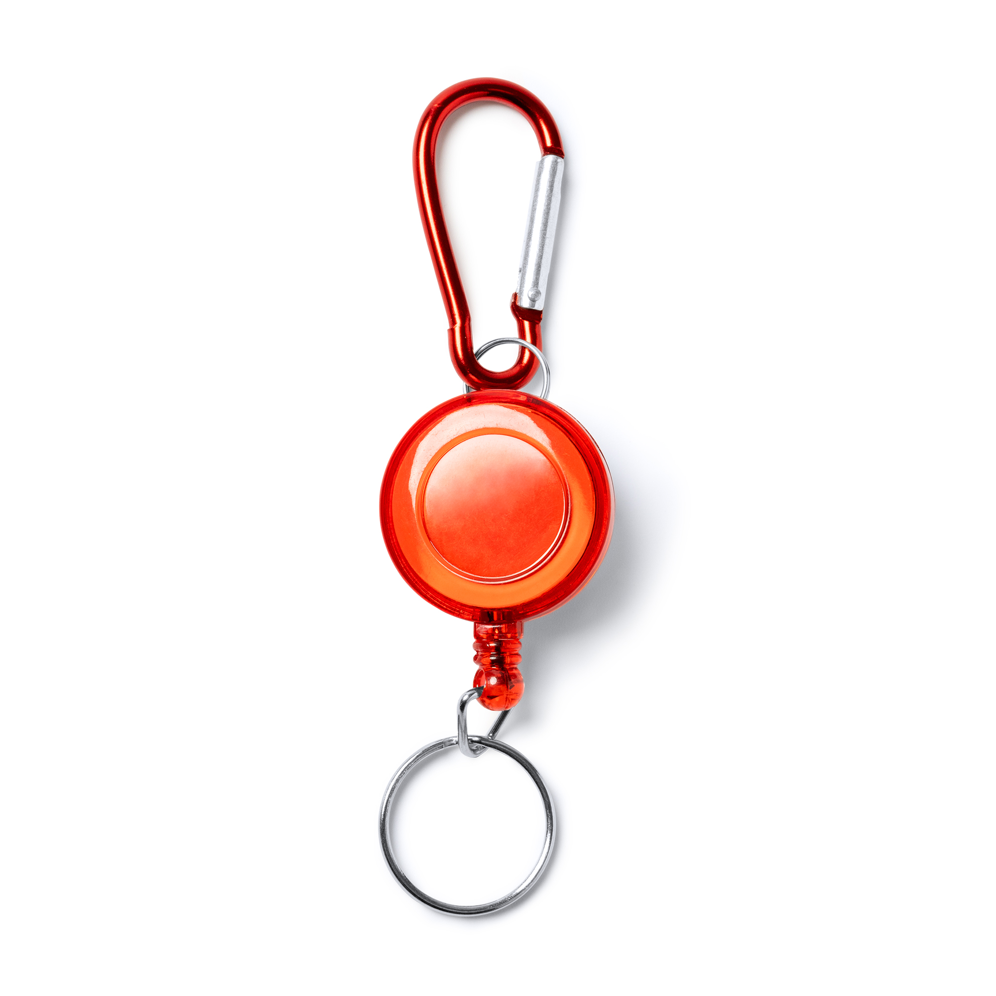 Breloc cu clemă de fixare cu carabină și inel retractabil.