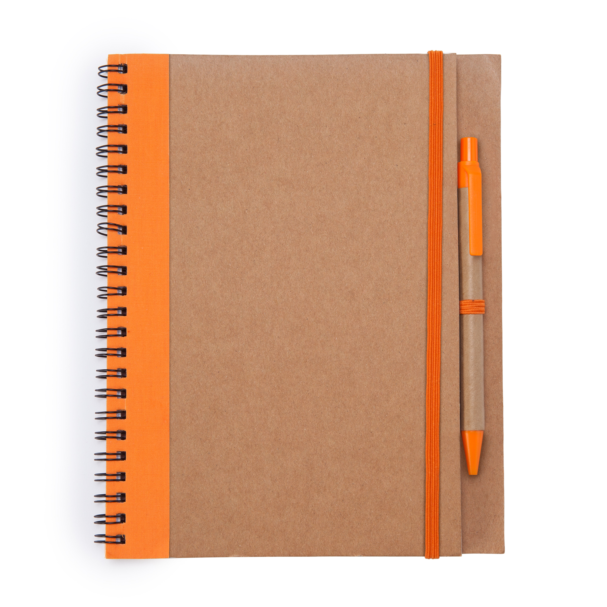 Caiet cu spirală și copertă din carton reciclat. Include pix cu mină albastră. 60 de foi.