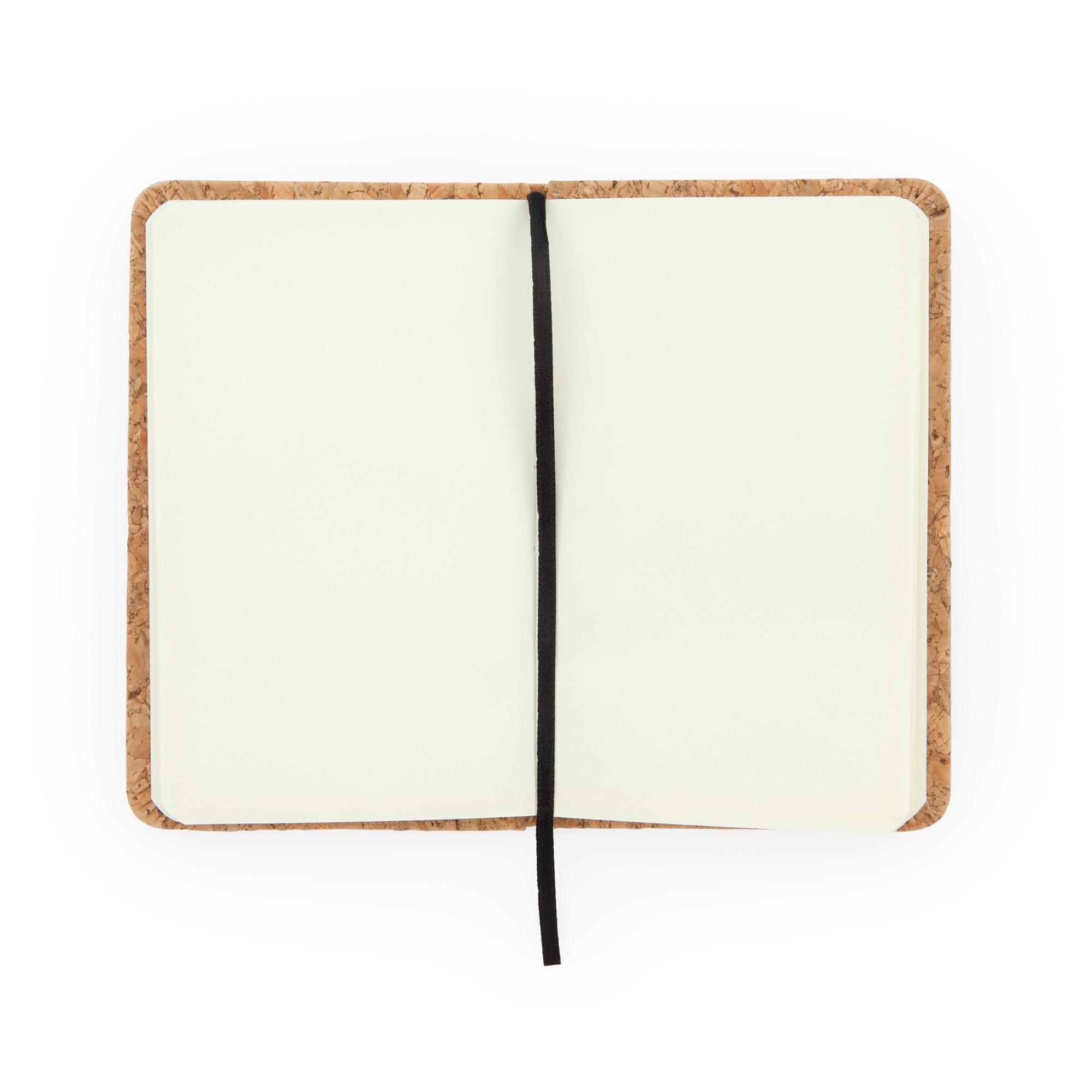 Blocnotes A6. Copertă rigidă din plută naturală. Bookmark și bandă elastică. 80 de foi.