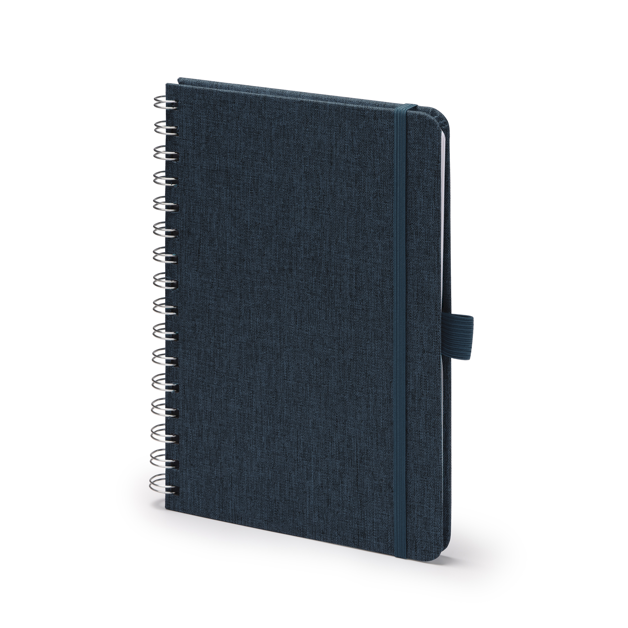 Caiet A5 cu copertă rigidă realizată din țesătură reciclată din poliester RPET și spirală dublă. Include închidere cu bandă elastică și suport pentru pixuri asortat cu coperta. Conține 80 de foi liniate, perfect pentru notițe organizate și ecologice.