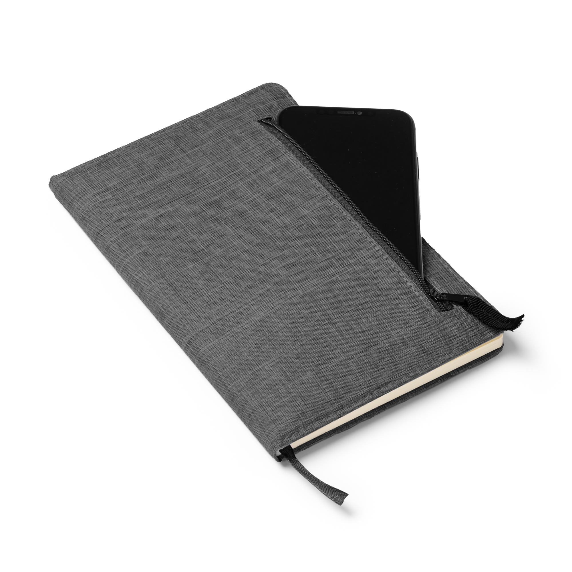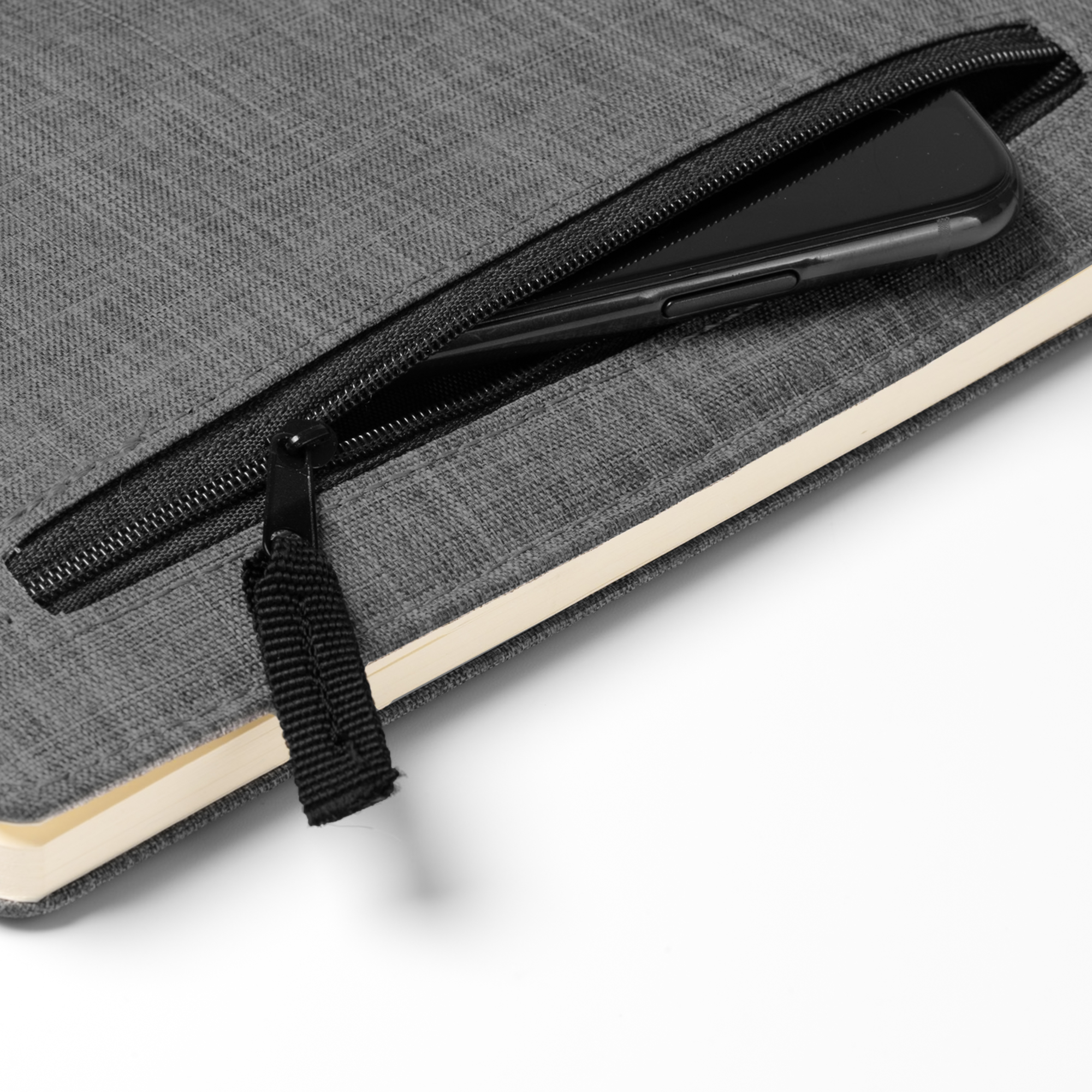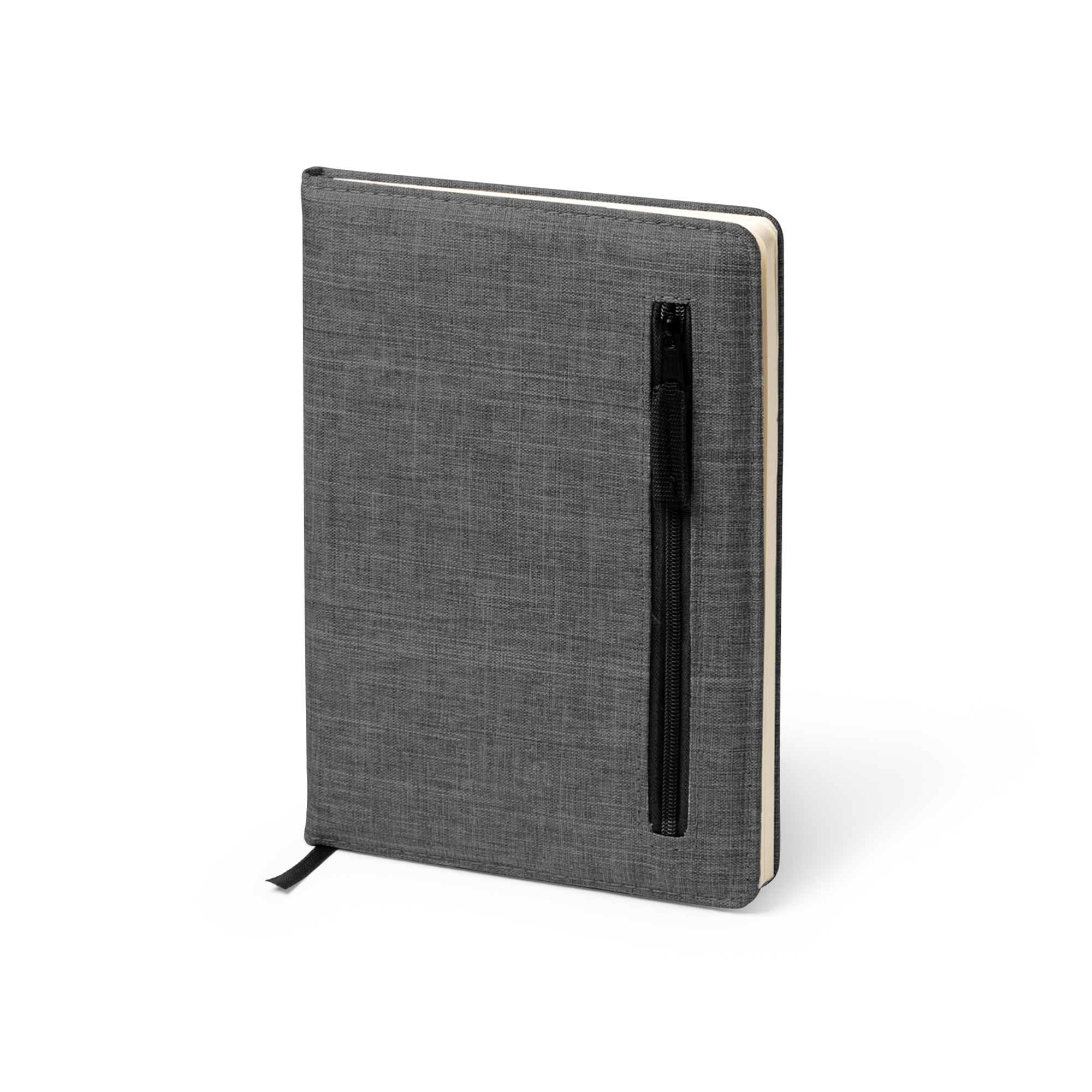 Agendă A5 fabricată din RPET. Buzunar exterior cu închidere cu fermoar. Include marcaj. 80 foi liniate.