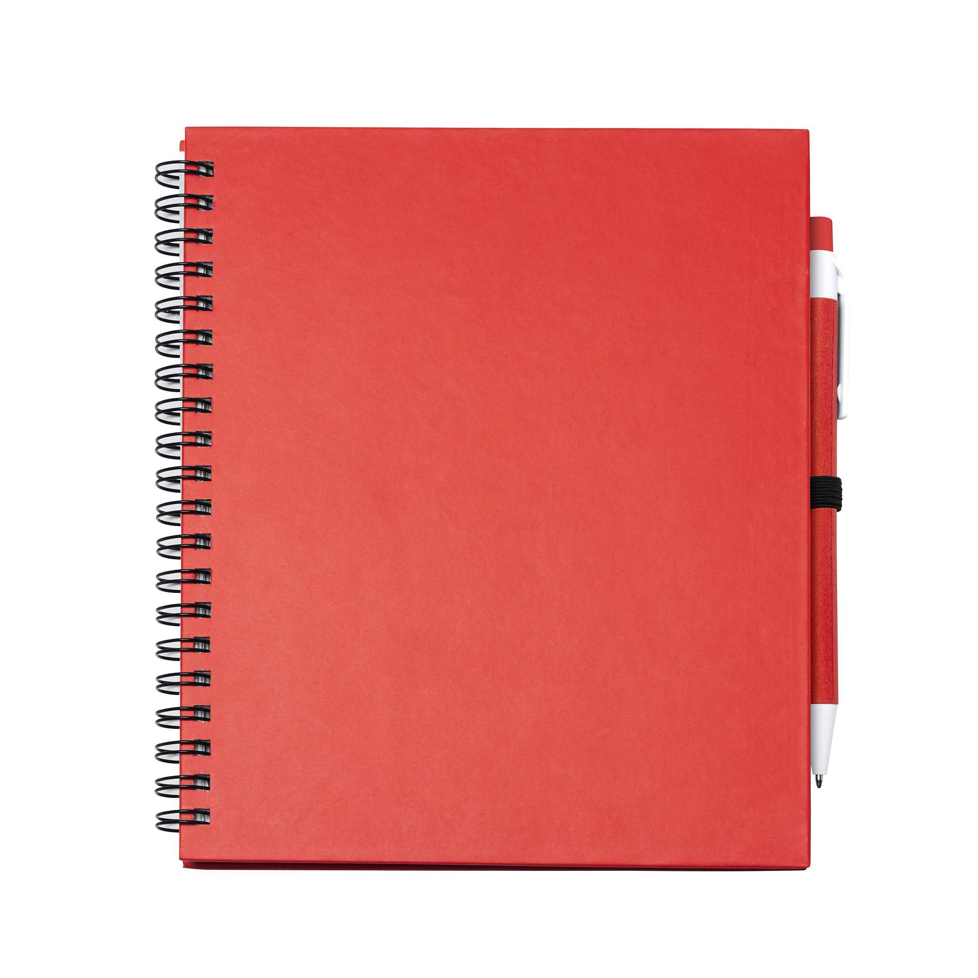Notebook cu inel spiralat cu foi goale și suport pentru stilou. Copertă rigidă și stilou din carton reciclat asortat. 70 de foi.