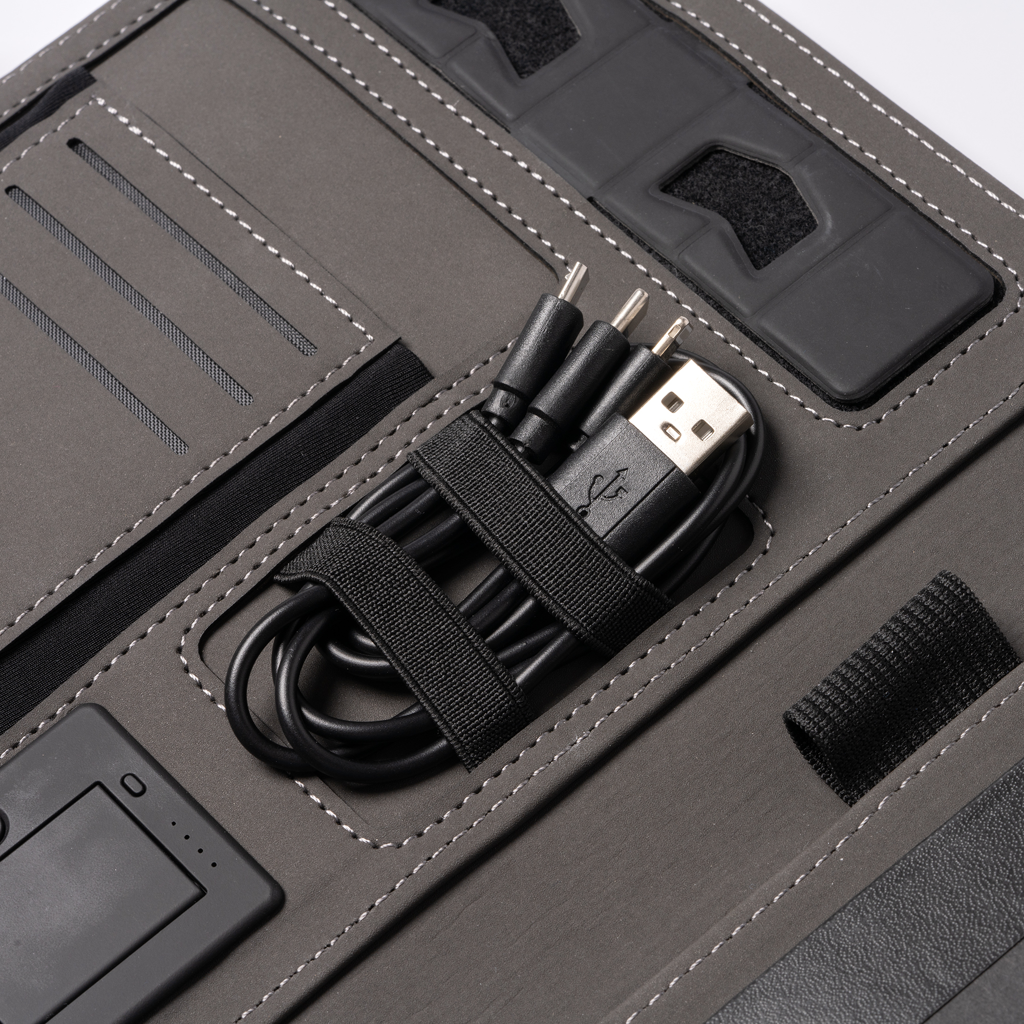 De asemenea, mapa include un suport pentru stilou, asigurându-vă că aveți întotdeauna unul la îndemână atunci când aveți nevoie. În plus, este inclus un cablu cu 3 intrări (ieșire tip C și USB), care vă permite să încărcați diferite dispozitive și să asigurați compatibilitatea cu diverse dispozitive electronice.