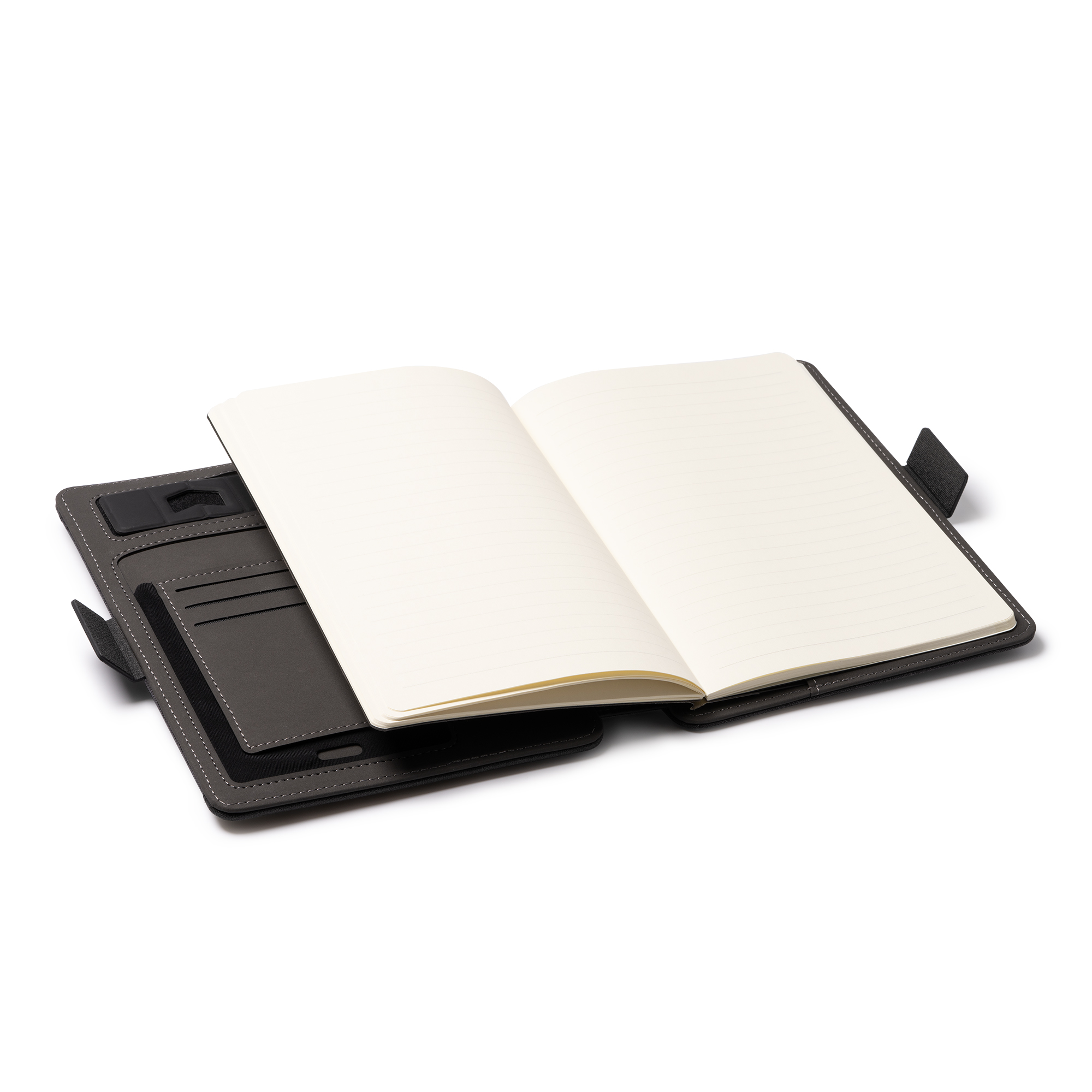 În interiorul mapei veți găsi un blocnotes detașabil cu 56 coli și un compartiment pentru telefonul mobil, unde îl puteți păstra la îndemână și protejat. Include, de asemenea, un suport pentru card și un suport pentru telefonul mobil.