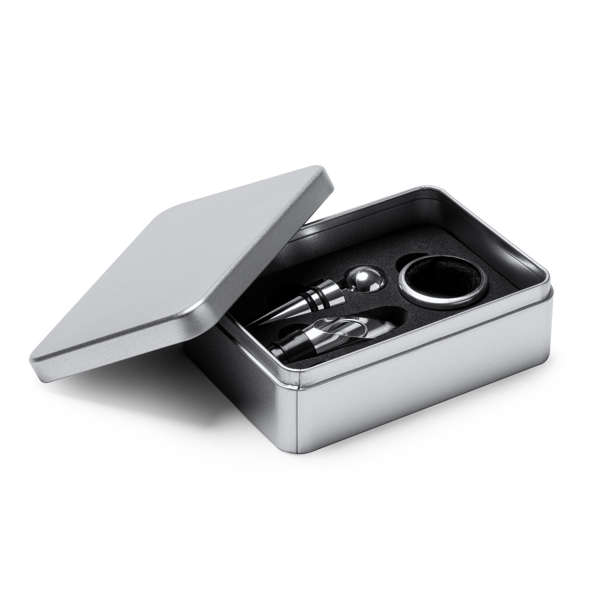 Set pentru vinuri cu accesorii din oțel inoxidabil, tirbușon cu tăietor de capsule, desfăcător de sticle, dop și dozator.