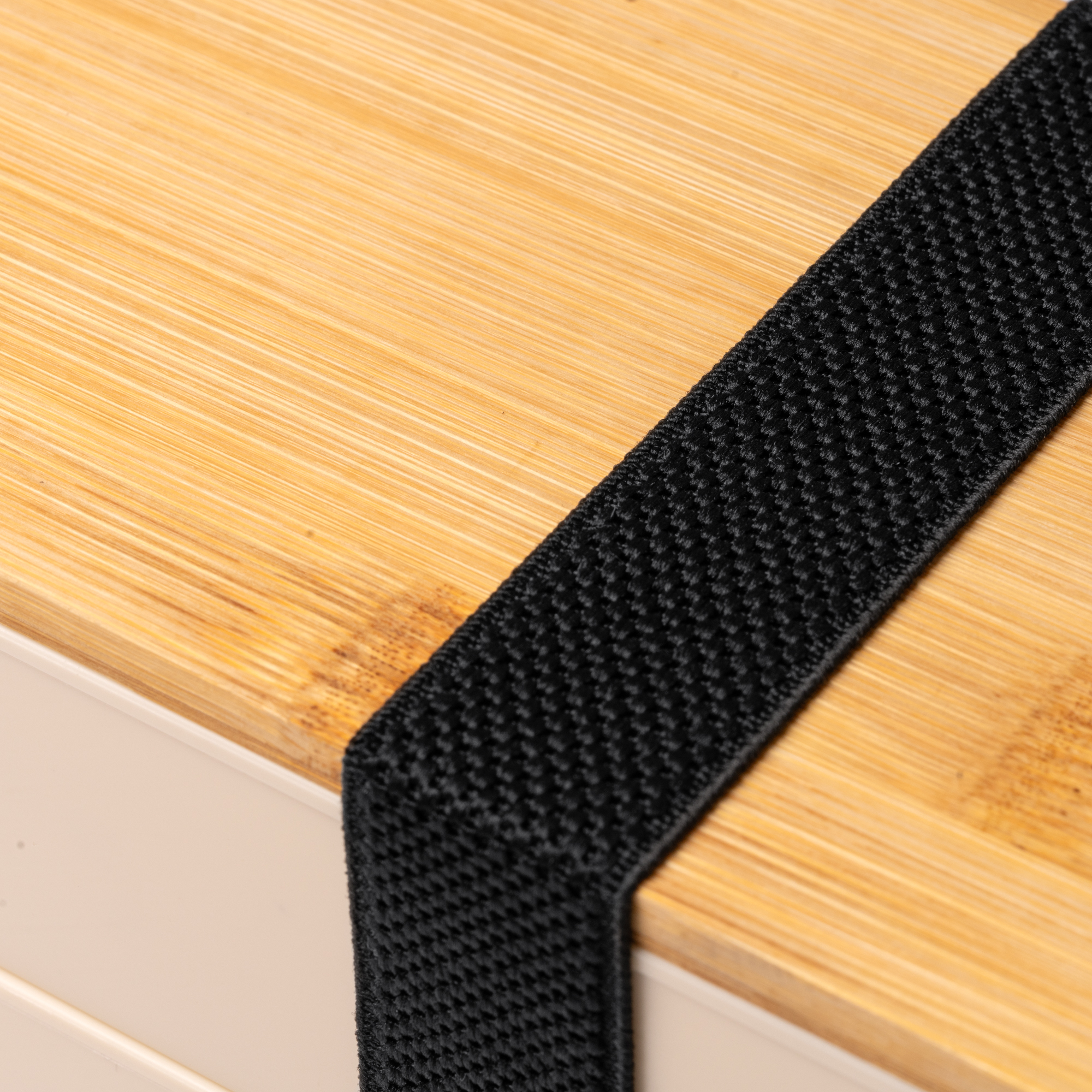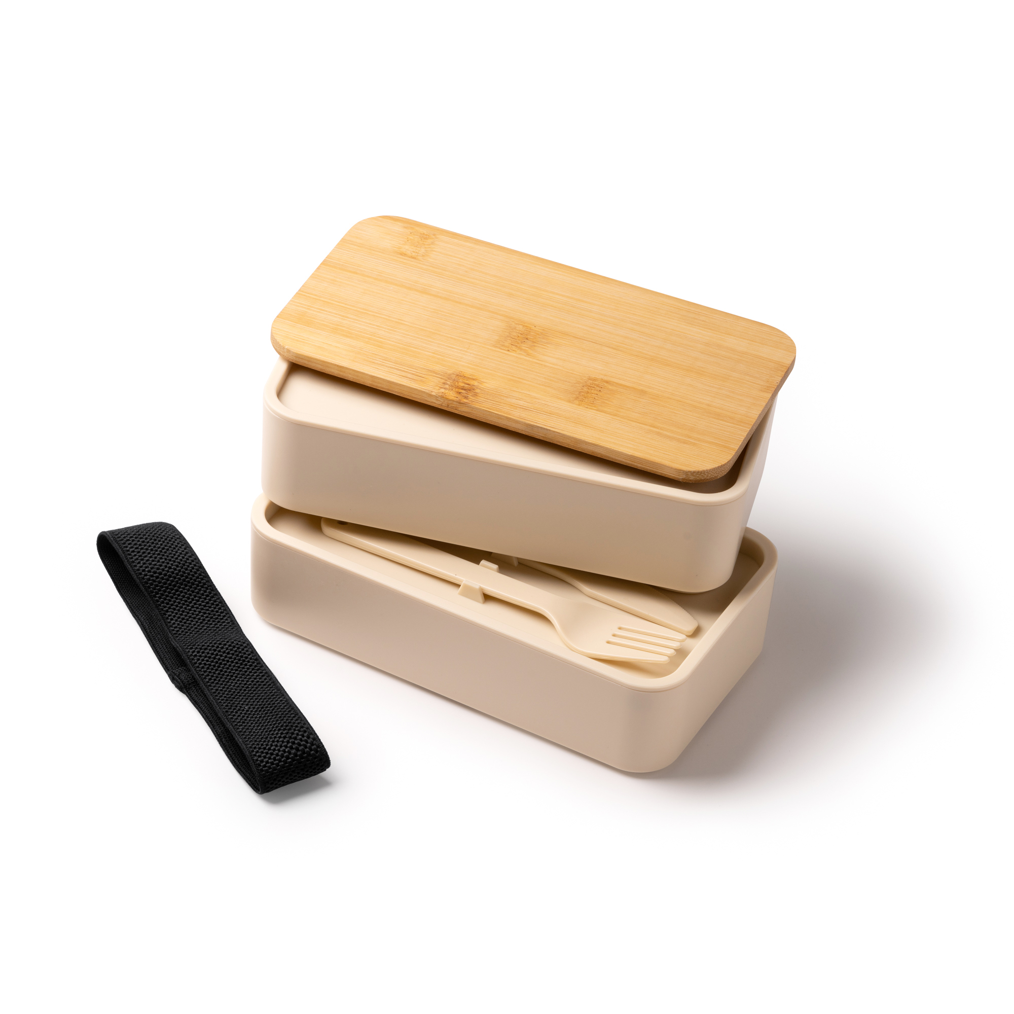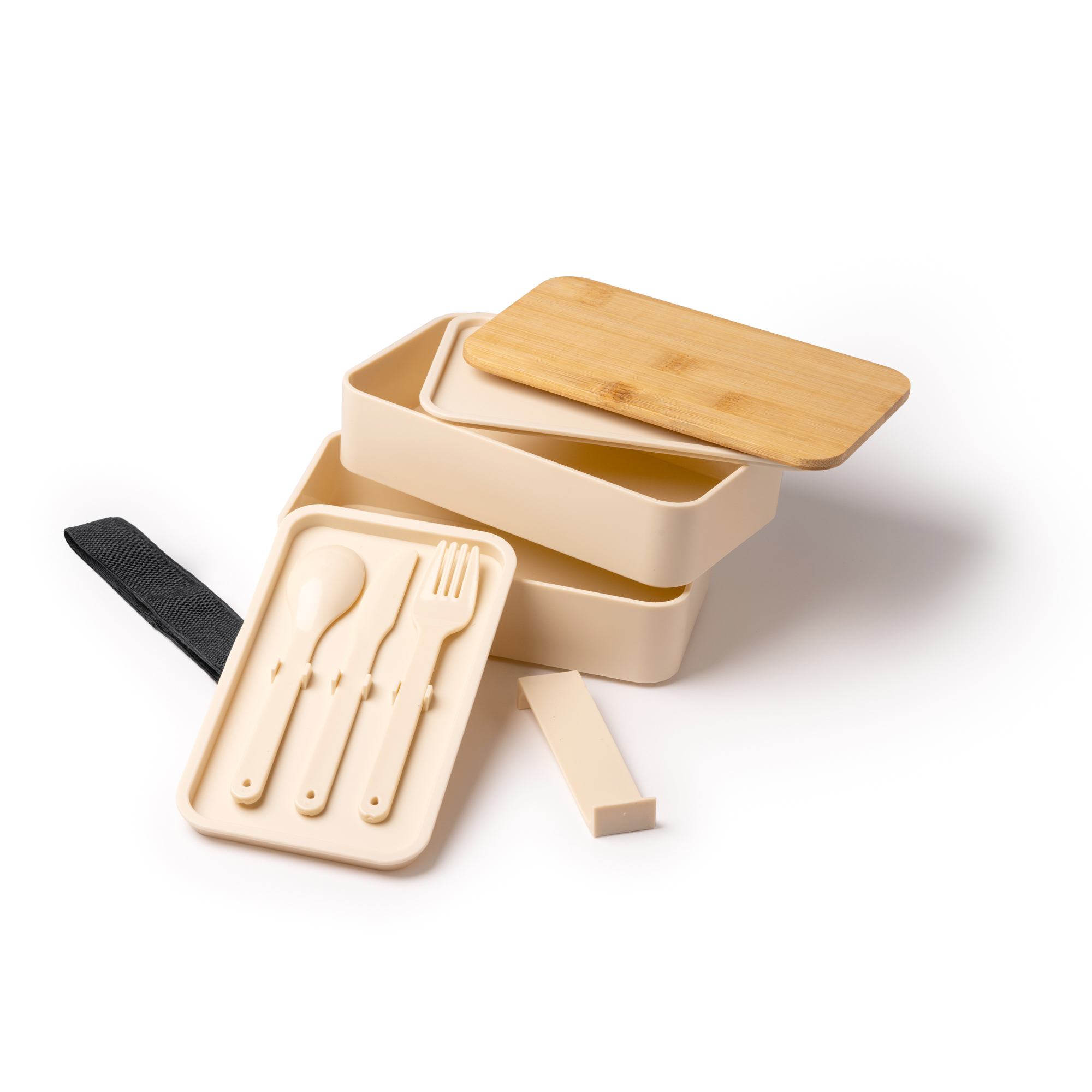 Cutie de prânz din PP cu două compartimente și capac din bambus. Set de tacâmuri, separator detașabil și curea de strângere incluse. Capacitate de 800 ml.