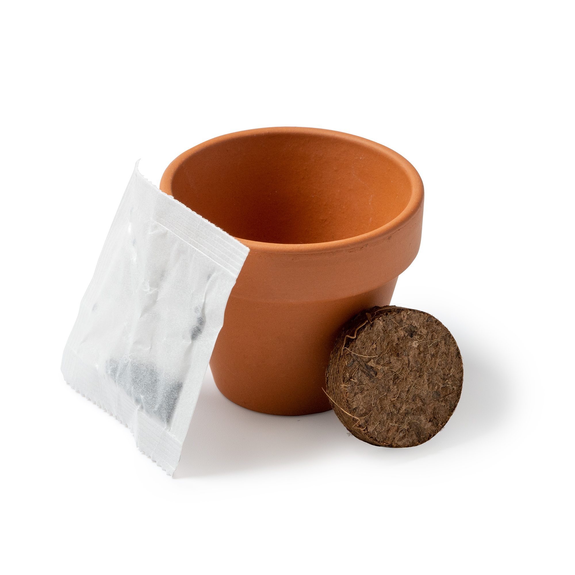 Ghiveci de flori din teracotă cu semințe de floarea-soarelui. Farfurioară inclusă. Produs fabricat în UE.