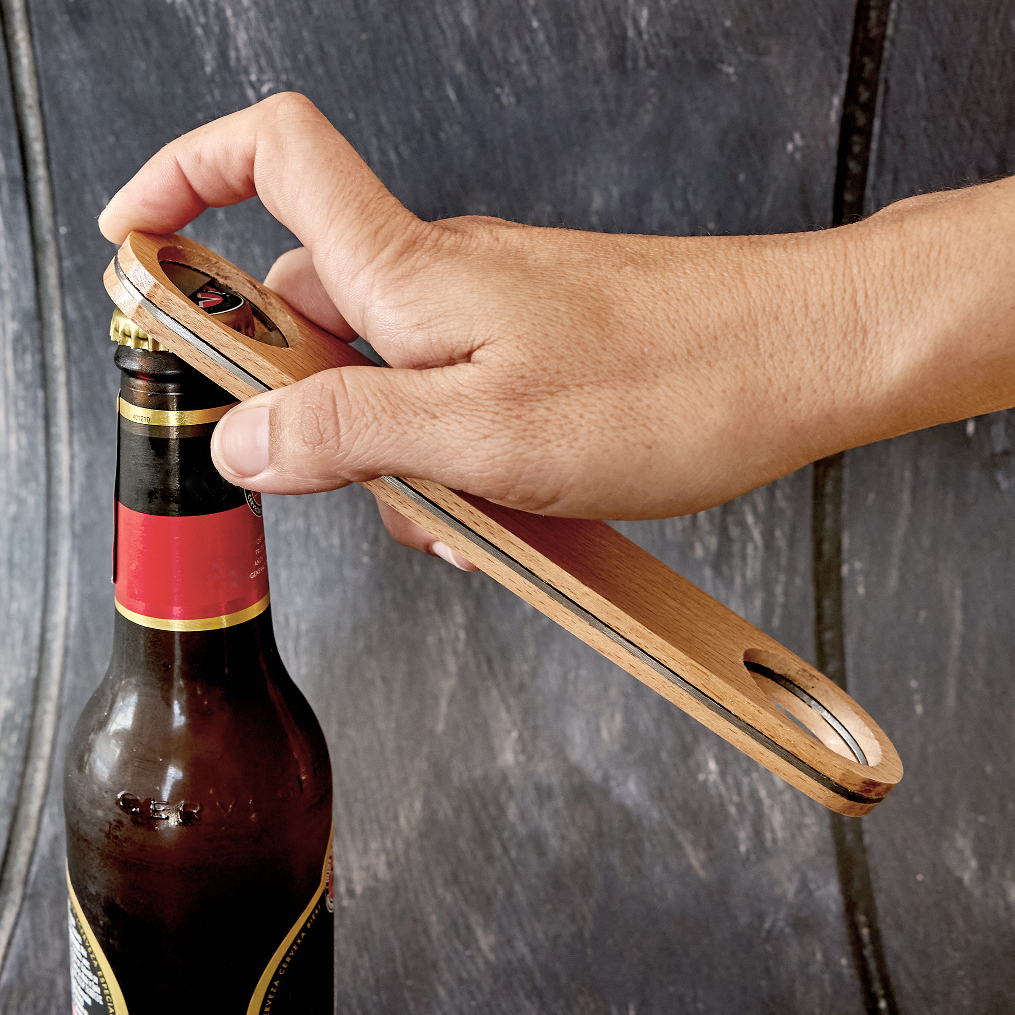 Tirbușon alungit linea nature, cu un orificiu la fiecare capăt: unul cu funcție de deschidere și celălalt de agățare. Fabricat din lemn natural cu interior din oțel inoxidabil.