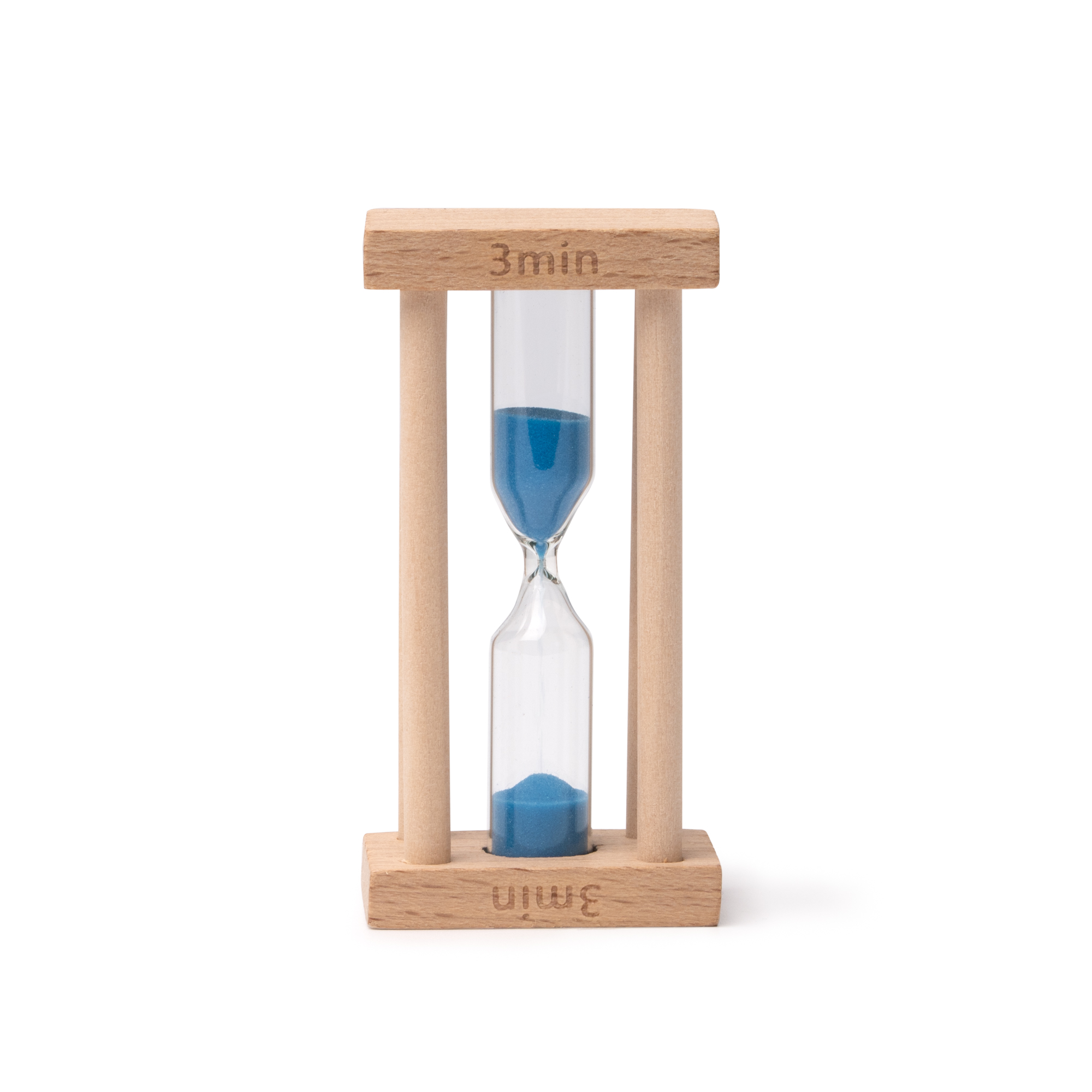 Clepsidră cu o durată de 3 minute, încadrată într-o structură din lemn, care oferă eleganță, precum și rezistență.