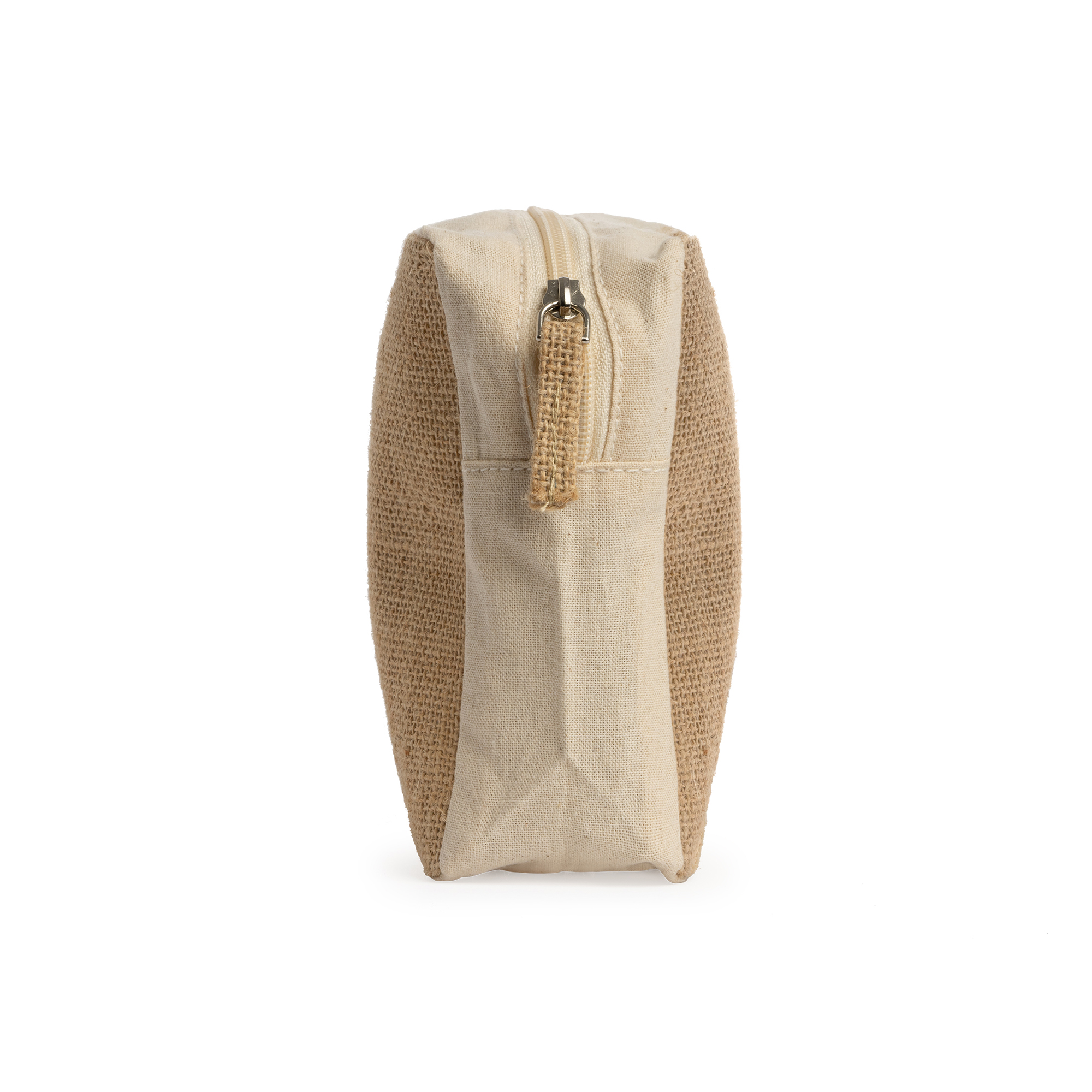 Geantă cosmetice din bumbac și iută laminată. Fermoar asortat cu trăgător din iută.