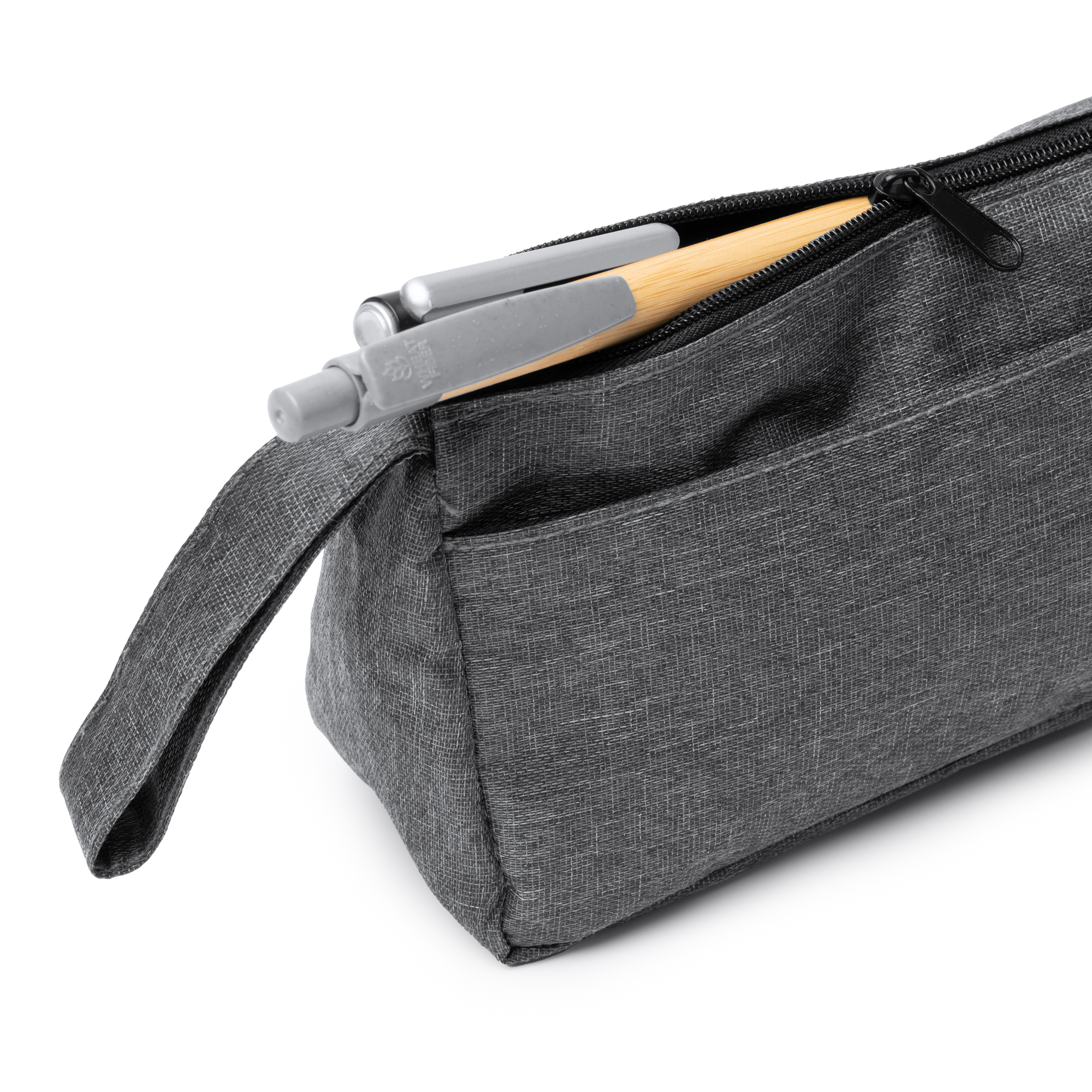 Geantă de cosmetice din 300D RPET. Compartiment principal și buzunar exterior cu închidere cu fermoar. Include mâner practic de transport.