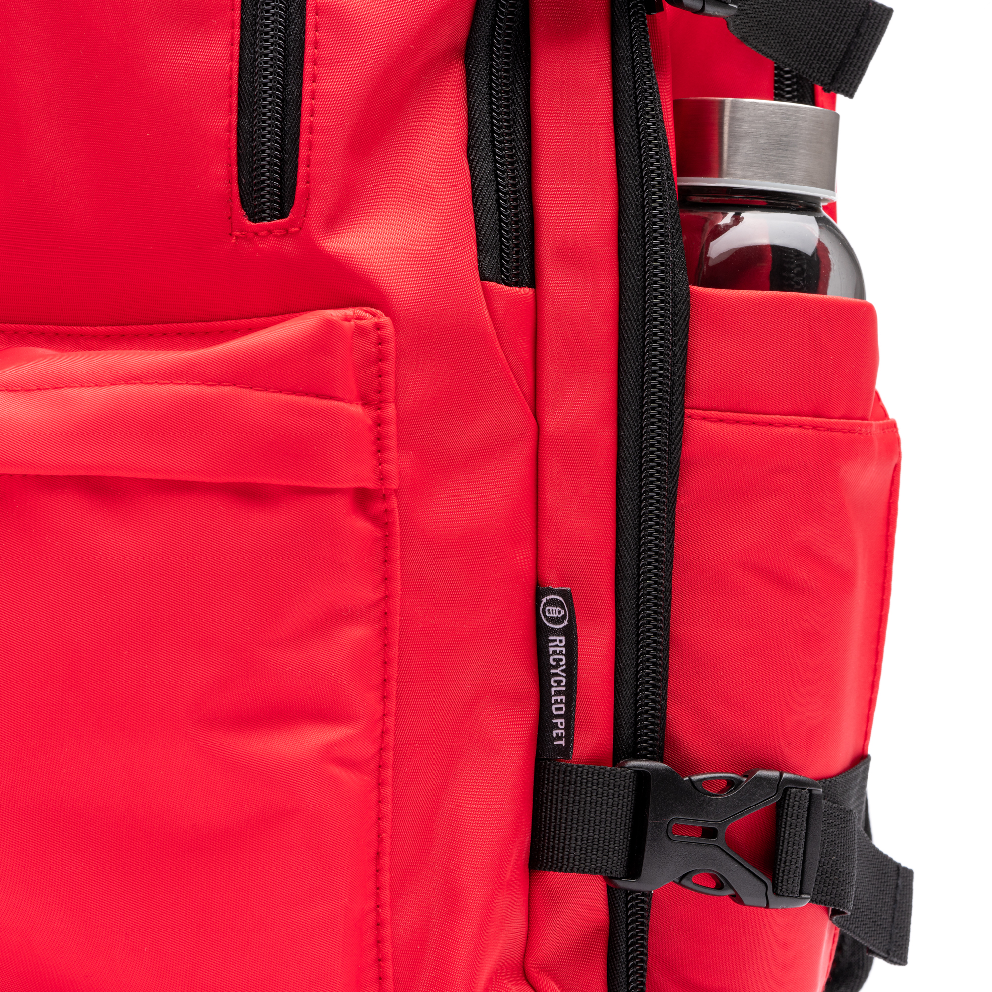 Rucsac de cabină impermeabil din poliester RPET. Compartiment principal spațios pentru transportul hainelor și un buzunar pentru laptop de 16”. Buzunar frontal cu căptușeală impermeabilă și buzunar de siguranță la spate. Bretele pentru umăr și spate căptușite. Curea troler.