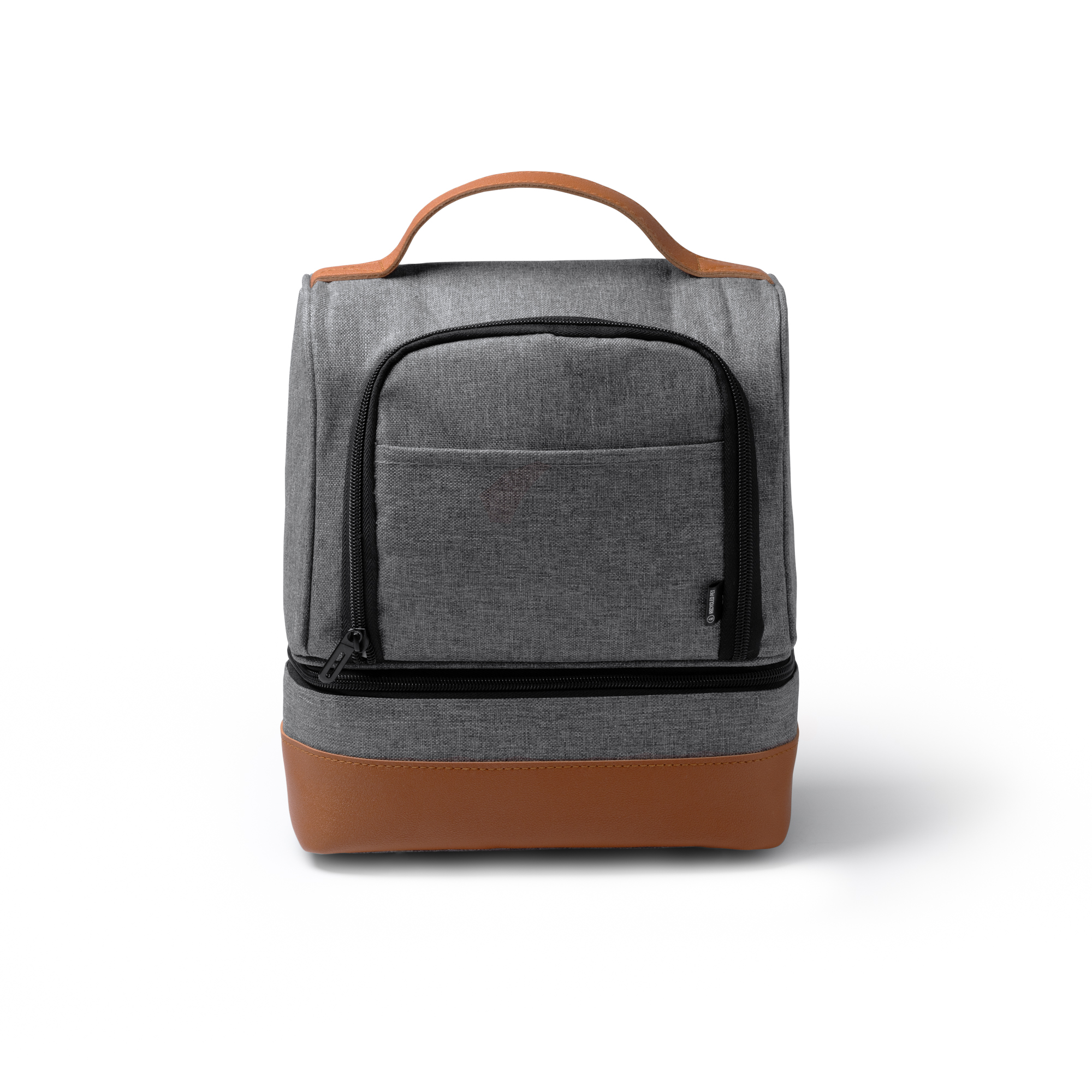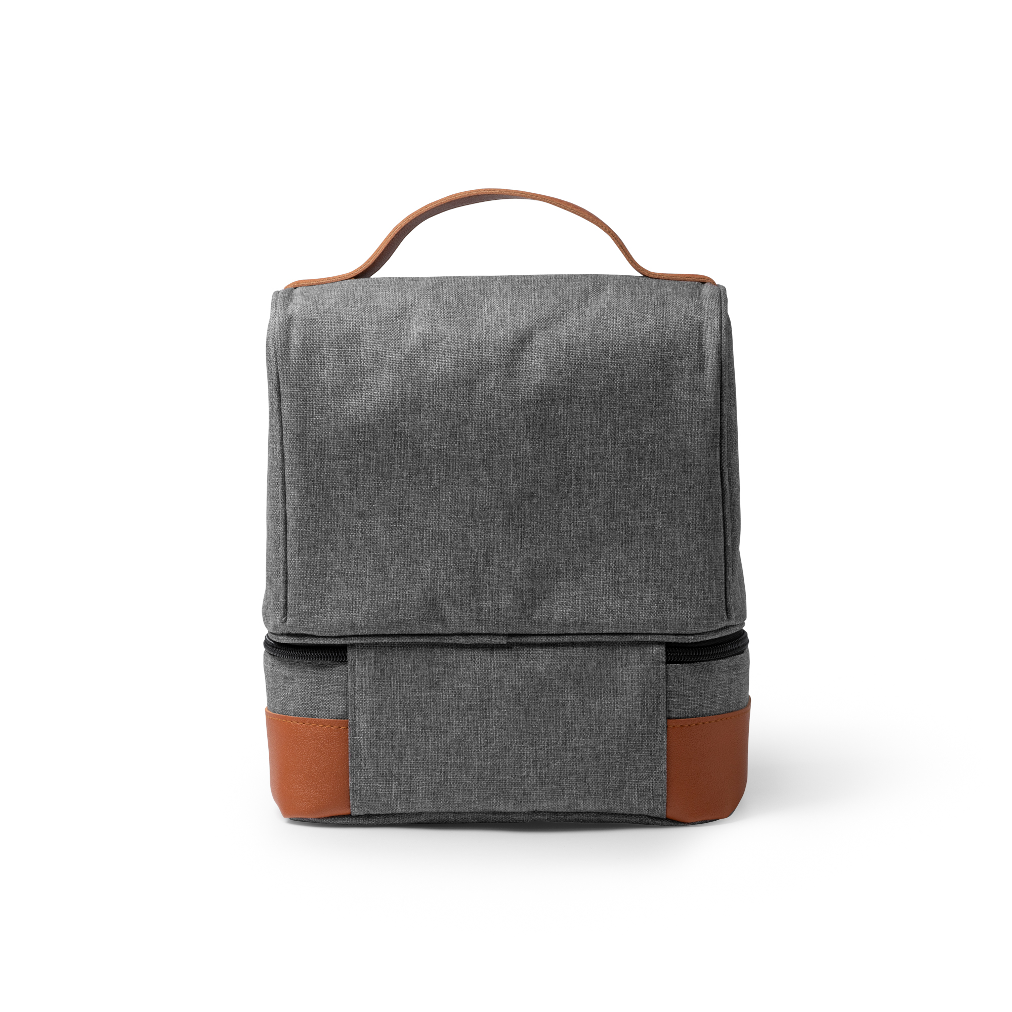Geantă frigorifică din poliester RPET cu model ecosez. Compartimente independente duble cu închidere cu fermoar și căptușeală izotermică. Mânere de transport și bază din piele PU.