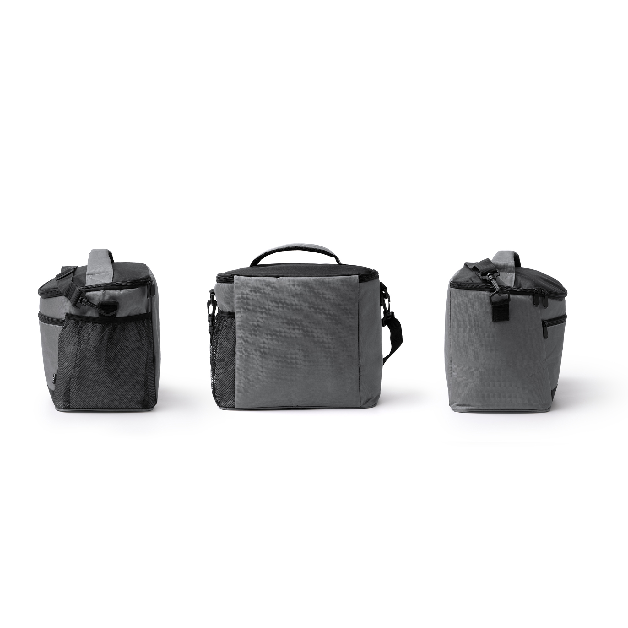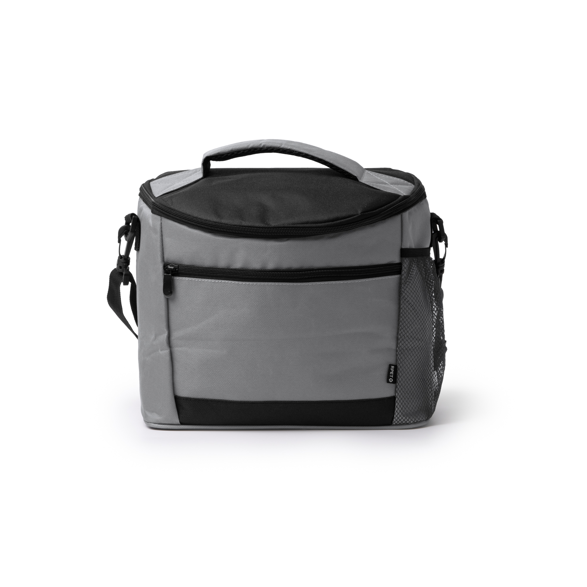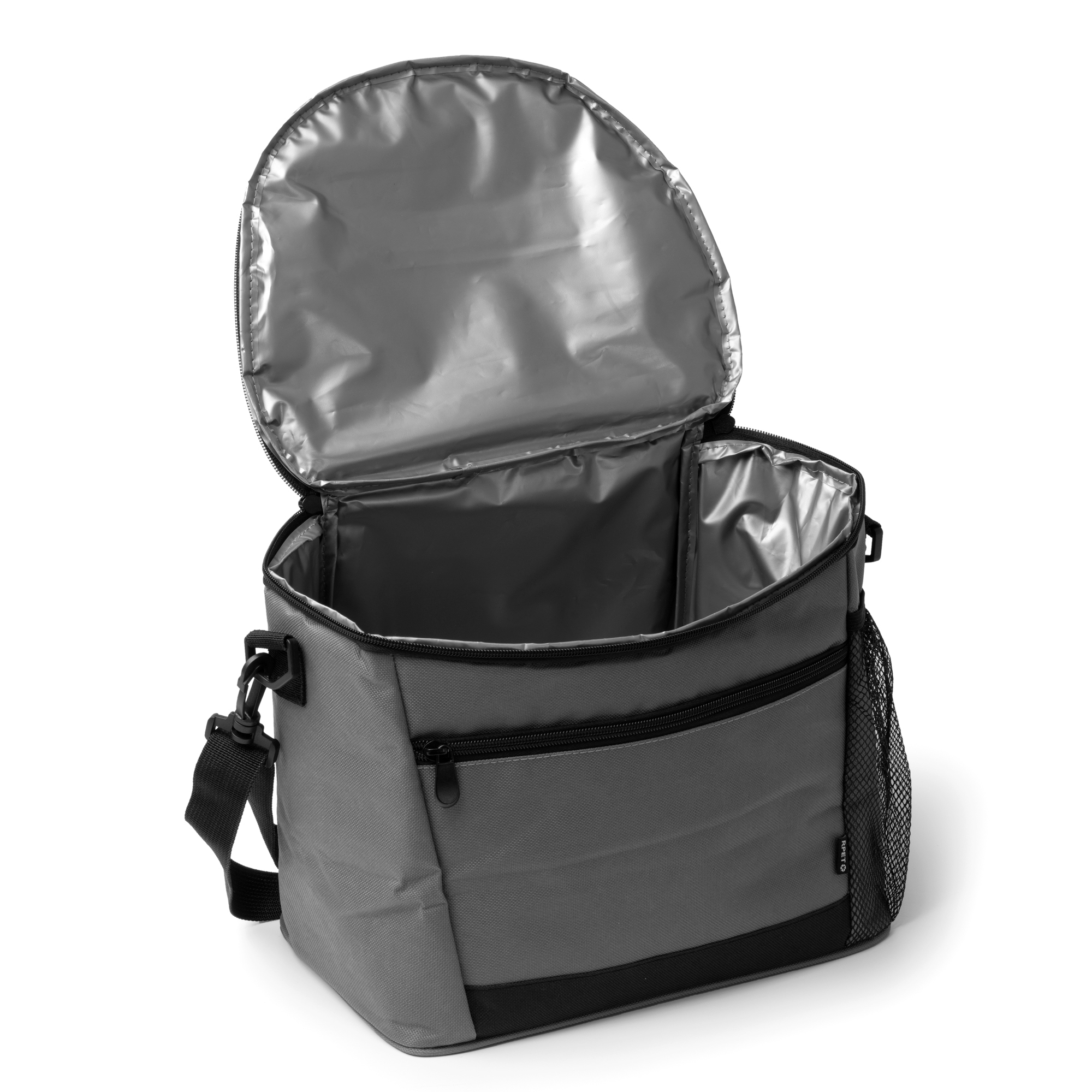 Răcitor de format mare din 600D RPET. Buzunar frontal și buzunar lateral cu închidere cu fermoar. Interior izoterm. Curea de transport reglabilă.