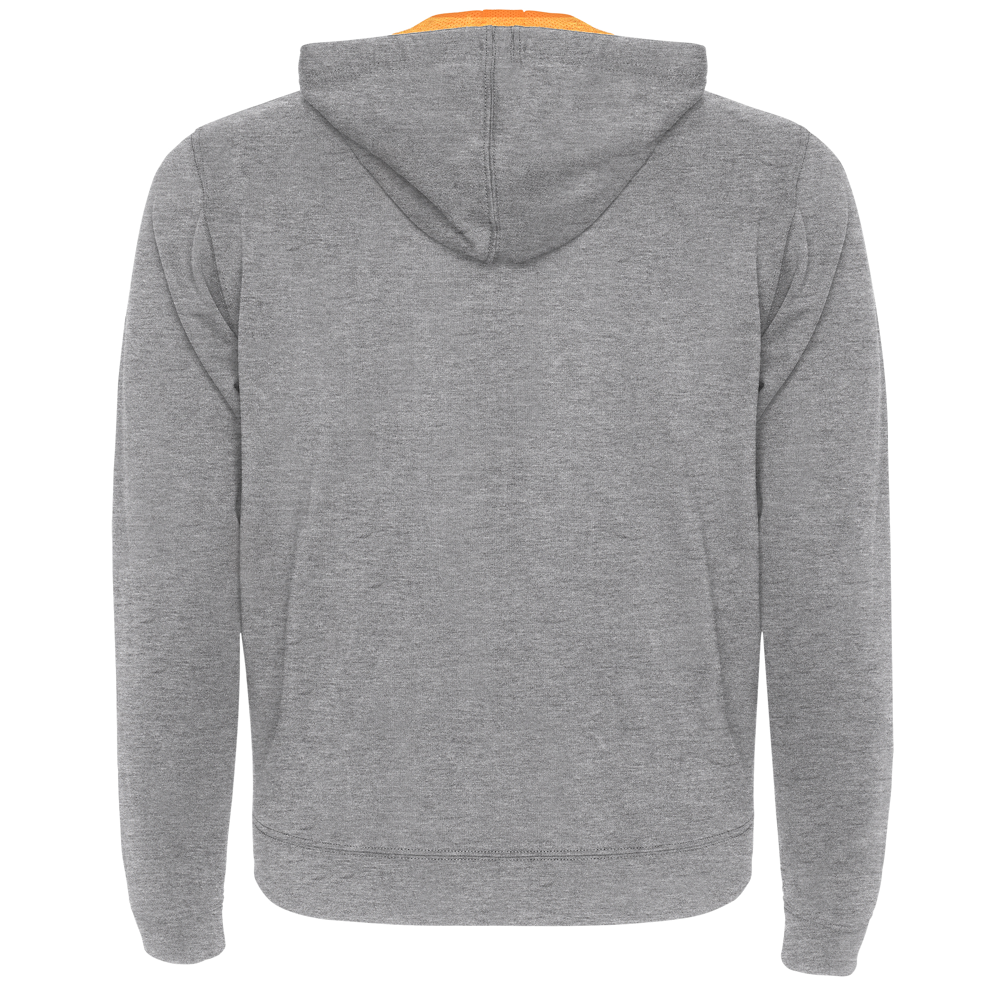 Hanorac cu fermoar în față și glugă din material nepieptănat. Glugă căptușită cu plasă de poliester. Bretele plate din poliester. Manșete și betelie cu nervuri 2×1 cu elastan. Cu bandă asortată întărită pentru acoperirea cusăturii. Opțiuni de culoare solide și contrastante.