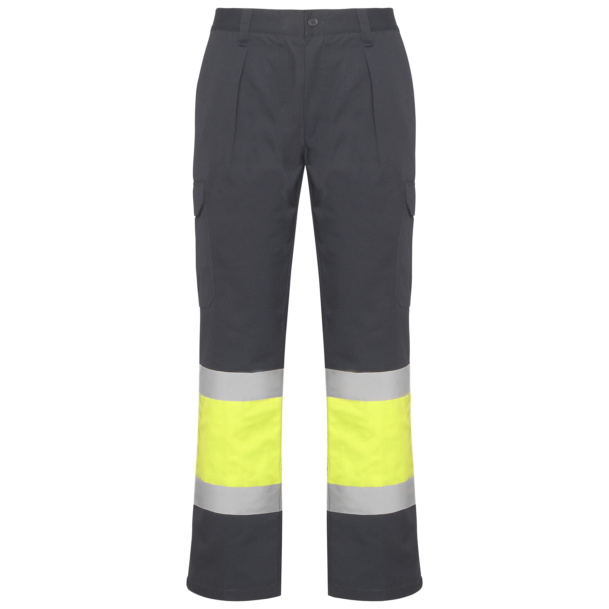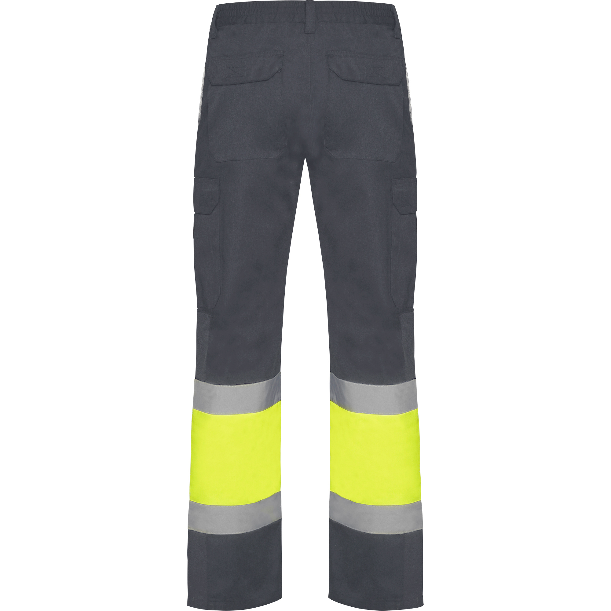Pantaloni lungi cu vizibilitate ridicată, în două culori, cu multiple buzunare.