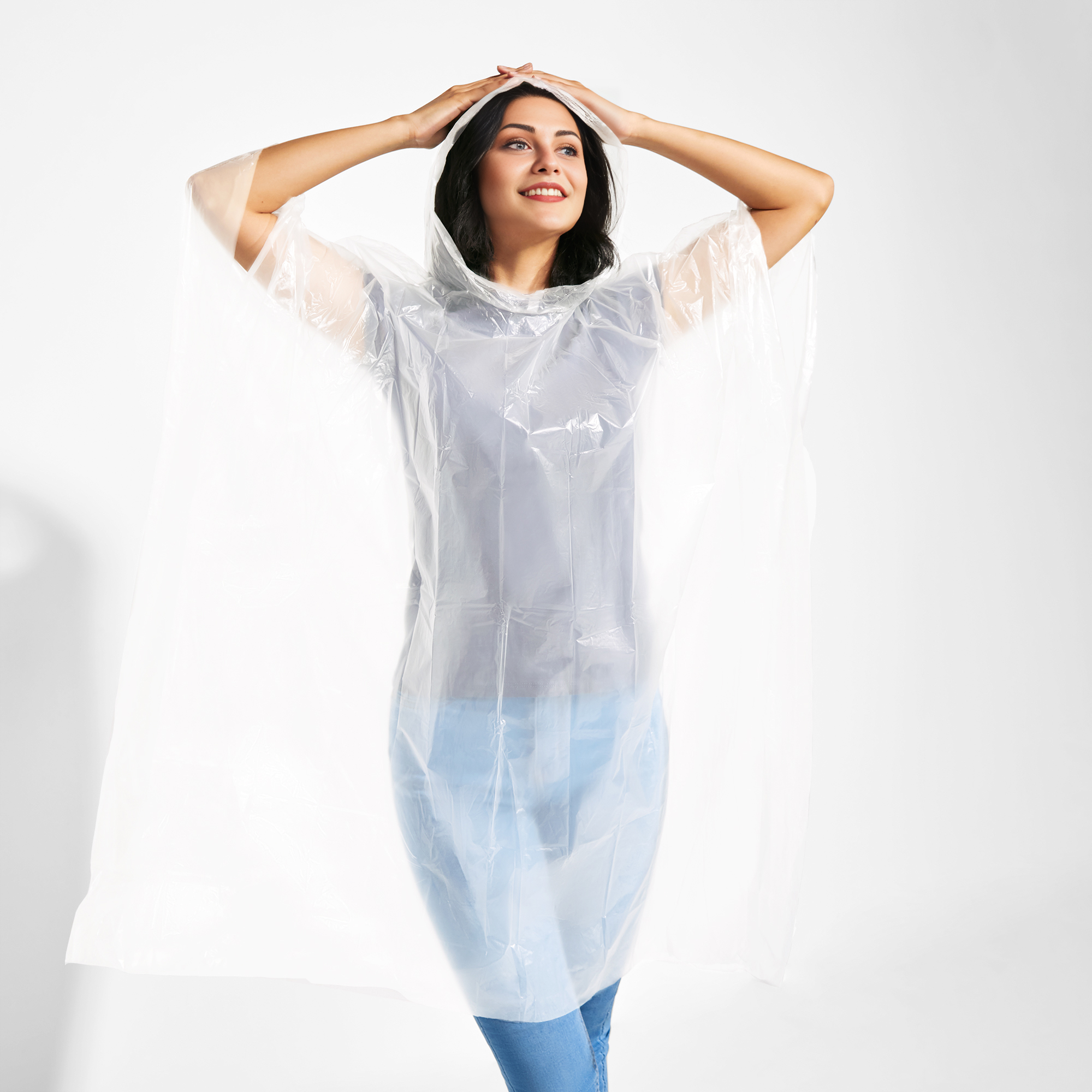 Pelerină de ploaie transparentă din material compostabil. Mărime unică disponibil doar pentru adulți, cu glugă și deschizătură pentru brațe. Împachetată în husă din PLA de 10 x 13,5 cm.