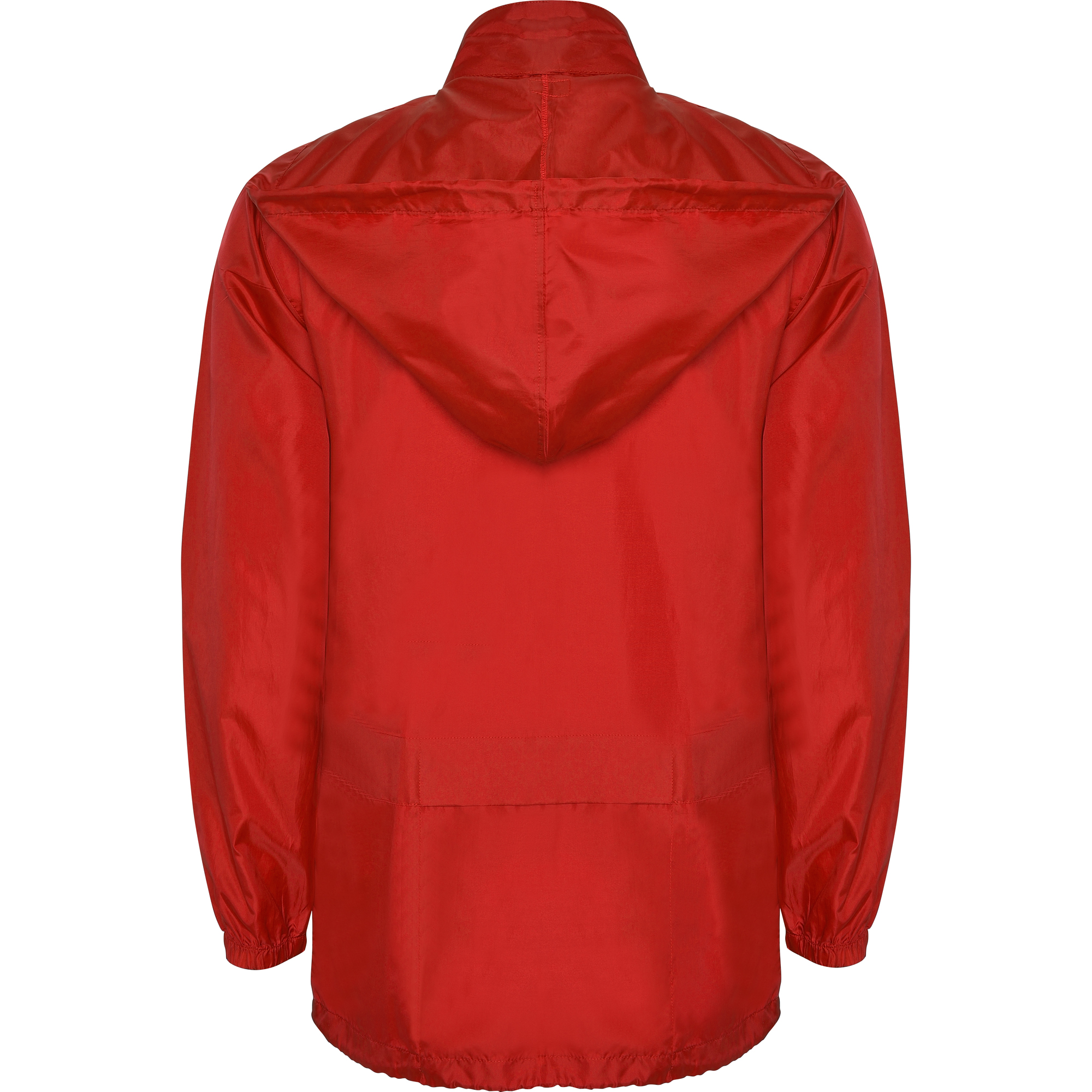 Jachetă impermeabilă cu guler înalt și glugă detașabilă cu șnur. Fermoar frontal asortat. Buzunare laterale cu fermoare acoperite cu o bandă din același material. Manșete elastice. Tiv cu șnur interior reglabil. Buzunar interior cu curea elastică pentru pliere și depozitare.