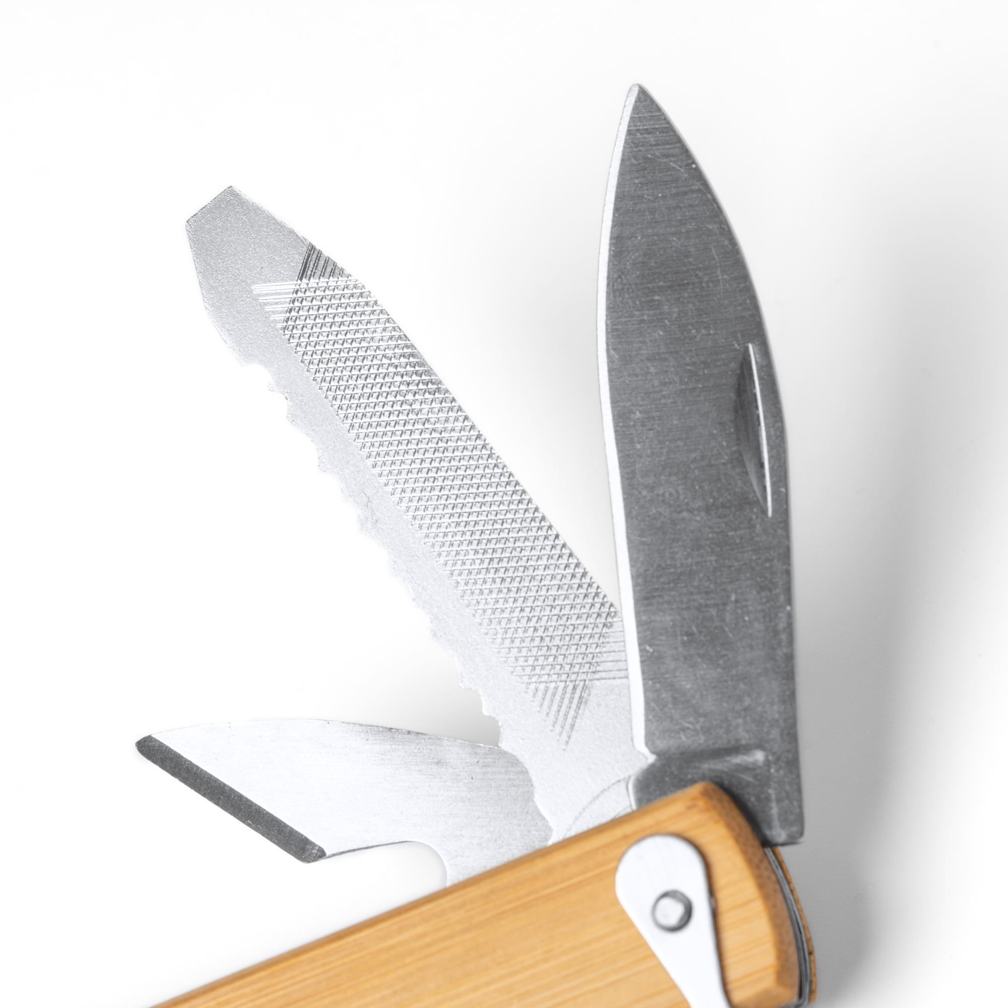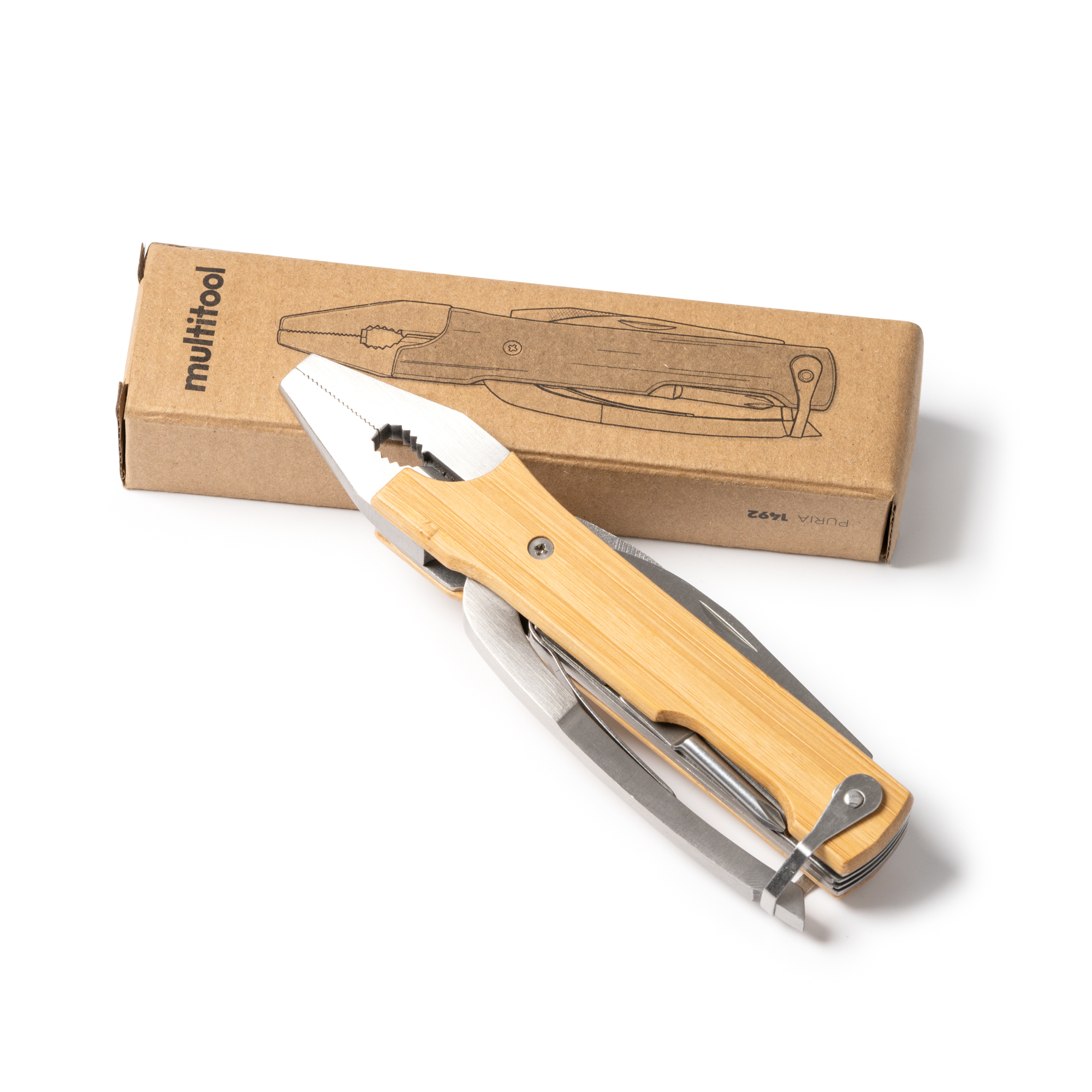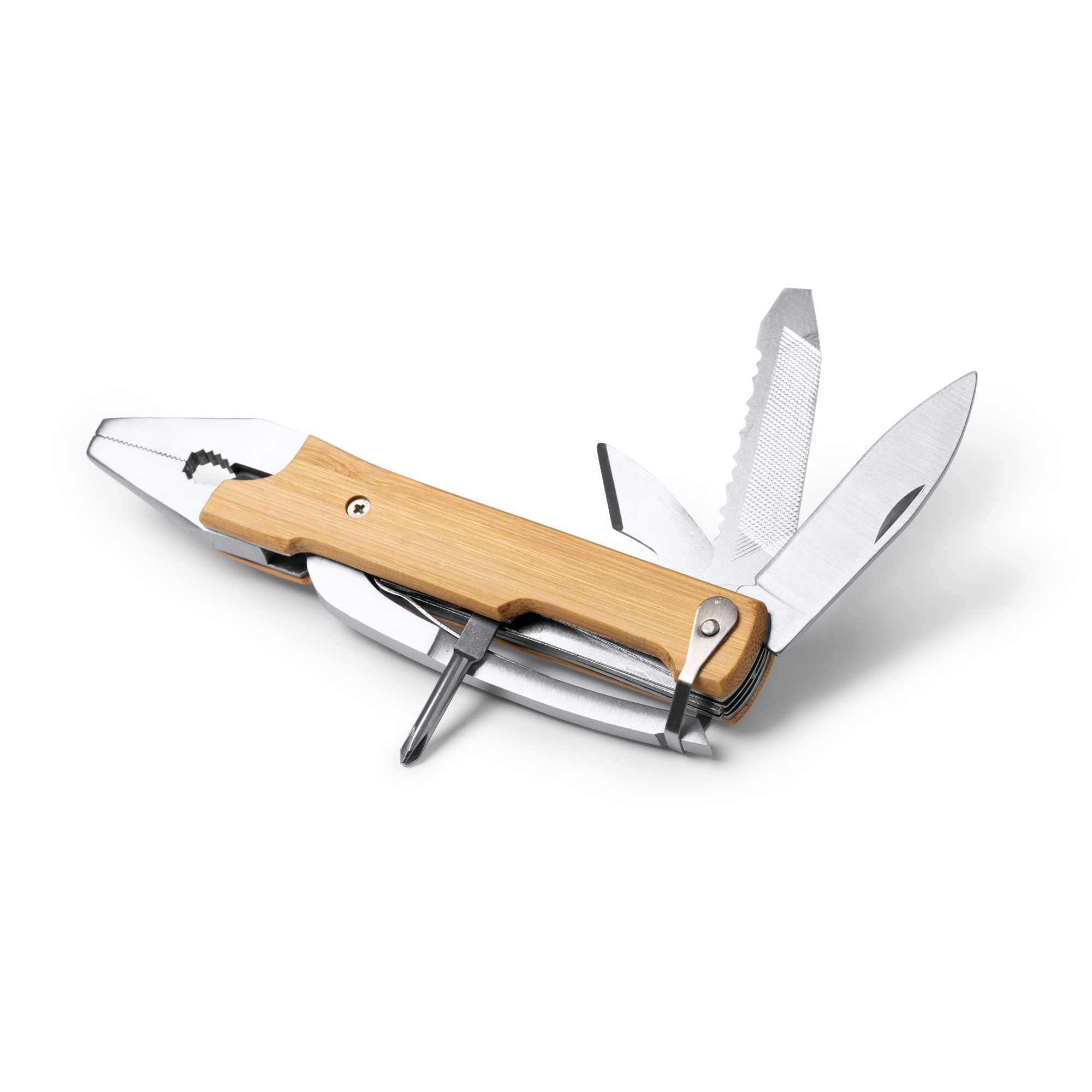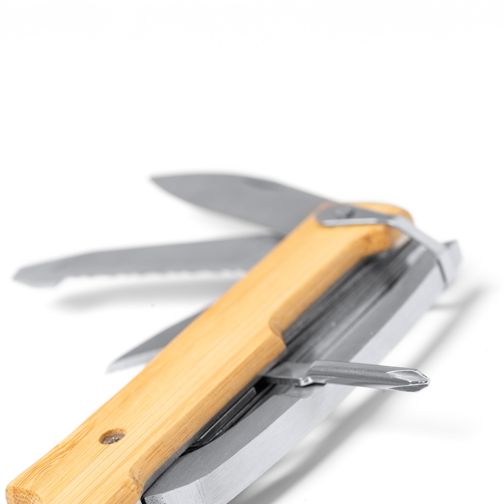 Unealtă multifuncțională fabricată din oțel inoxidabil cu mâner din bambus, oferind 5 funcții esențiale: cuțit, ferăstrău, clește, deschizător și șurubelniță. Perfect pentru activități în aer liber și uz casnic, oferă versatilitate și durabilitate. Designul său compact este ușor de transportat și depozitat, făcându-l ideal pentru aventurile în aer liber, lucrările de bricolaj și urgențele casnice.