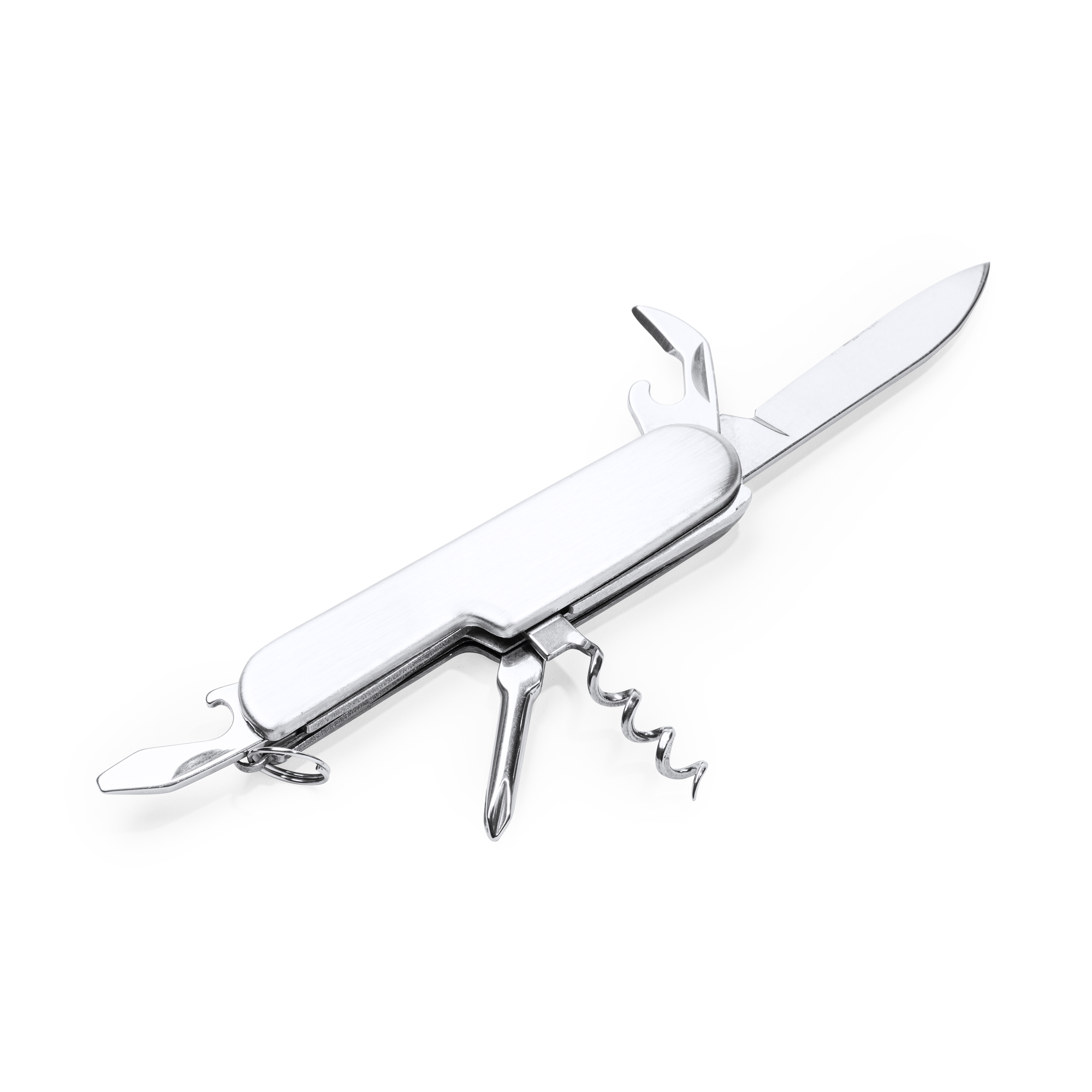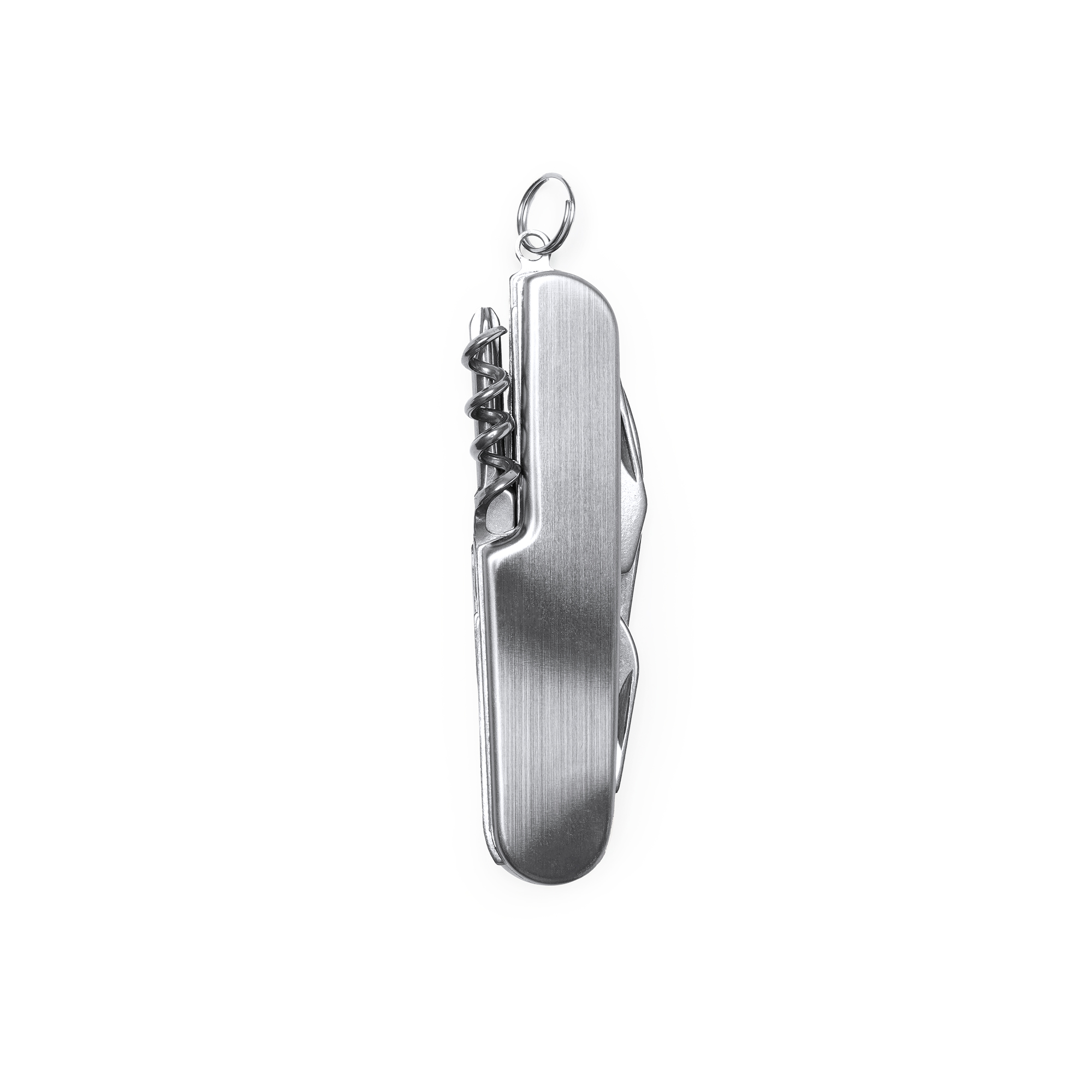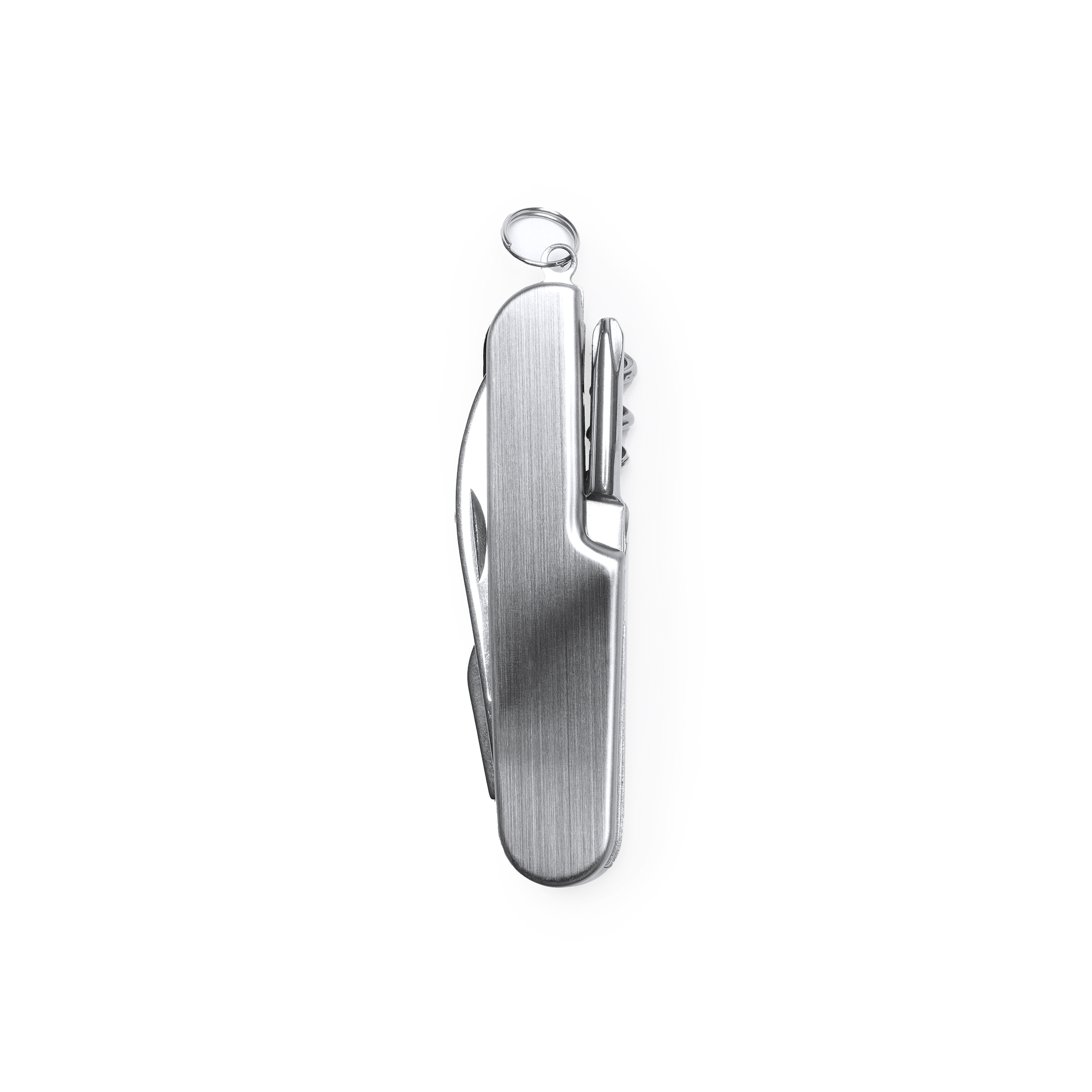 Briceag multifuncțional din oțel inoxidabil cu 6 funcții: cuțit, deschizător de conserve, tirbușon, șurubelniță și breloc.