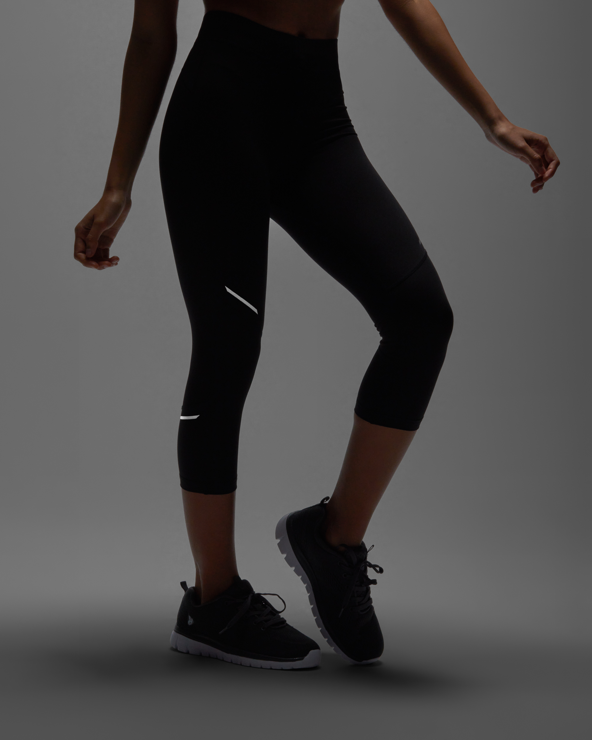 Colanți de alergare pentru femei, respirabili, lungime medie. Betelie elastică cu șnur transversal reglabil. Detalii reflectorizante. Mini buzunar la spate.