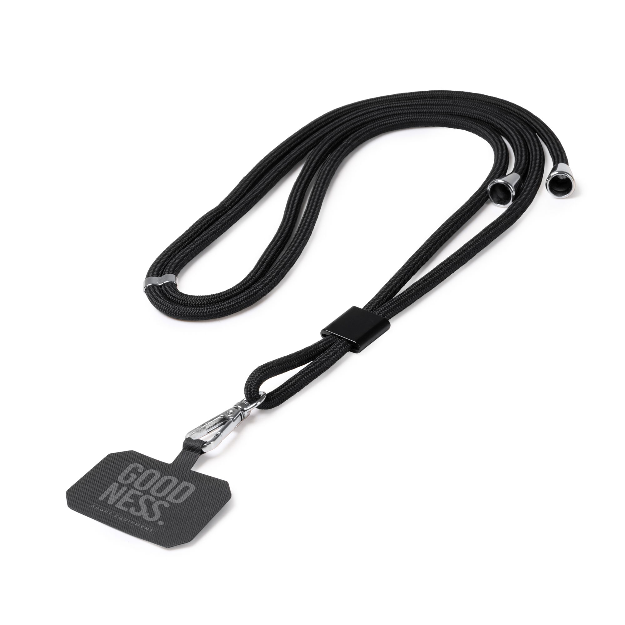 Suport de telefon mobil cu șnur din poliester reciclat RPET. Curea reglabilă și include carabină.