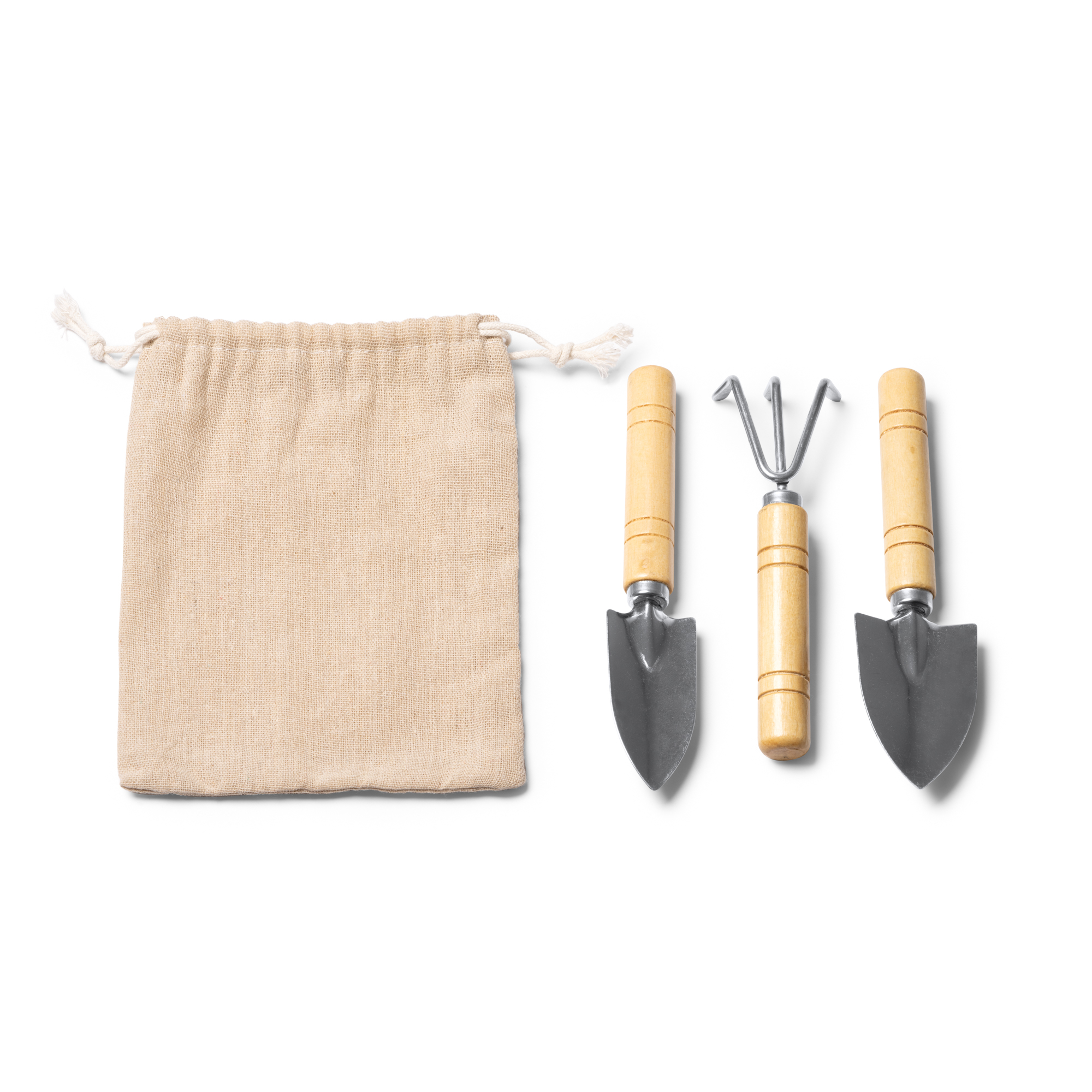 Set de grădinărit cu 3 accesorii din oțel inoxidabil și mâner din bambus. Include un transplantor cu lamă mare, unul cu lamă mică și greblă. Include husă din bumbac. Mod de prezentare: în cutie cu model ecologic.
