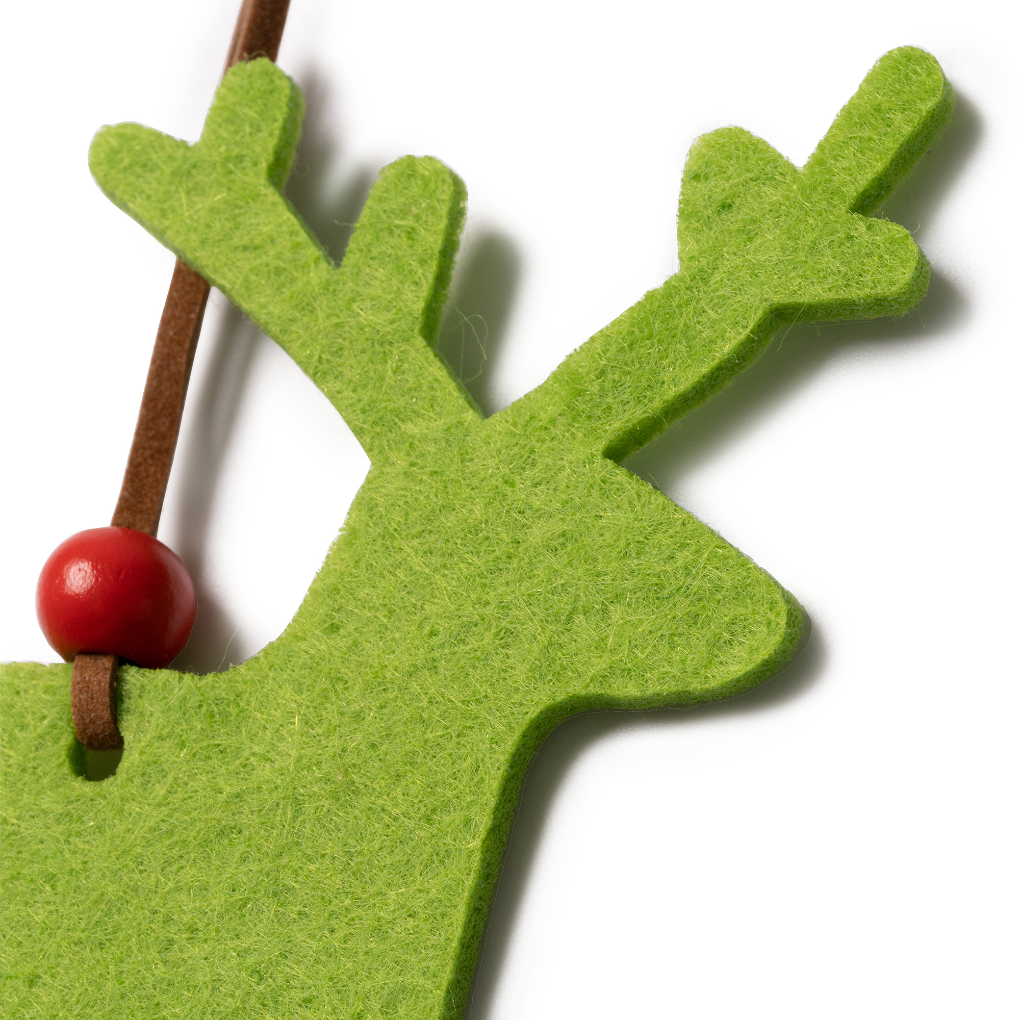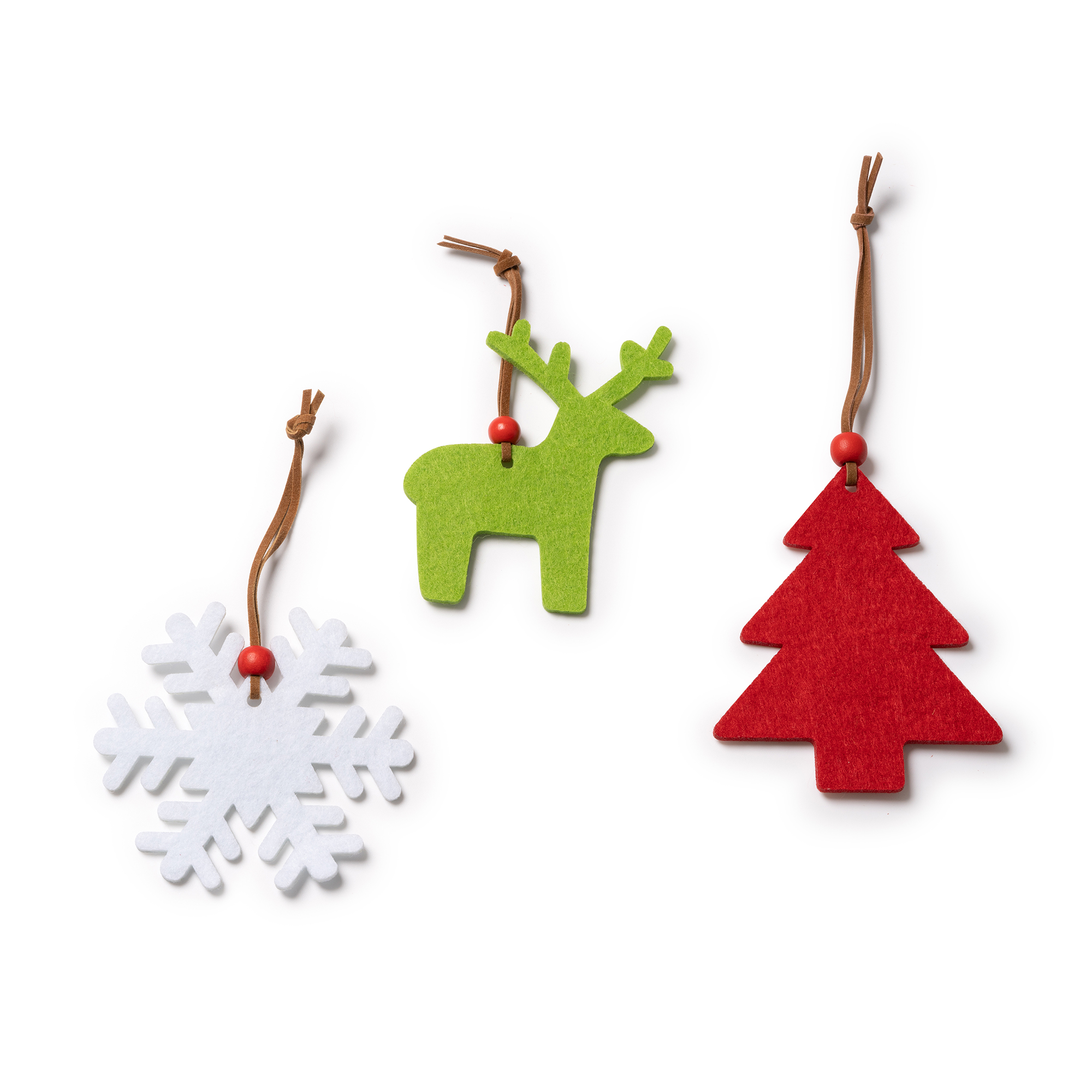 Ornament de Crăciun din pâslă. Disponibil în trei modele: fulg de zăpadă, brad și ren. Toate cele trei modele sunt prevăzute cu șnur maro și mărgele roșii la capăt.