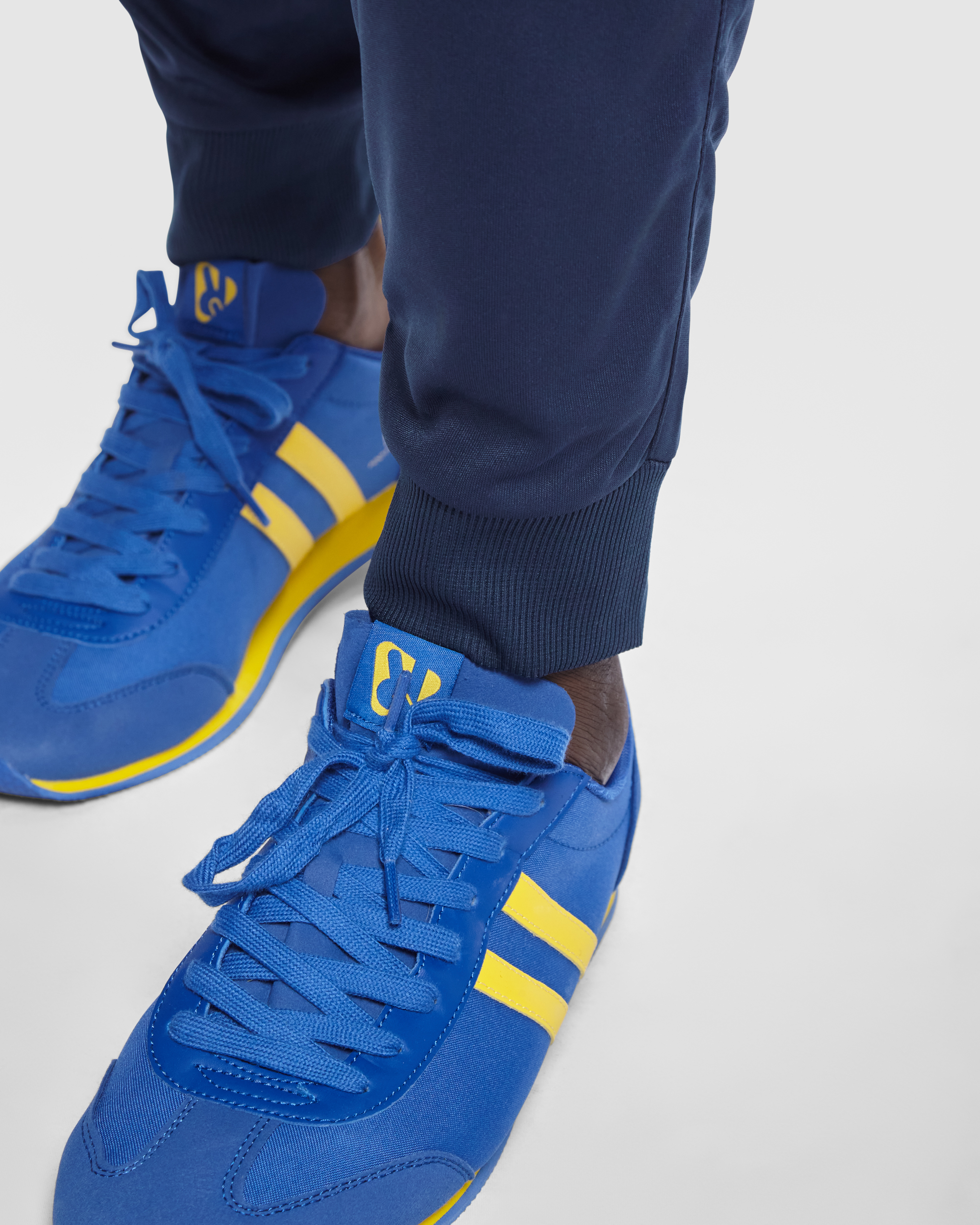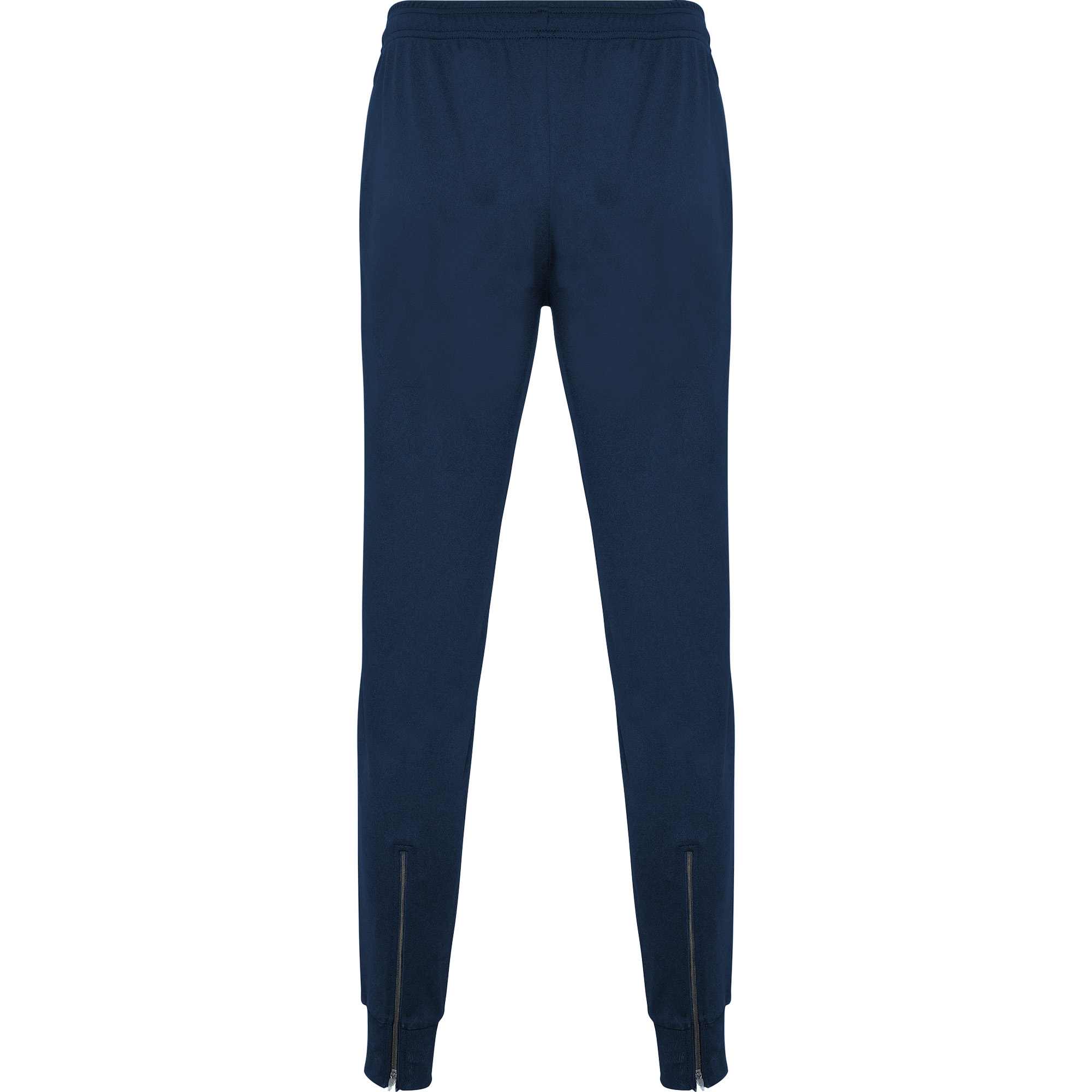 Pantaloni de antrenament slim-fit. Bandă elastică în talie cu șnur ajustabil interior. Buzunare laterale cu fermoar, disponibile în mărimi pentru adulți. Manșete din reiat 1×1 și fermoare.