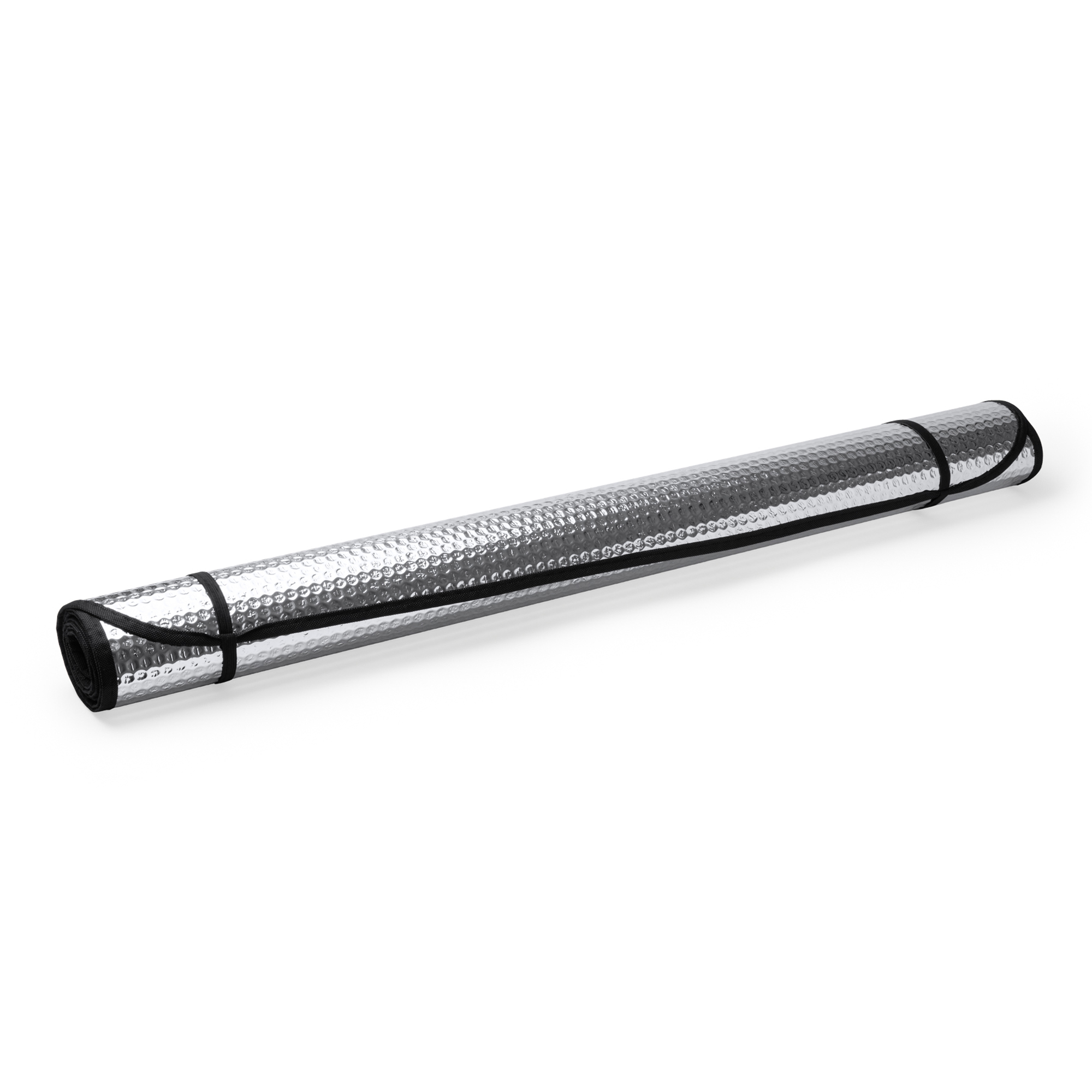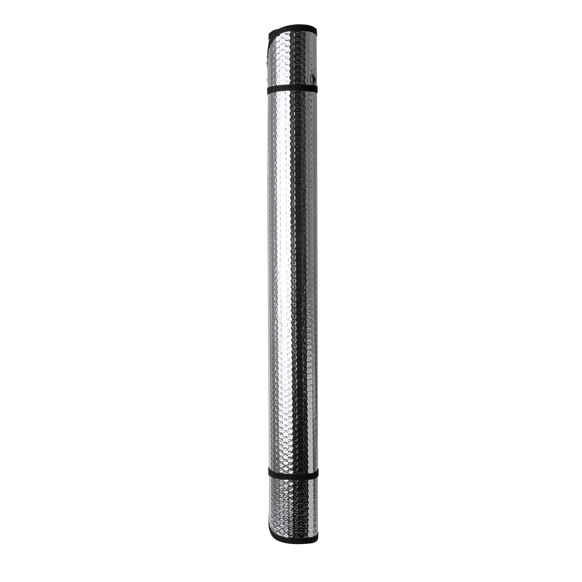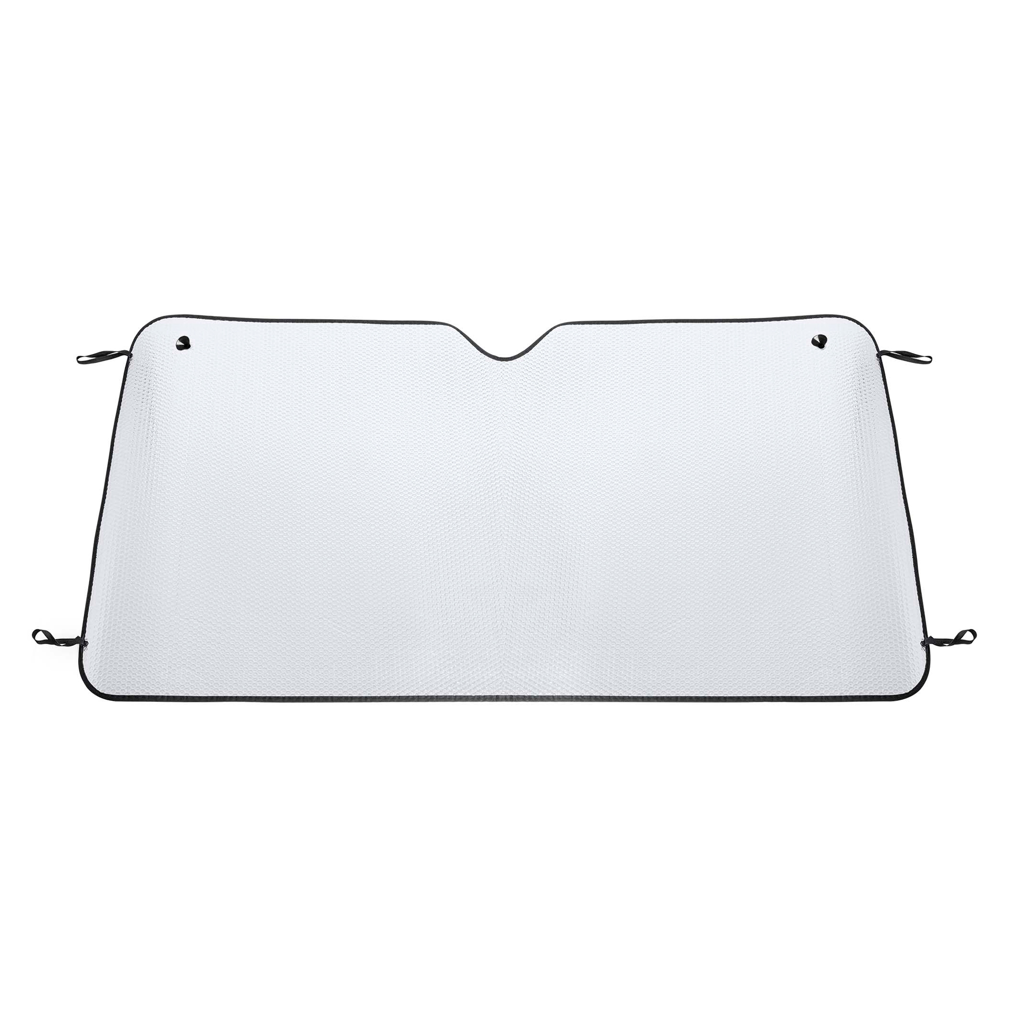 Ideal large sun shield for trucks and vans. Both sides in bubble aluminium and black edging. Metal eyelets with suction cups and elastic straps for folding included.