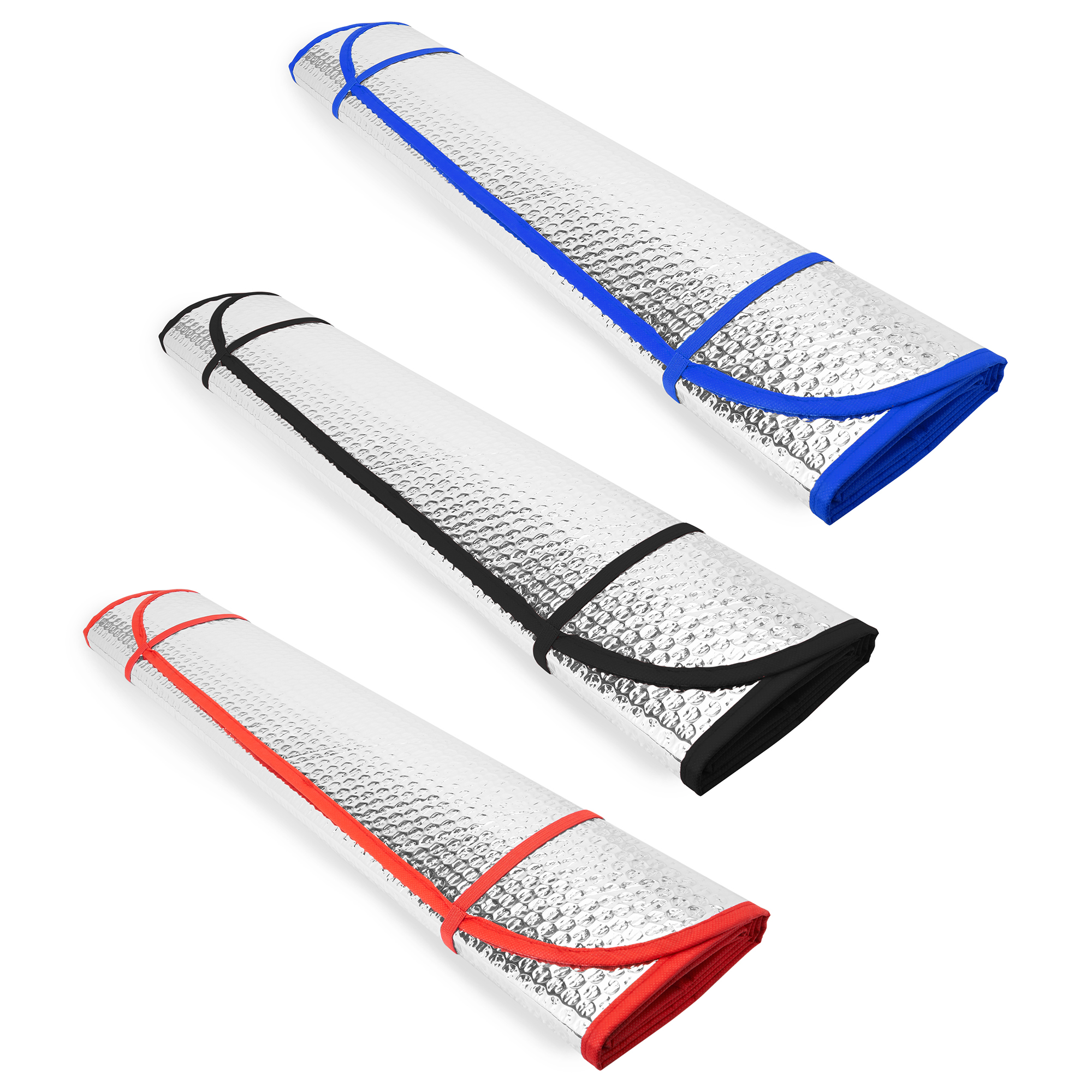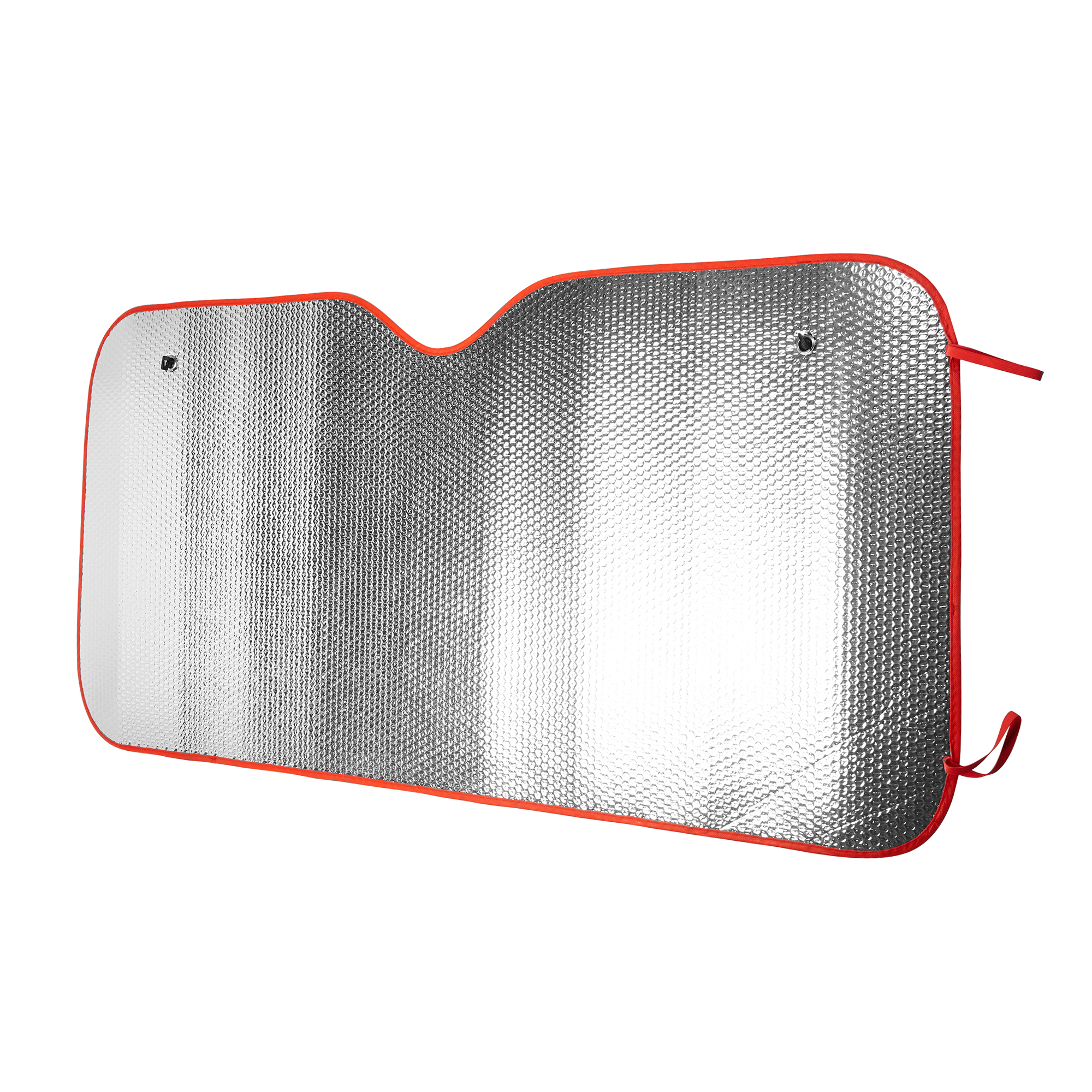 Parasolar auto cu 2 straturi de bule din aluminiu. Două orificii în ambele colțuri superioare pentru introducerea ventuzelor. Margini și benzi elastice pentru înfășurare, de aceeași culoare. Modelul este împachetat nerulat. Se vinde doar la cutie completă.