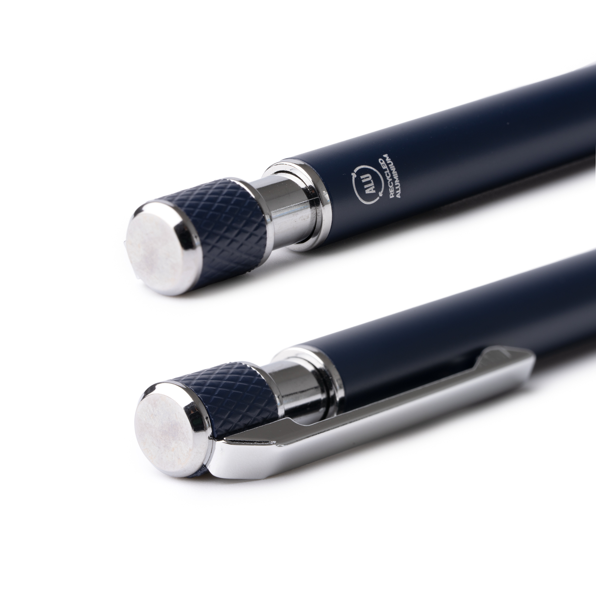 Pix din aluminiu reciclat finisat în culoare solidă mată cu detalii argintii. Cu texturi în zona de prindere și pe buton. Pastă albastră.