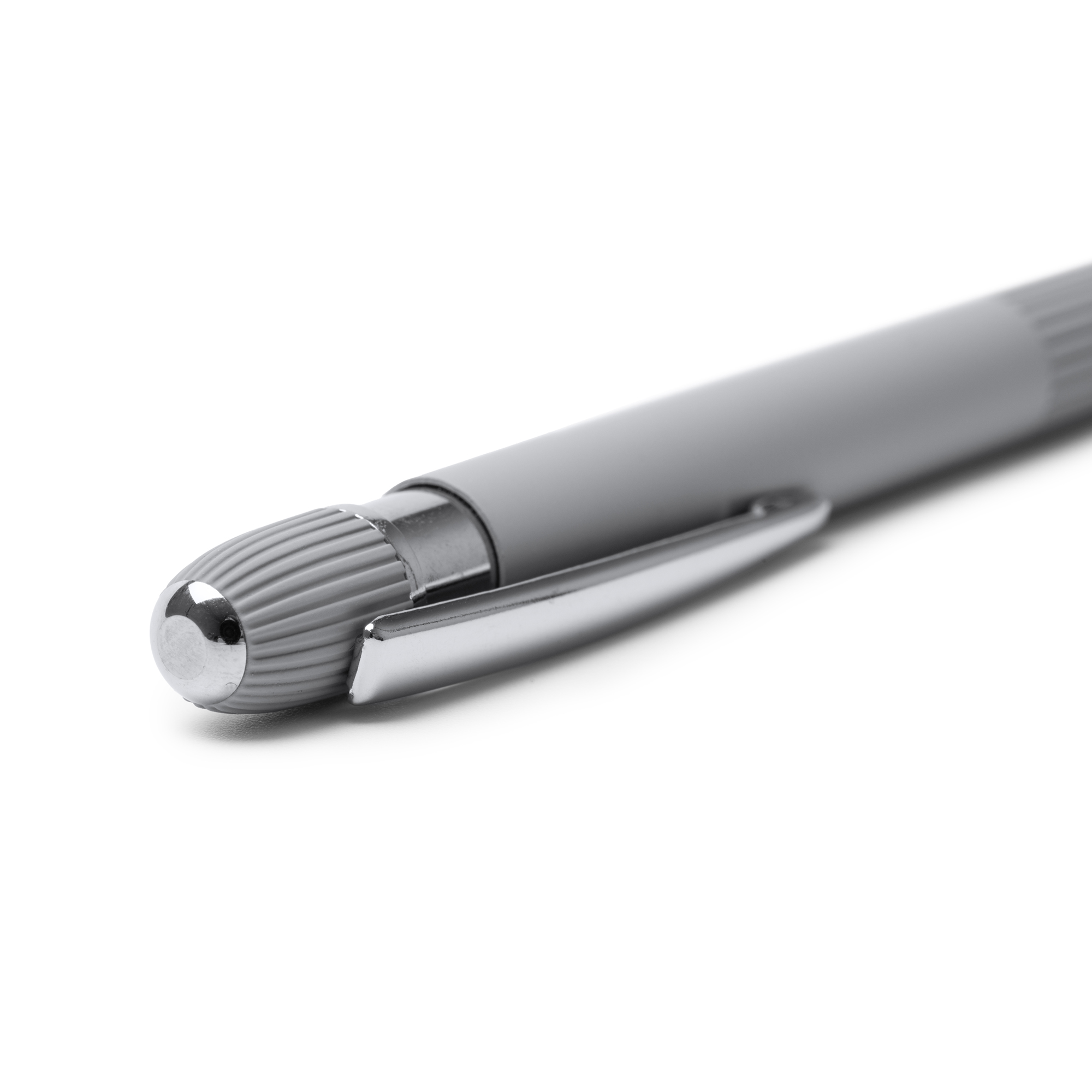 Stilou cu corp din aluminiu reciclat, cu mâner cu dungi și finisaj tactil din cauciuc mat. Detalii cu finisaj cromat. Rezervă de cerneală Jumbo albastră.