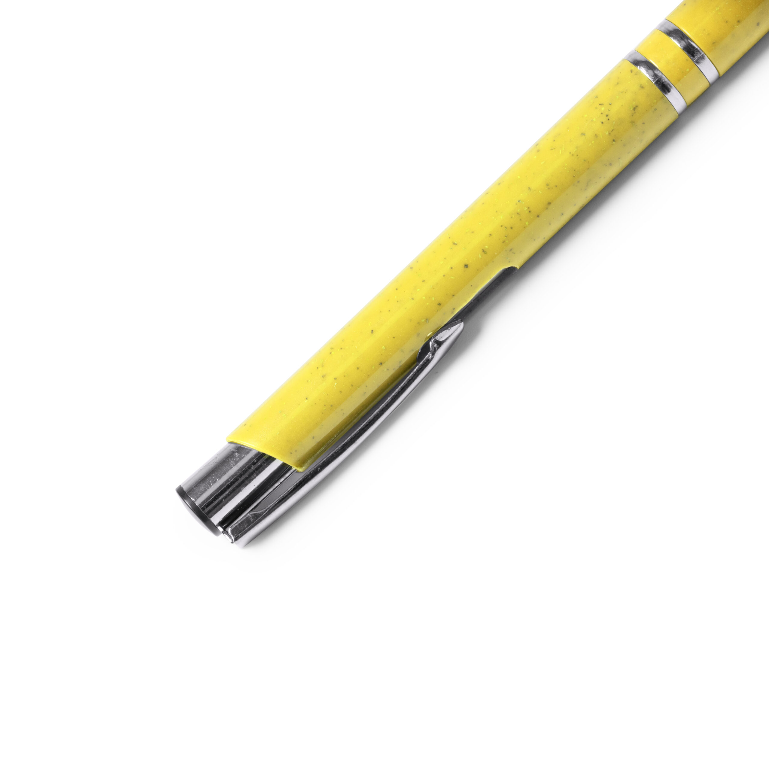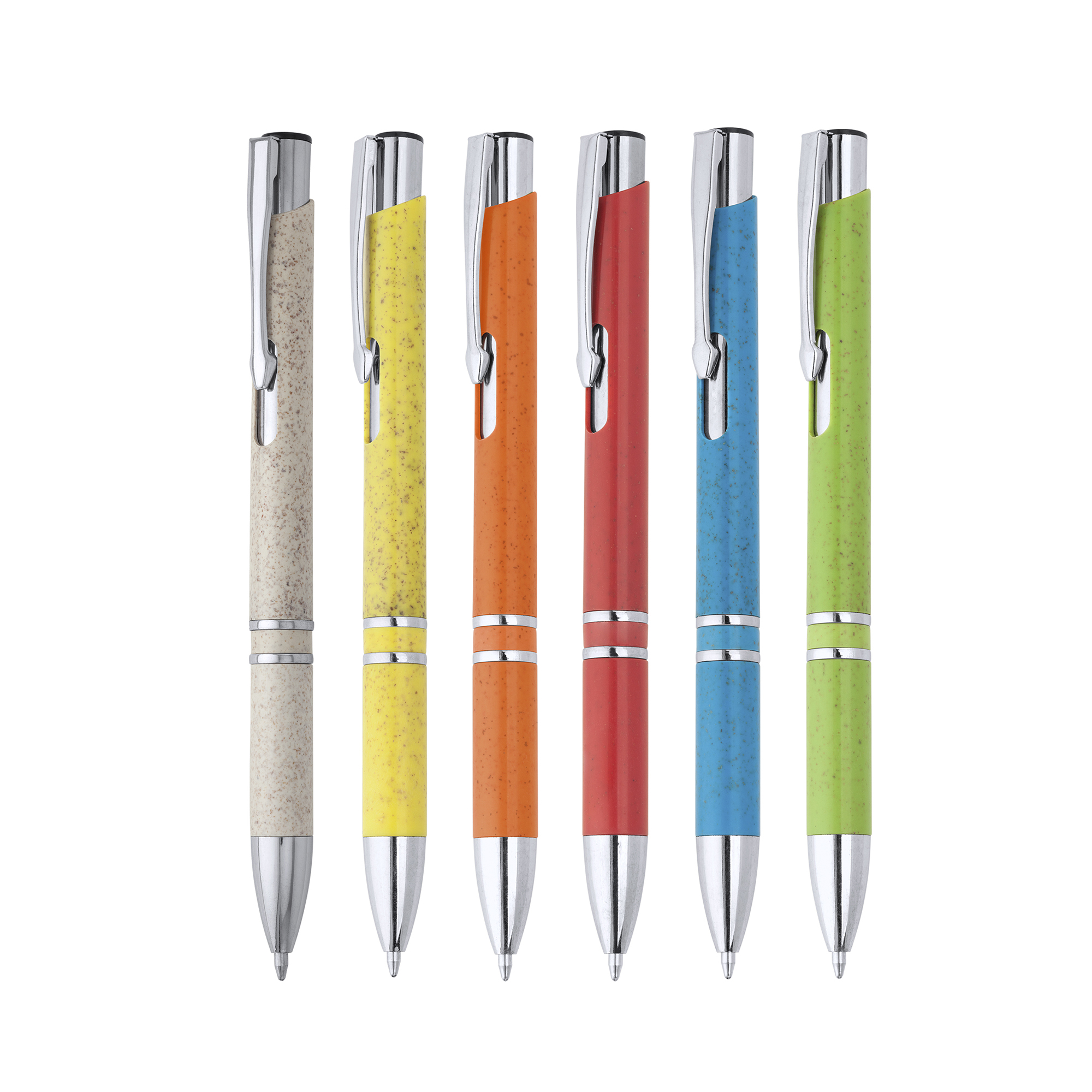 Pix din fibră de grâu și ABS cu elemente gri metalizat. Mecanism acționat prin apăsare. Cerneală albastră, reumplere jumbo.
