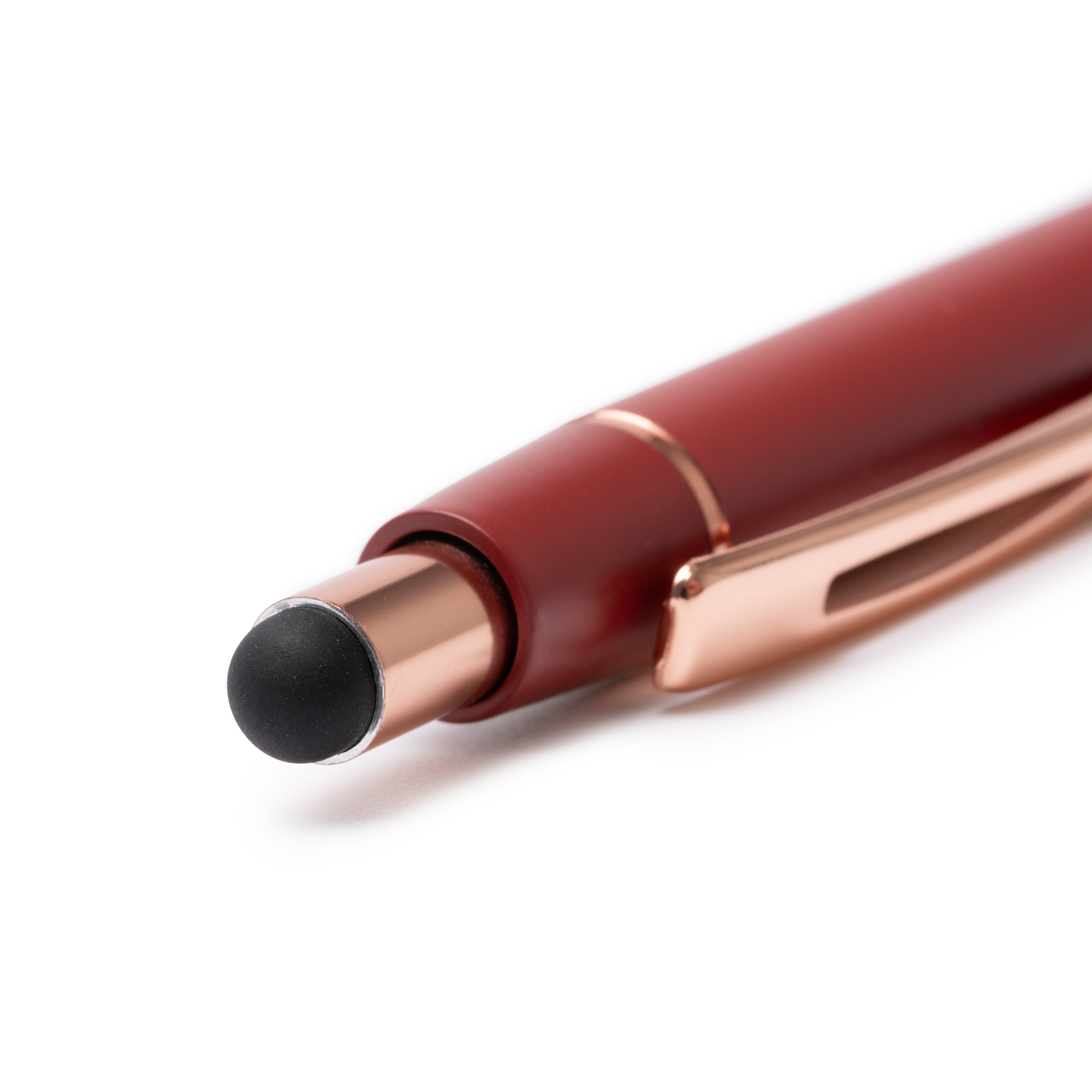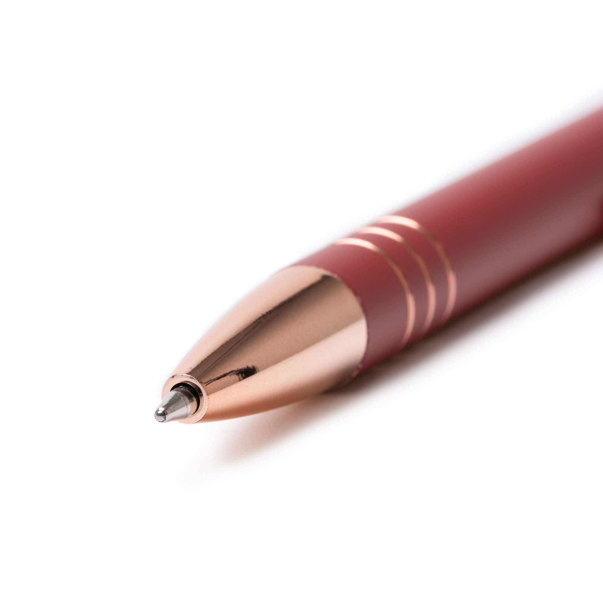 Stilou cu buton cu corp metalic mat și detalii din cupru. Atingeți indicatorul de pe buton. Rezervă de cerneală Jumbo albastră.
