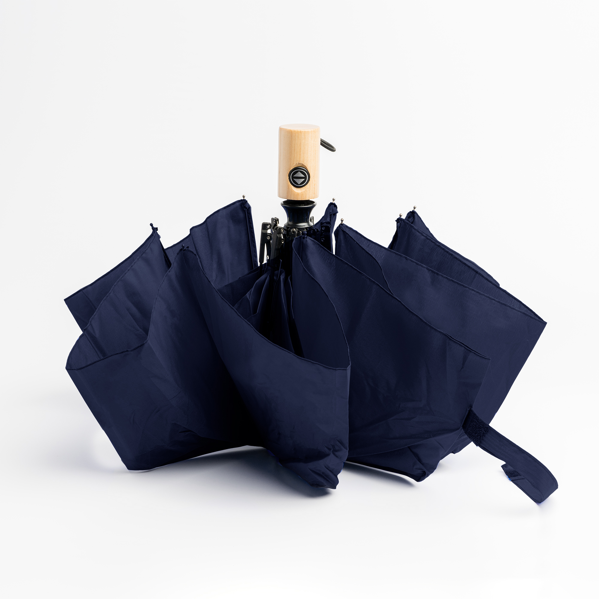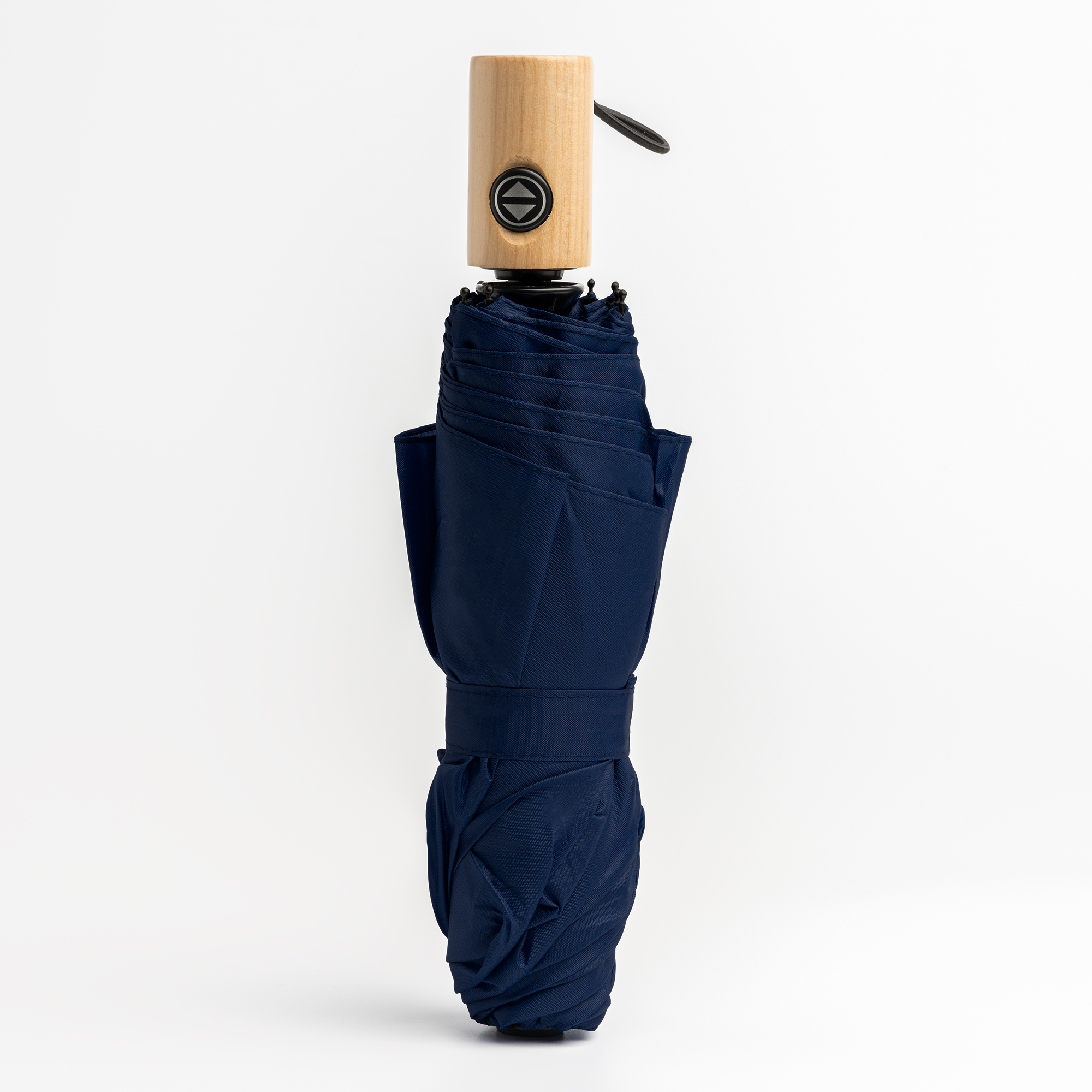 Umbrelă auto deschis-închis în pongee 190T cu husă asortată. Spițe și vârfuri negre cu mâner din bambus. Fixare tip velcro asortată.