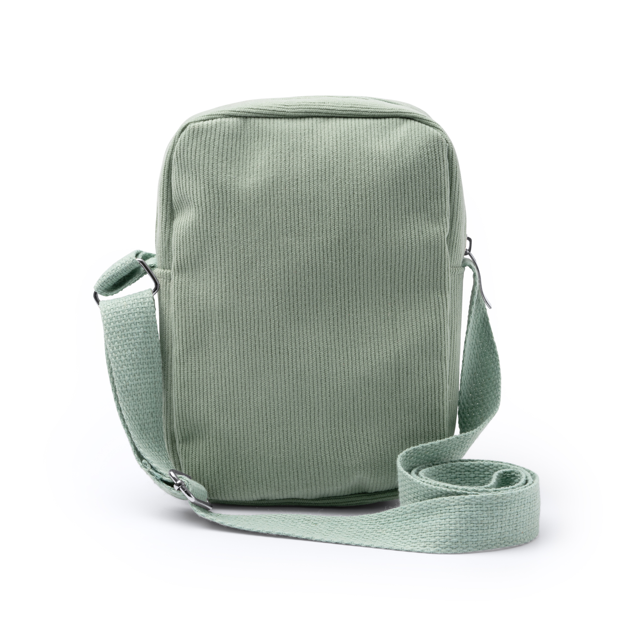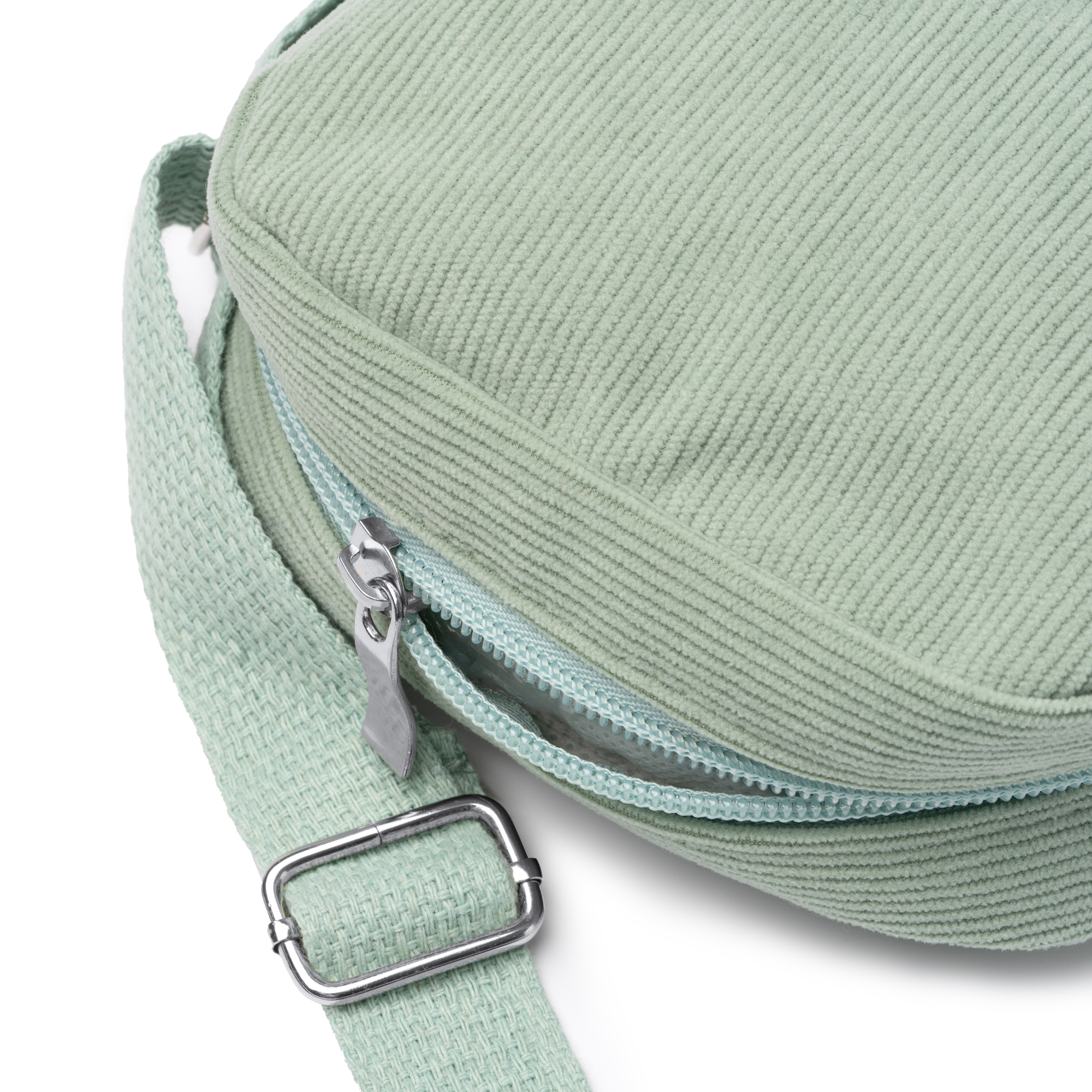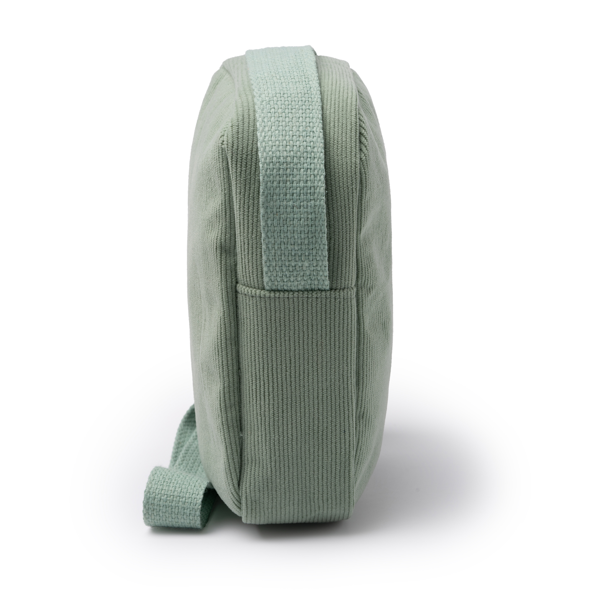Geantă de umăr din material catifelat cu închidere cu fermoar și curea reglabilă asortată.