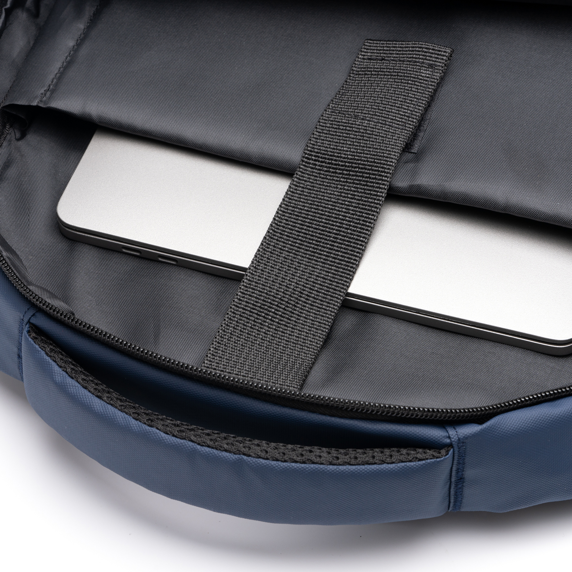 Rucsac din piele PU. Compartiment principal cu buzunar interior căptușit pentru laptop de 15”. Buzunar frontal. Partea din spate și bretelele sunt căptușite.
