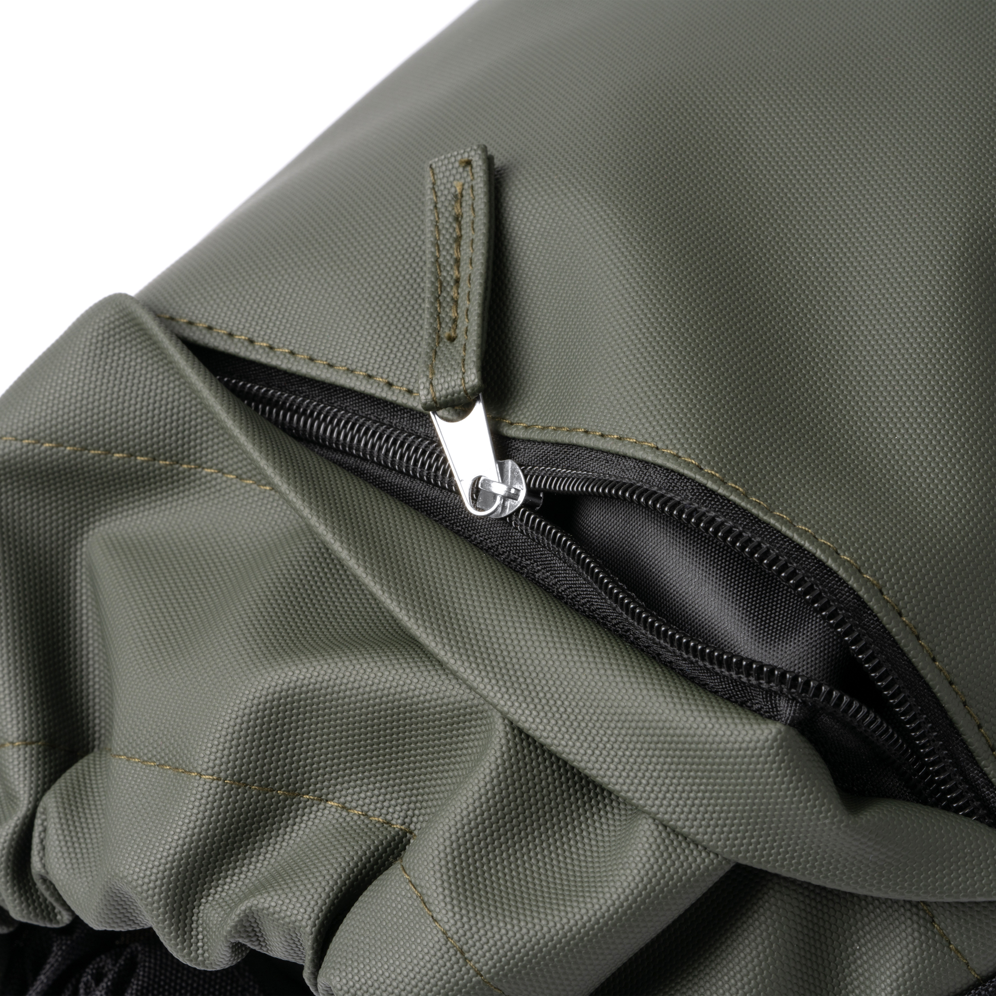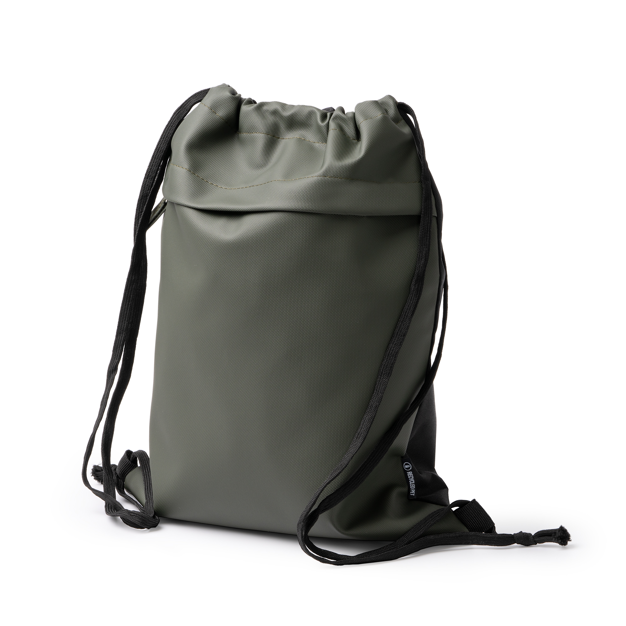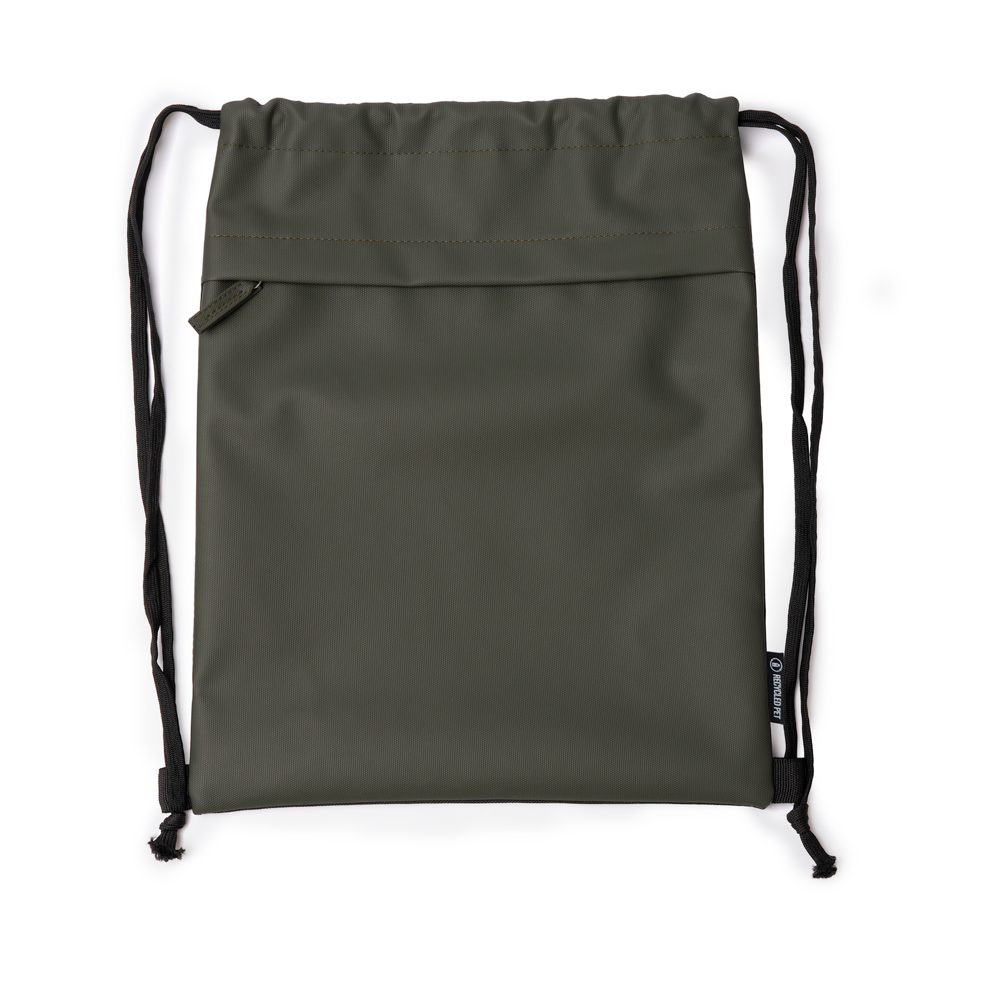 Rucsac cu șnur din RPET. Buzunar frontal practic cu închidere cu fermoar.