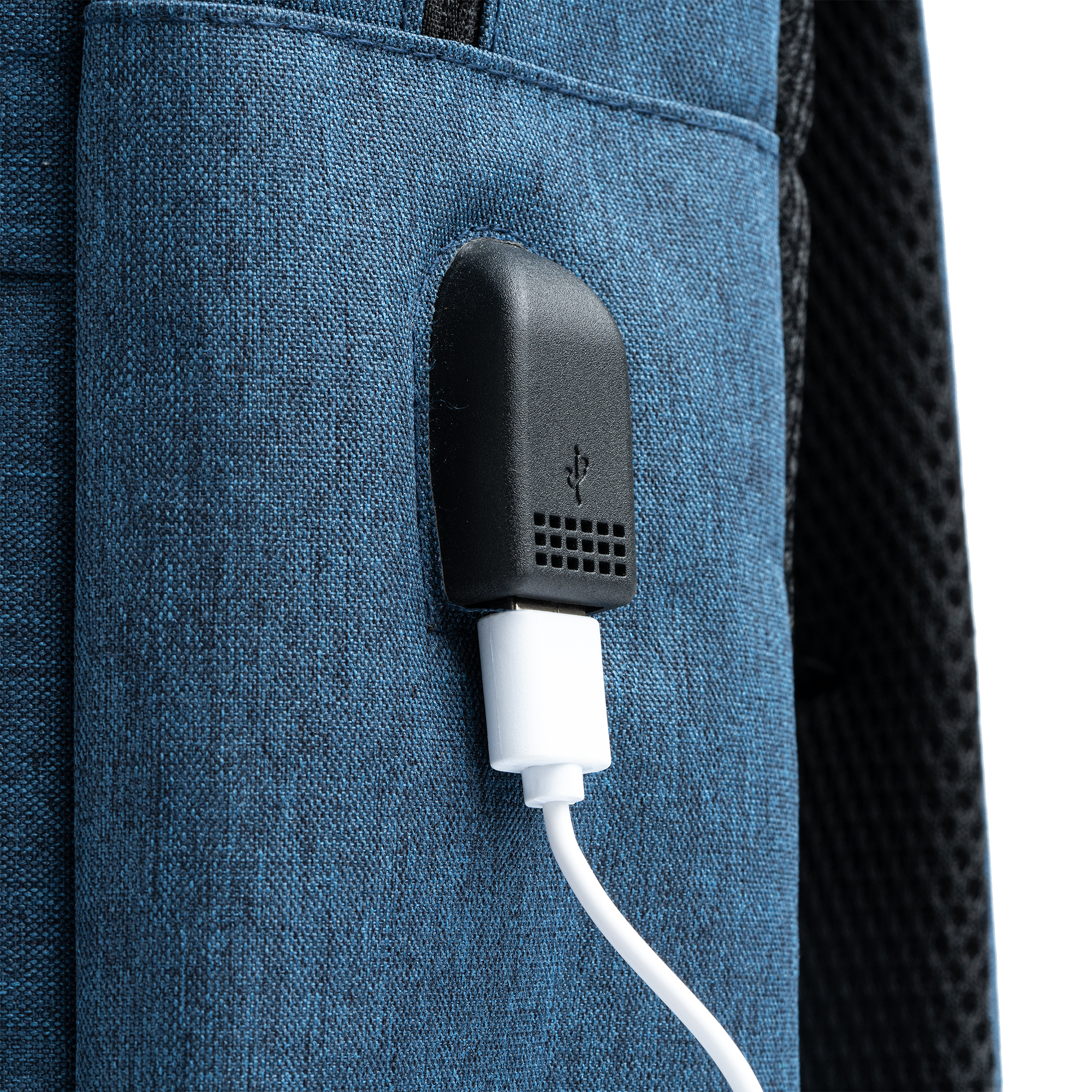 Rucsac din poliester RPET 600D cu finisaj din stofă. Buzunar principal căptușit, ideal pentru laptop sau tabletă. Port USB încorporat, inclus pentru conectarea blocului de alimentare (nu este inclus). Buzunare frontale și laterale. Bretele pentru umăr și spate căptușite.