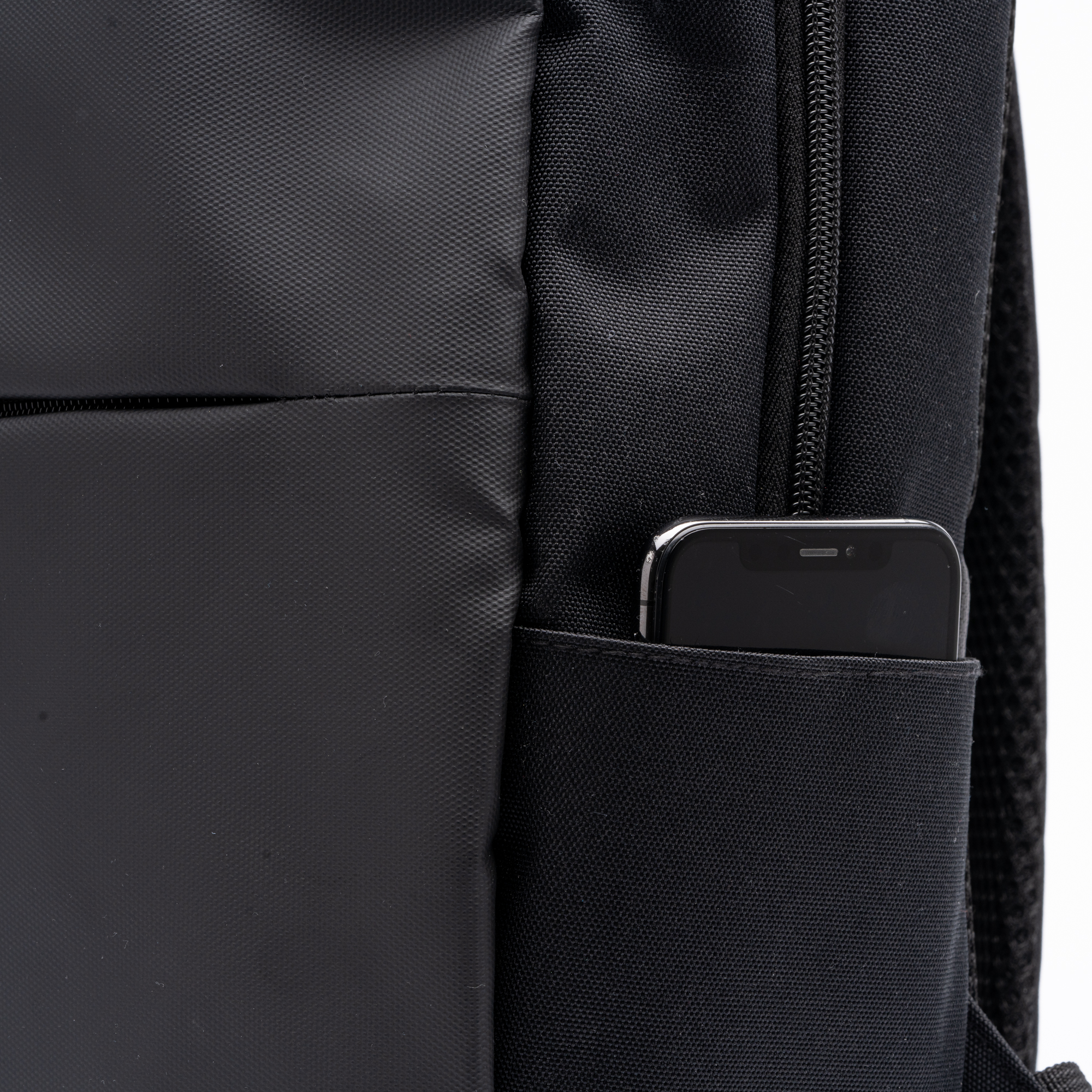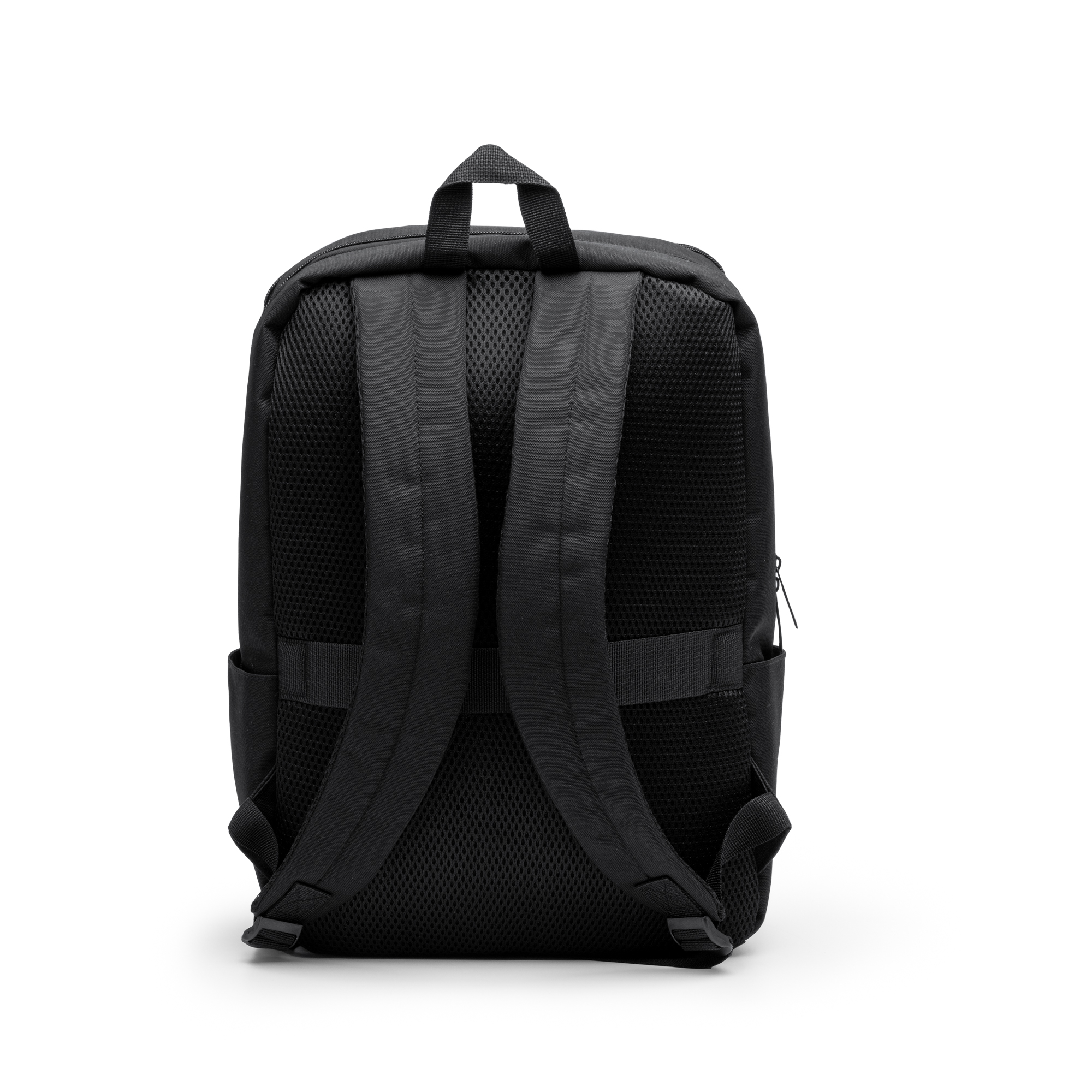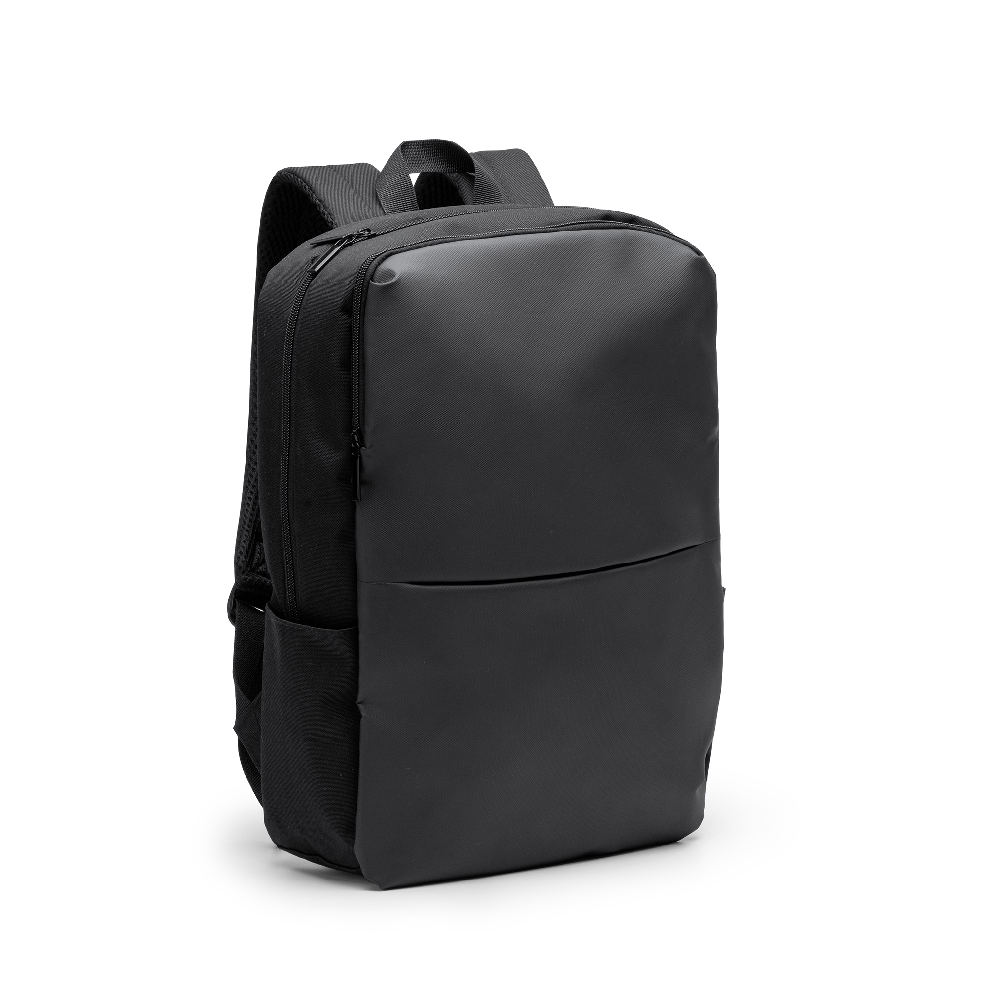 Rucsac din piele PU și poliester 600D RPET. Compartiment principal cu buzunar interior căptușit pentru laptop de 15”. Buzunar frontal. Partea din spate și bretelele sunt căptușite.