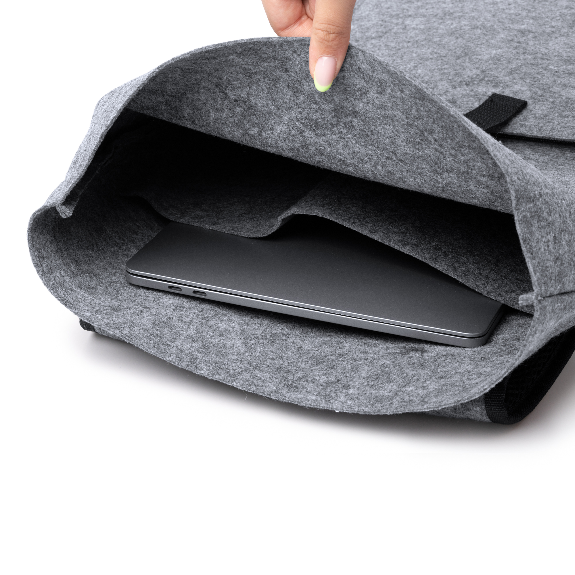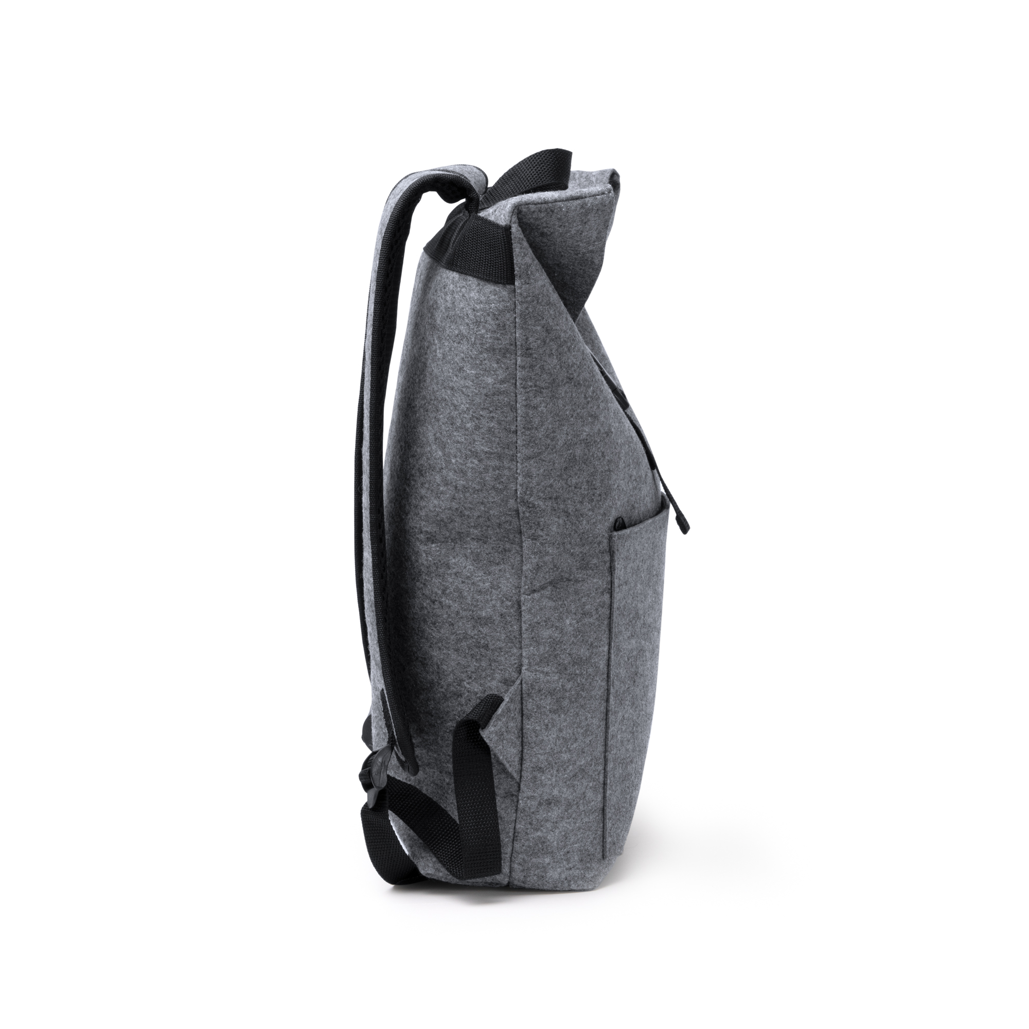 Rucsac din pâslă reciclată cu clapetă. Dispune de carabină pentru închiderea compartimentului principal, buzunar frontal pentru depozitarea obiectelor mici și mânere reglabile.