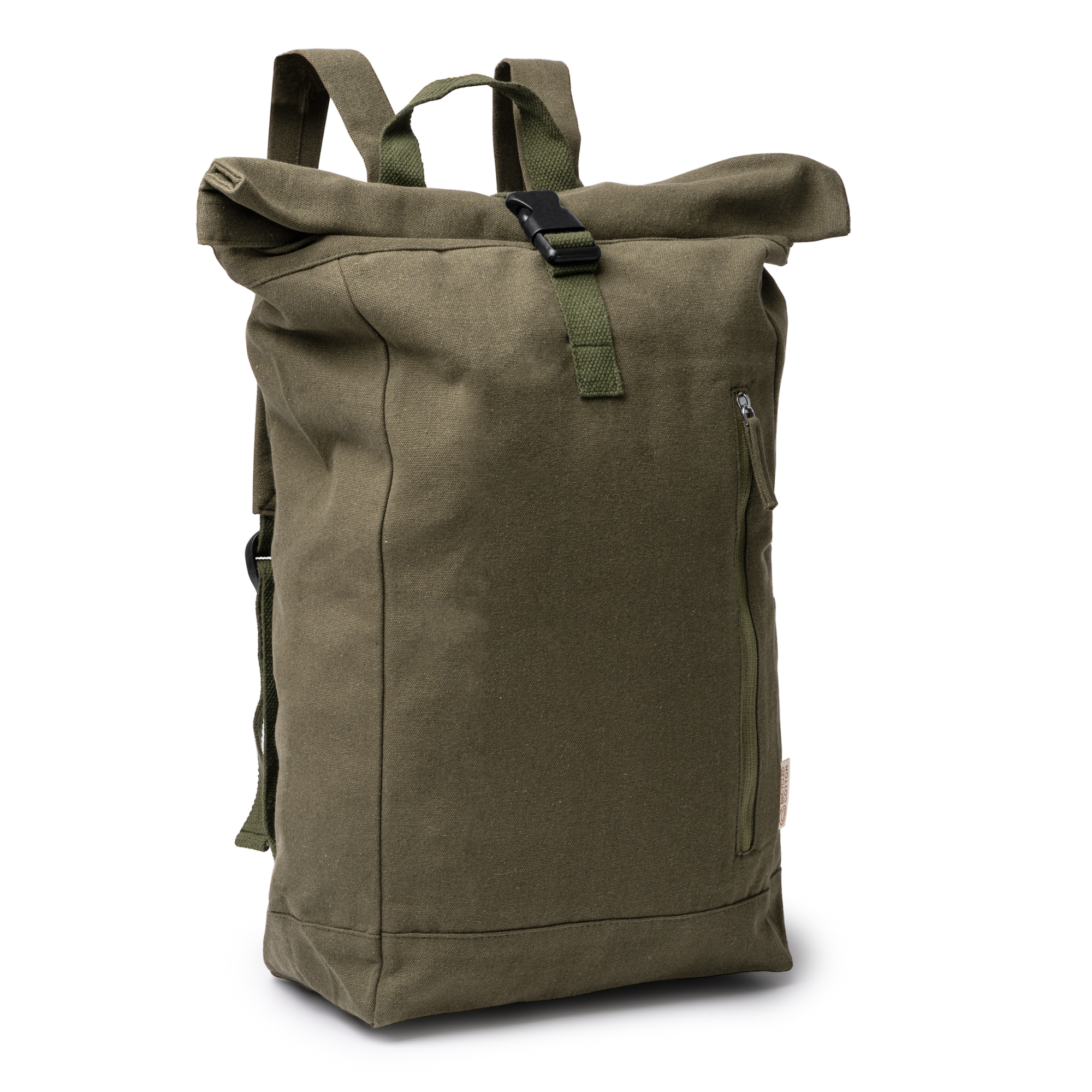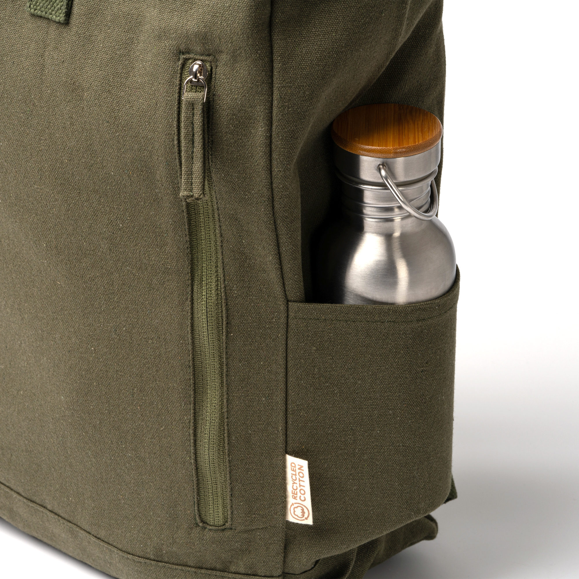 Rucsac din bumbac reciclat de 370 g/m². Compartiment principal mare cu deschidere extensibilă cu fermoar și dispozitiv de reglare. Buzunar frontal cu închidere cu fermoar și buzunar lateral. Capacitate: 25L
