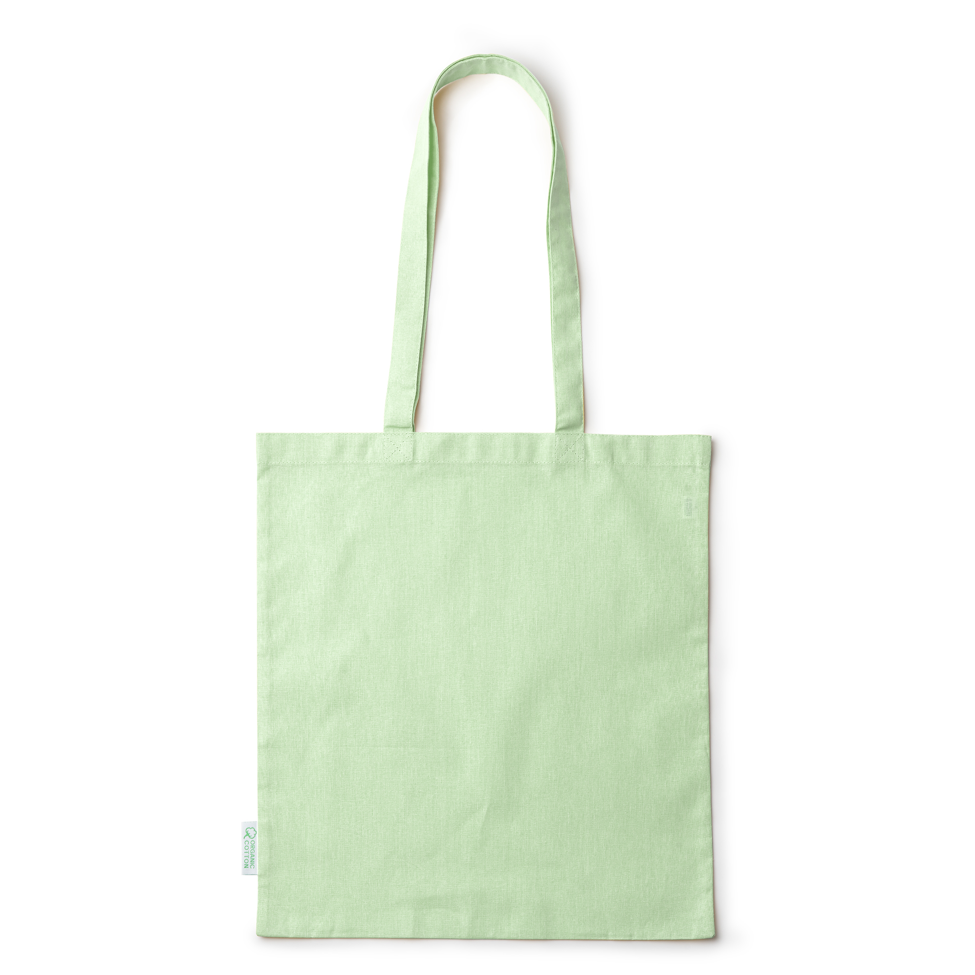 Geantă din bumbac 100% organic (140 g/mp), cu mânere lungi ranforsate de 70 cm.