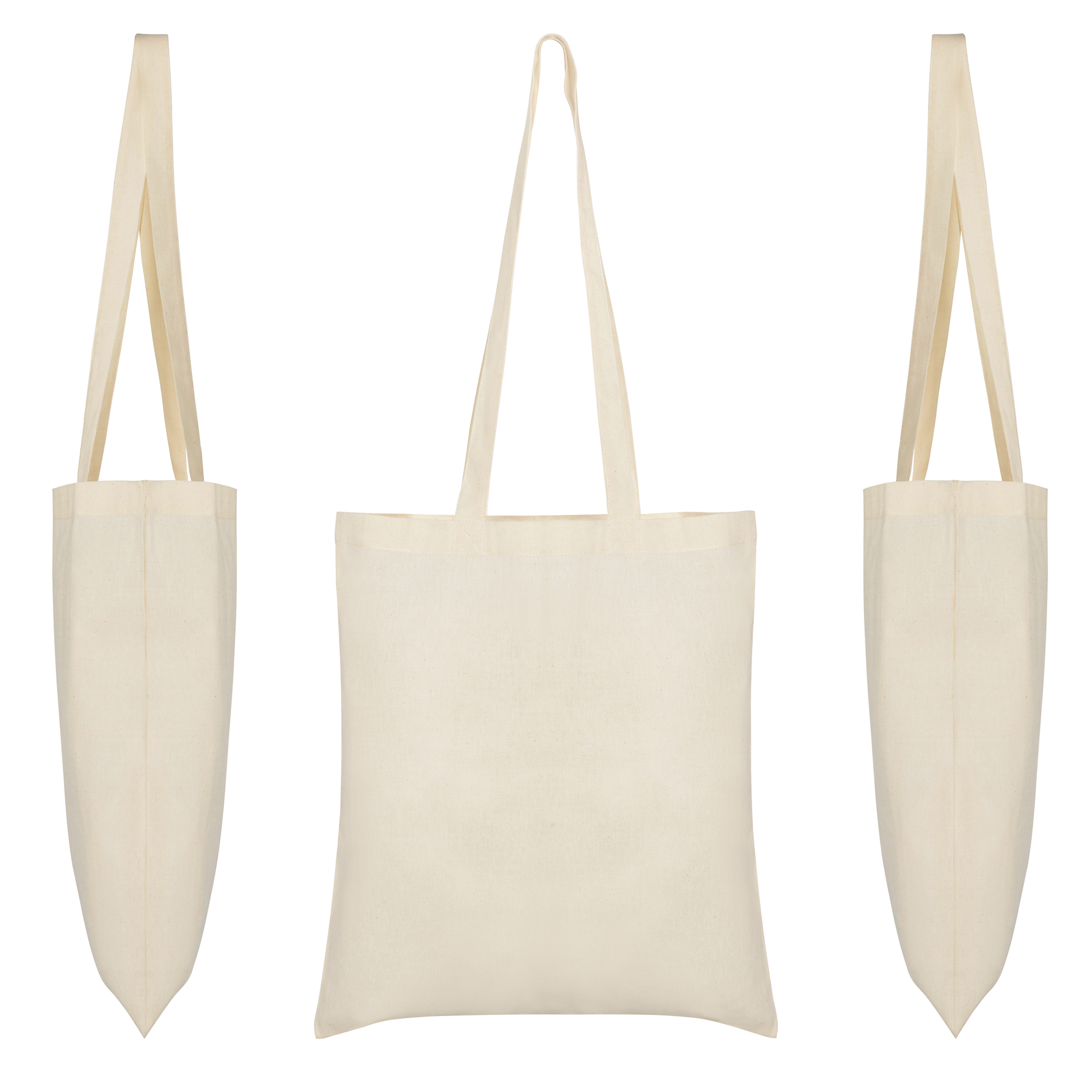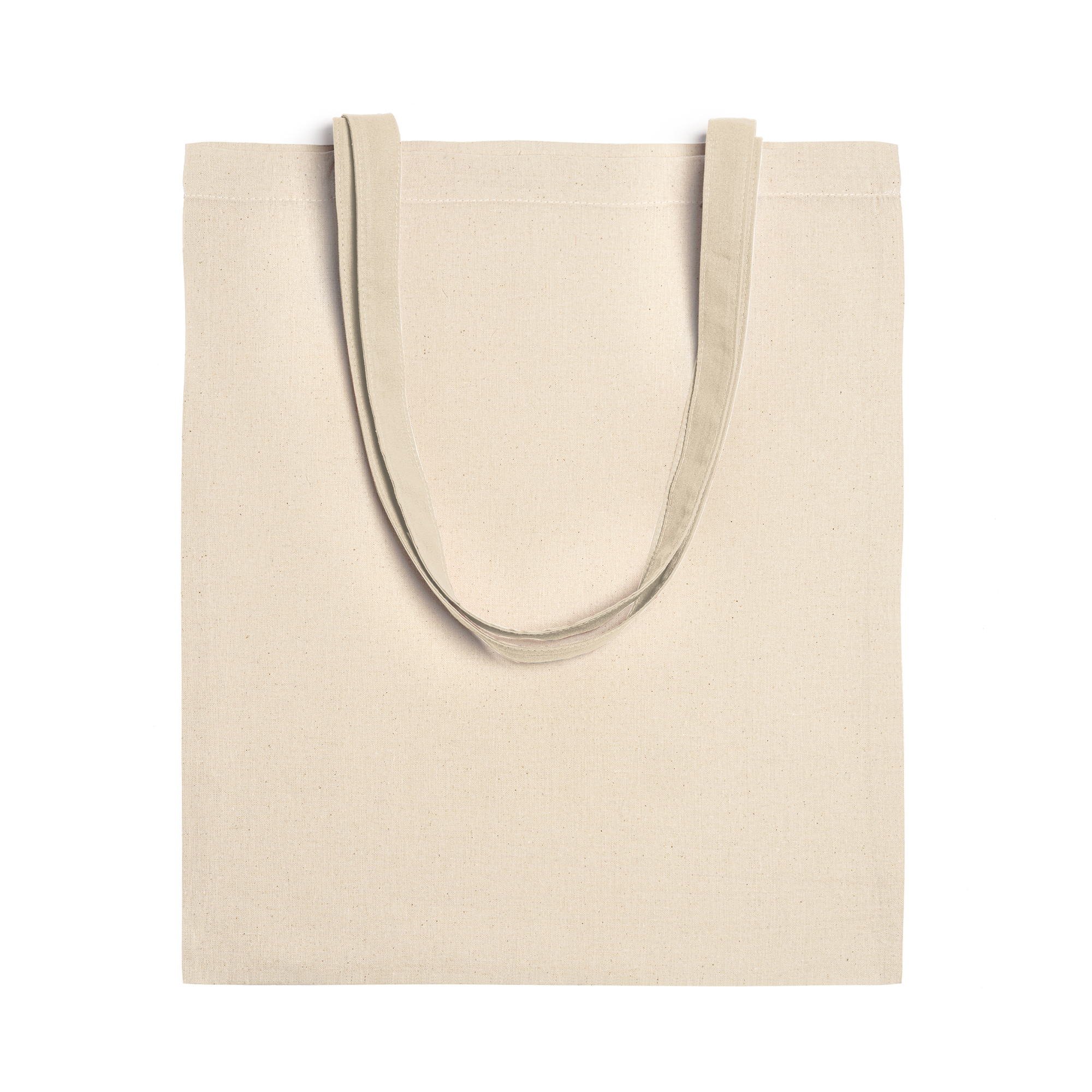 Sacoșă din bumbac în culoare naturală, cu mâner lung din bandă de aceeași culoare. 140 gsm.