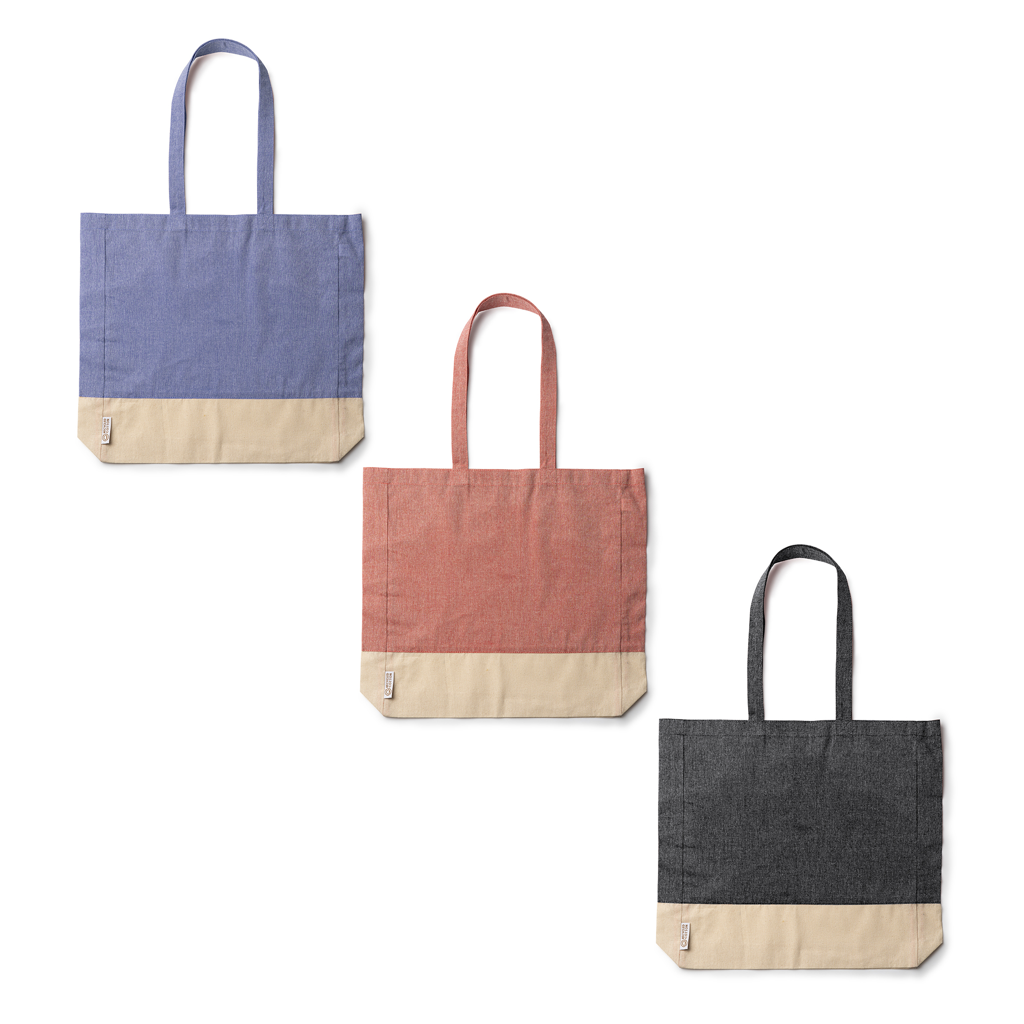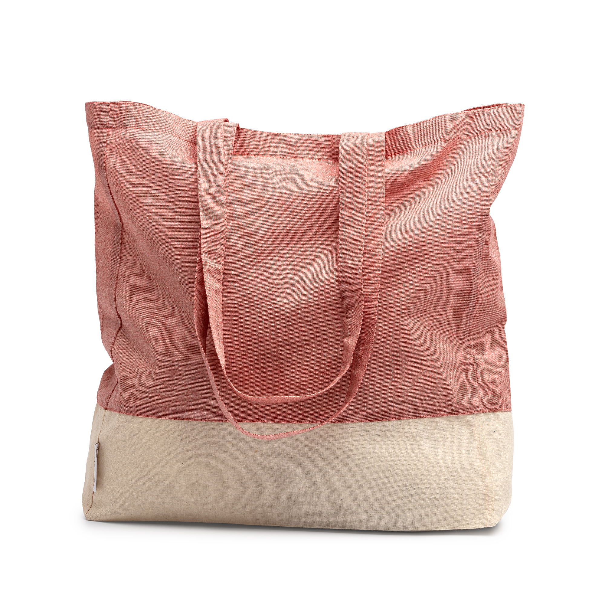 Geantă din bumbac reciclat cu finisaj din țesătură și bumbac natural de 120 g/mp cu îmbinare. Mânere întărite de 70 cm lungime.